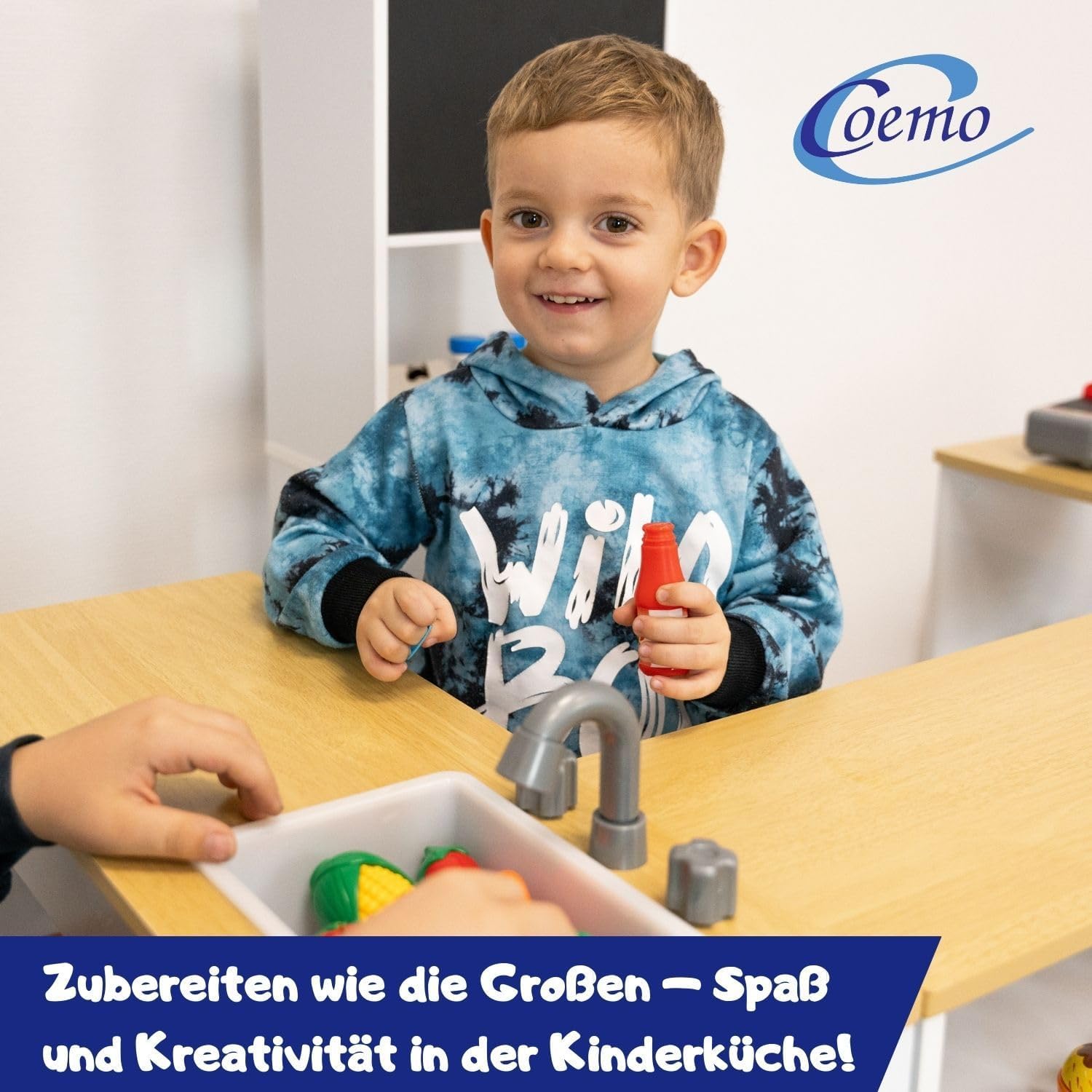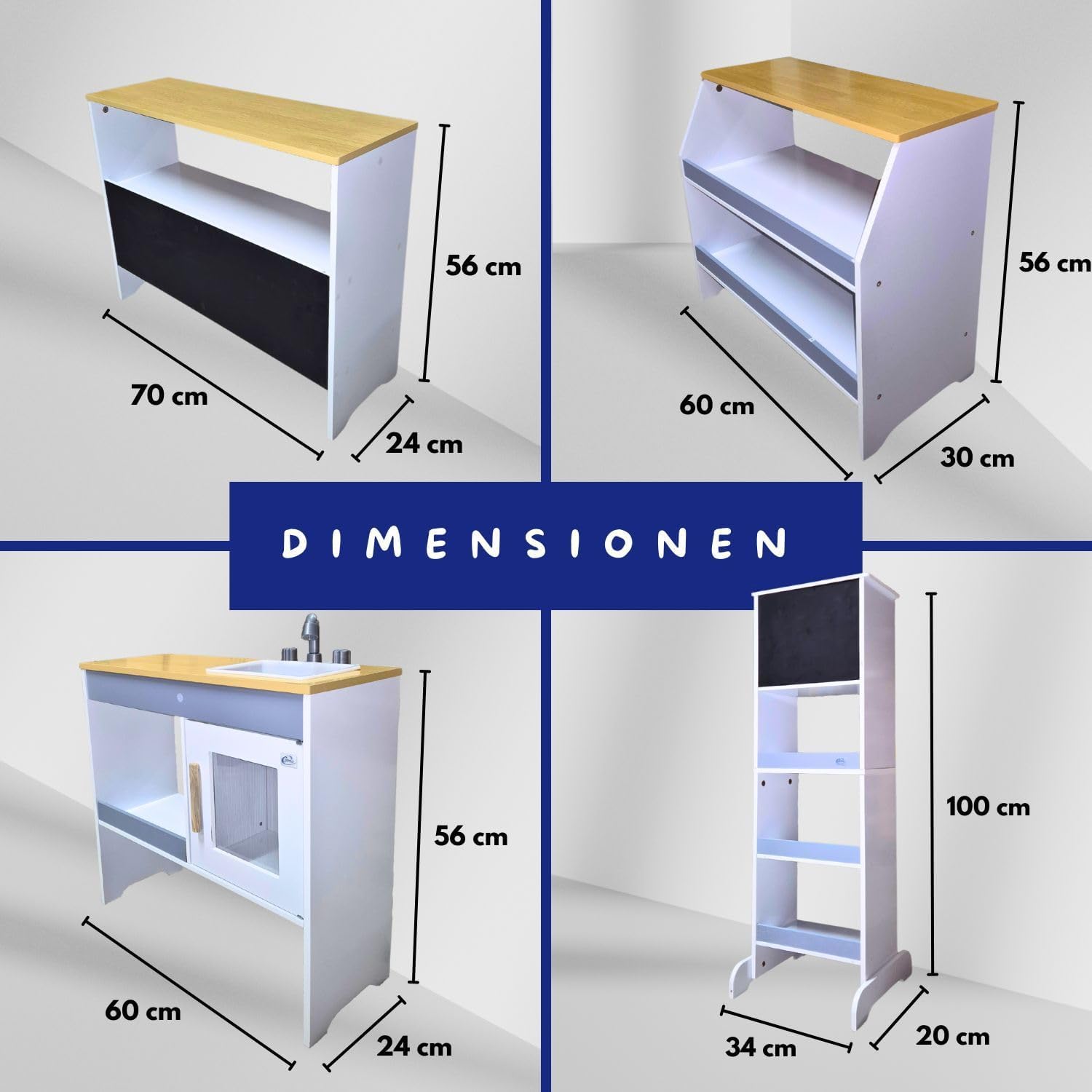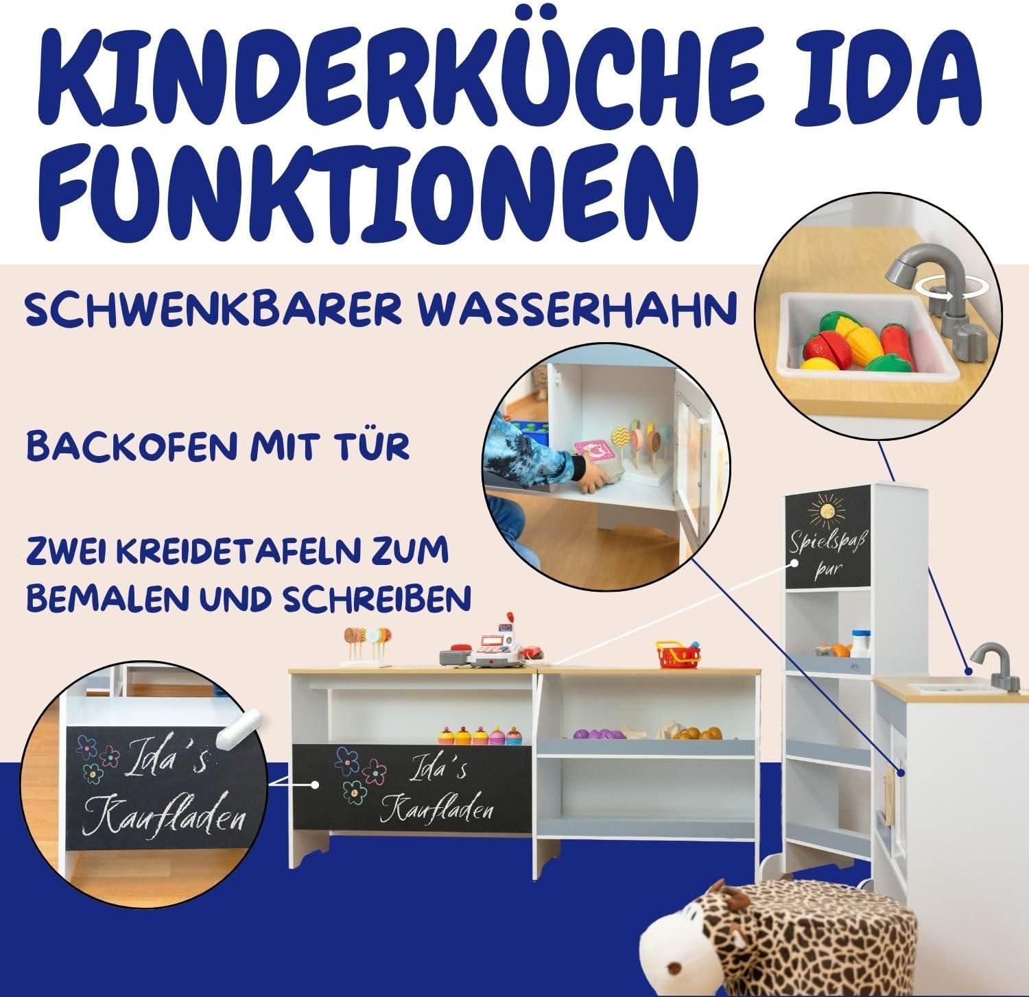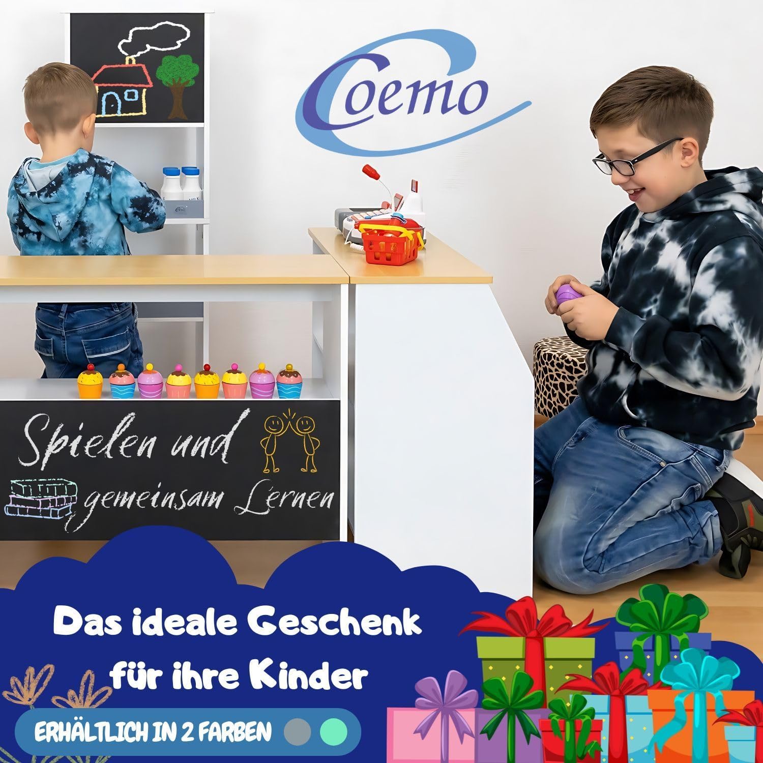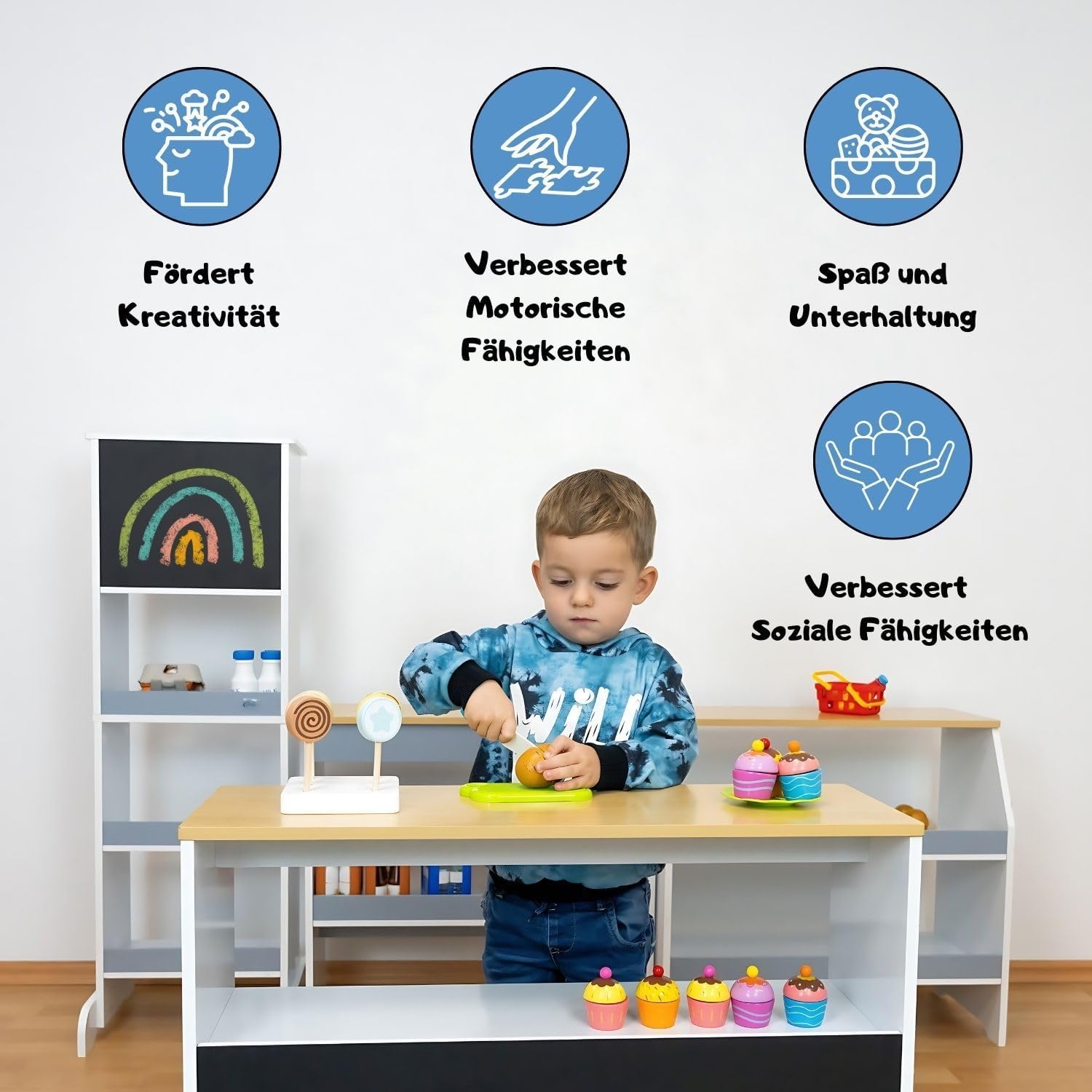Divertimento per i bambini: Ida shop offre un'esperienza di gioco realistica. Promuove l'immaginazione e le capacità motorie. Negozio di alimentari con accessori. La cucina può essere combinata con un registratore di cassa, soldi finti e altri giocattoli da supermercato. Negozio in legno: realizzata in legno robusto (MDF), la bancarella del mercato per bambini è durevole e stabile. Le superfici lisce e i colori resistenti alla saliva li rendono sicuri ed ecologici per i bambini. Valore aggiunto educativo: oltre al divertimento del gioco, il negozio supporta lo sviluppo delle abilità sociali. Le attività quotidiane come cucinare e pulire, così come gestire i soldi finti, incoraggiano i tuoi figli. Adattabile individualmente: il negozio per bambini può essere allestito e allestito individualmente con i suoi quattro elementi, in modo che il negozio con accessori possa essere adattato in modo flessibile a ogni cameretta. Opzioni di design creativo: supermercato, negozio di alimentari, stand di vendita. Con due aree realizzate in pellicola di lavagna, i bambini possono progettare in modo creativo liste della spesa e menu, che stimolano anche la creatività e favoriscono la scrittura.