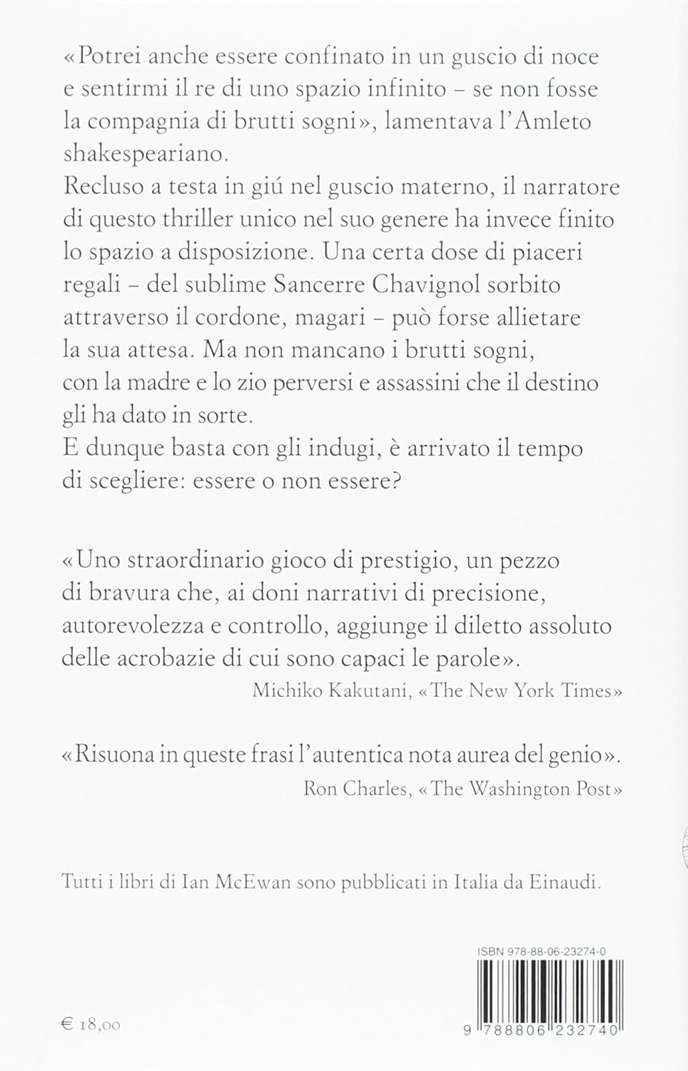 Ci sono gli scrittori (tanti) e poi ci sono gli scrittori geniali. McEwan rientra tra gli scrittori geniali, secondo me, ovviamente. Una vicenda di amore, morte, tradimenti, ripensamenti, paure e scoperte .. tutto narrato dal punto di vista del nascituro, ancora senza nome, che con lucidità assiste alle vicende pre-nascita che coinvolgono (sconvolgono) la sua futura famiglia, interrogandosi già su quelli che saranno poi i grandi temi della vita. I personaggi sono solo tre, Trudy la madre fedifraga del nascituro, Claude lo zio traditore e John il padre tradito .. intorno a loro ruota tutta la vicenda, di shakespeariana memoria, narrata dal quarto personaggio, il nascituro senza nome. Un libro breve, del quale non si può dire molto di più senza incorrere in terribili spoiler. Vale la pena leggerlo, lo stile di McEwan è inconfondibile, ammiccante e coinvolgente. Una prosa perfetta e anche ben tradotta. Una perla, come solo McEwan può regalarci.
