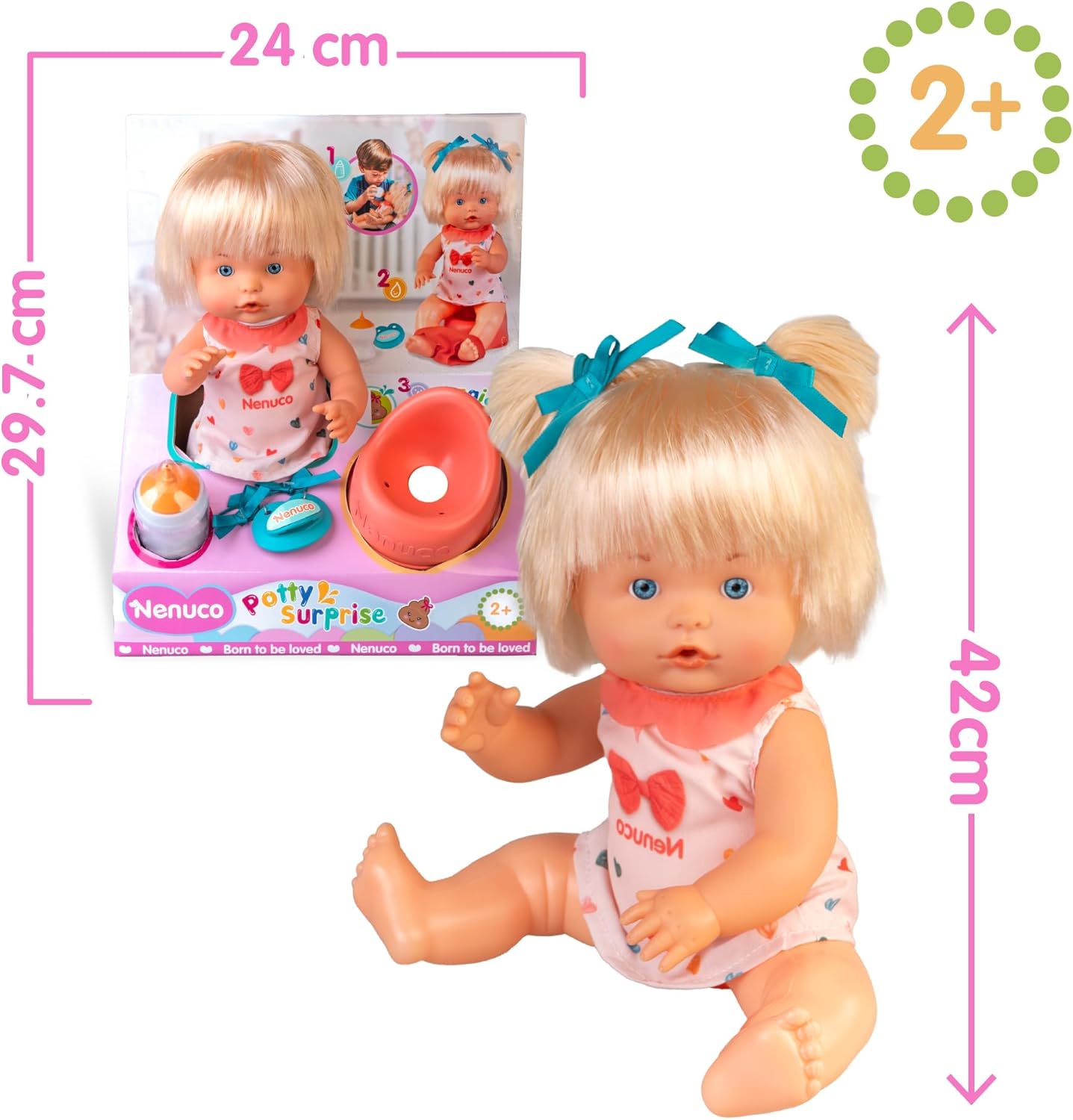 Questa bambola Nenuco da 25 cm con capelli biondi e corpo rigido è pensata per le bambine che amano prendersi cura e acconciare le proprie bambole. Include fiocchi per creare adorabili codini; Insegna a Nenuco a fare pipì nel vasino. Basta dargli il biberon con l'acqua, metterlo sul vasino e scoprire una sorpresa inaspettata: sembra che abbia anche fatto la popò! Stimola l'apprendimento e il divertimento imitando le attività quotidiane, aiutando i più piccoli a sviluppare capacità di cura. Nenuco è dotata di biberon, ciuccio e fiocchi, consentendo ai bambini di ricreare molteplici scene e prendersi cura della propria bambola in modo creativo. Questo Nenuco invita i bambini a immaginare, giocare e imparare mentre mettono in pratica le routine quotidiane, rendendo l'apprendimento un'esperienza divertente e istruttiva.