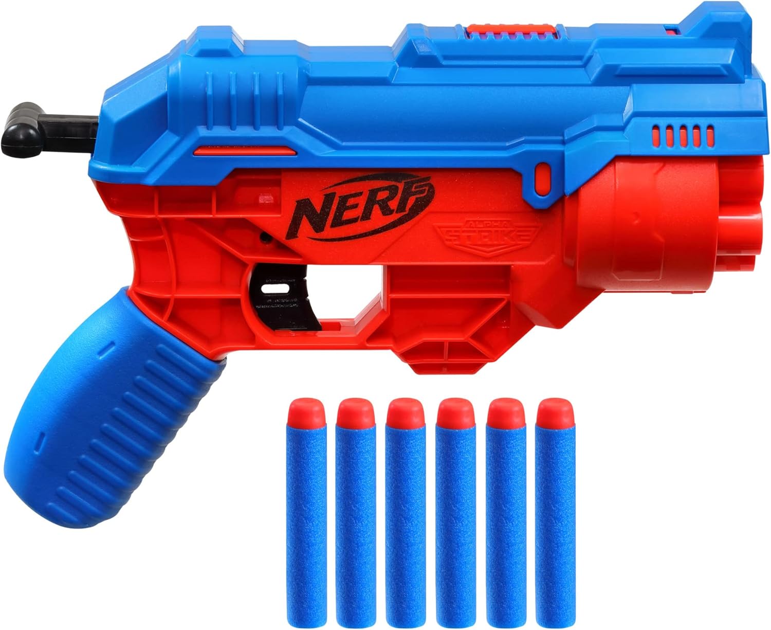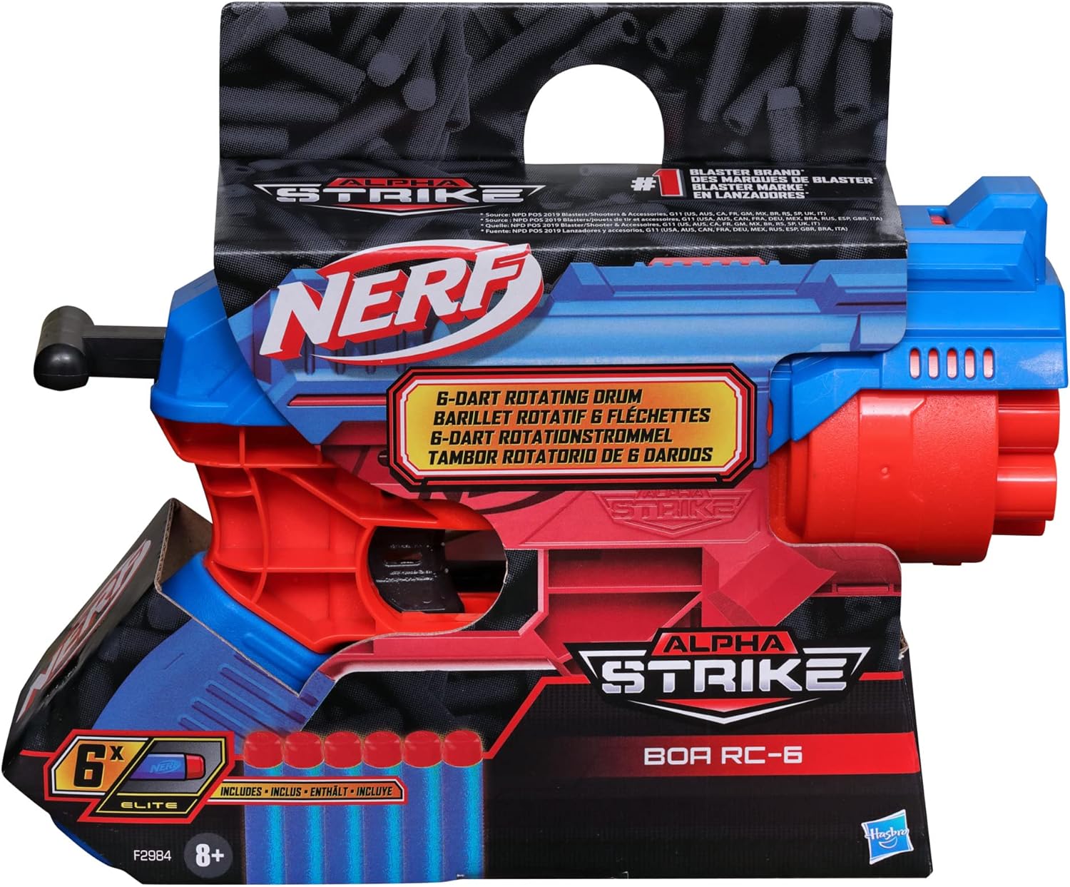 BOA RC-6 CON TAMBURO ROTANTE 6-DARD: Fuoco 6 freccette di fila dal blaster Nerf Alpha Strike Boa RC-6 che presenta un tamburo rotante a 6 freccette Include 6 freccette ufficiali NERF ELITE: include 6 freccette ufficiali in schiuma Nerf Elite, ideali per giochi interni ed esterni, testati e approvati per prestazioni e qualità 6-DART TARGET BLASTING: caricare 6 freccette nel blaster, quindi tirare la maniglia per innescare il blaster e premere il grilletto per sparare (non sono necessarie batterie) Inizia a soffiare con le vesciche NERF ALPHA STRIKE: i blaster Alpha Strike sono un ottimo modo per iniziare a sperimentare la potenza, le prestazioni e l'eccitazione di Nerf, il marchio di blaster numero uno*