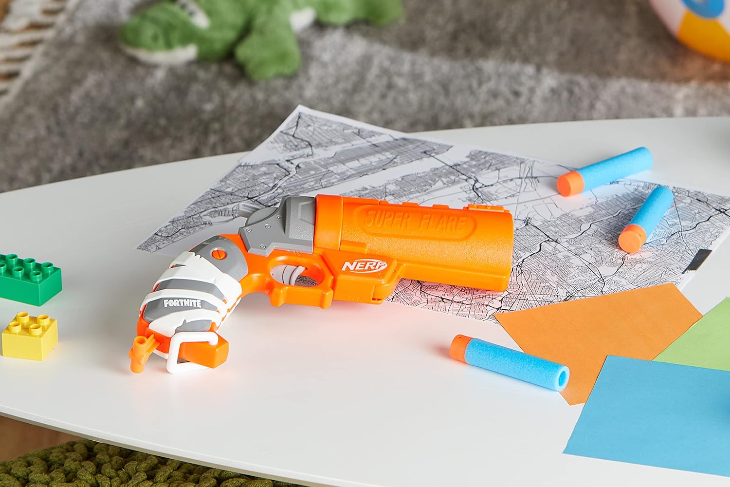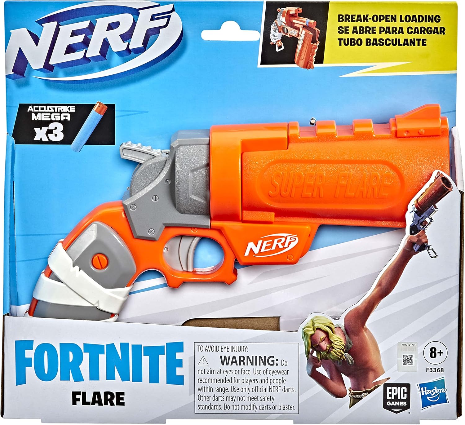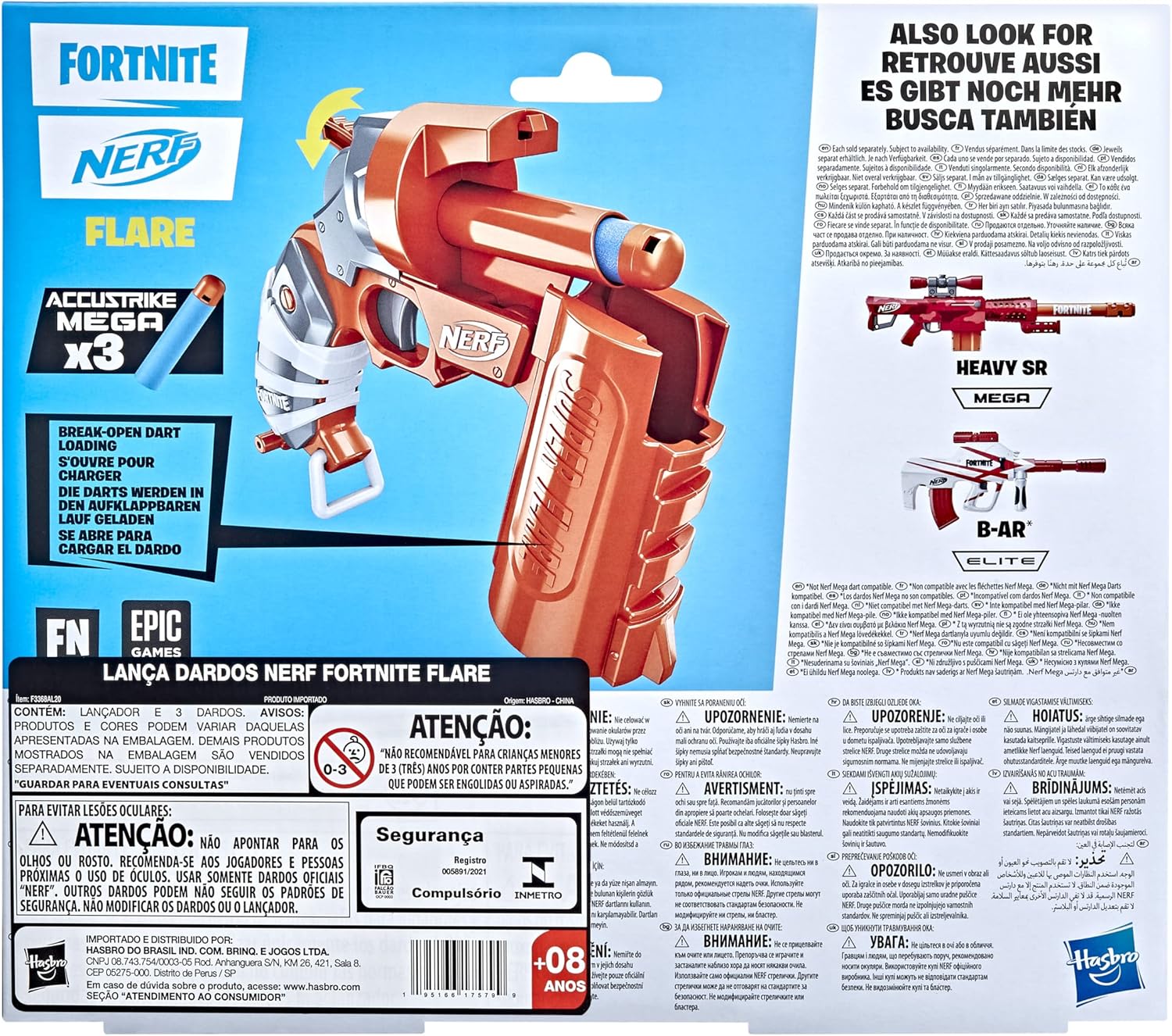 REPLICA DEL BLASTER LANCIA-DARDI DI FORTNITE: il blaster Nerf Fortnite Flare è ispirato al blaster usato in Fortnite e riproduce l'aspetto e i colori di quello del famoso videogioco CARICAMENTO DEI DARDI AD APERTURA COMPLETA: la parte anteriore del blaster si apre per consentirti di accedere alla camera e caricarvi 1 dardo all'interno. Chiudi il blaster e preparati alla battaglia ABBASSA L'IMPUGNATURA DI ARMAMENTO: abbassa l'impugnatura per armare il blaster, poi premi il grilletto per lanciare un dardo sul bersaglio CONTIENE 3 DARDI NERF ACCUSTRIKE MEGA: include 3 dardi originali Nerf AccuStrike Mega in gommapiuma progettati per la massima precisione