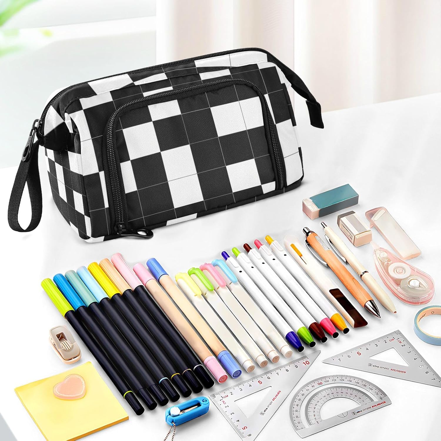 Materiale di lunga durata: realizzato in tessuto di nylon resistente, cerniera forte e resistente. Più robusto, leggero, resistente ai graffi, facile da pulire. (Non adatto a bambini di età inferiore ai 3 anni!) Grande capacità: misura 24 x 9,5 x 15 cm. Gli astucci possono facilmente contenere 40-60 penne o matite nel suo ampio scomparto, fornendo abbastanza spazio per i tuoi oggetti essenziali di cancelleria. Due tasche interne sono spazio per le piccole necessità quotidiane o materiale scolastico, come carte, contanti, chiavi, gomme, nastri, foglietti adesivi per trovarli facilmente e rapidamente. Design portatile e pratico: con funzionalità leggere e un'ampia fascia da tenere in mano, l'organizer può essere messo facilmente nello zaino o tenuto in mano senza sforzo. L'apertura superiore e laterale aggiunge più comodità nella tua vita. Puoi controllare o prendere la tua cancelleria molto chiaramente dall'alto e raccogliere le tue matite preferite dagli slot fissi laterali. Multi funzioni: il nostro prodotto non è per la scuola e l'ufficio, ma anche per cosmetici e altre piccole necessità. L'astuccio scolastico può essere utilizzato come astuccio per pennelli per gli amanti della pittura, borsa per il trucco per donne, borsa per medicine per la famiglia, borsa 3C per prodotti elettronici, borsa da viaggio per te stesso. Materiale lavabile: l'intero astuccio è lavabile. Il modo corretto di lavare è a mano; il lavaggio in lavatrice non è supportato. Non aggiungere candeggina durante la pulizia.