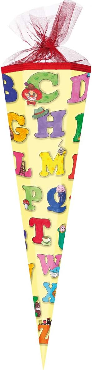 Nestler Set di sacchetti per la scuola da riempire, realizzati a mano, in cartone – motivo ABC, con protezione in pizzo, fiocco (85 cm, 6 rettangoli)