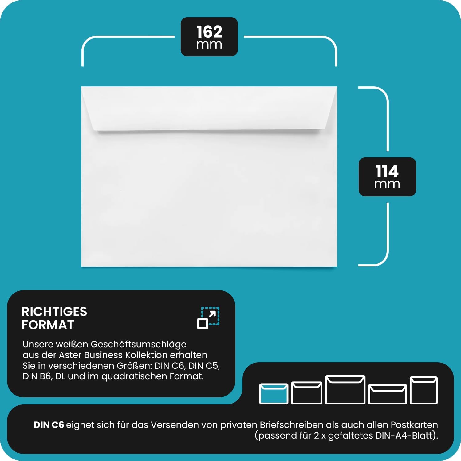 FORMATI BUSTE – Le nostre buste bianche della collezione Aster Business sono disponibili sono disponibili in diverse misure: C6, C5, B6, lunghe e quadrate. Le buste C6 possono contenere una pagina A5 piegata a metà o una A4 piegata due volte (piccoli programmi o pieghevoli). SEMPLICI ED ELEGANTI – Le nostre buste commerciali Aster Business sono fatte di carta di pregio bianca da 120 g. Sono caratterizzate da una striscia protettiva sulla patta dritta e non hanno la finestra. Sono scrivibile con qualsiasi penna. Offrono un'immagine professionale ed elegante. PER IL VOSTRO BUSINESS – Le buste commerciali sono uno strumento fondamentale per la vostra comunicazione aziendale. Sono ideali sia per comunicazioni ufficiali che per attività di promozione della vostra azienda. Possono essere stampate con il vostro logo e i vostri recapiti aziendali. UTILIZZO UNIVERSALE – Le buste Aster Business sono adatte non solo per l'invio di documenti importanti come fatture, candidature, prospetti aziendali, estratti conto o documenti contrattuali. Sono perfetti per qualsiasi tipo di invio, come anche per biglietti d'auguri, promozioni o inviti. CONSEGNA – 100 buste in formato C6 (114x162mm) senza finestra, lembo dritto con strisce adesiva; realizzate in carta bianca opaca da 120g/m². Sono scrivibili e stampabili (adatte a stampanti inkjet e laser).