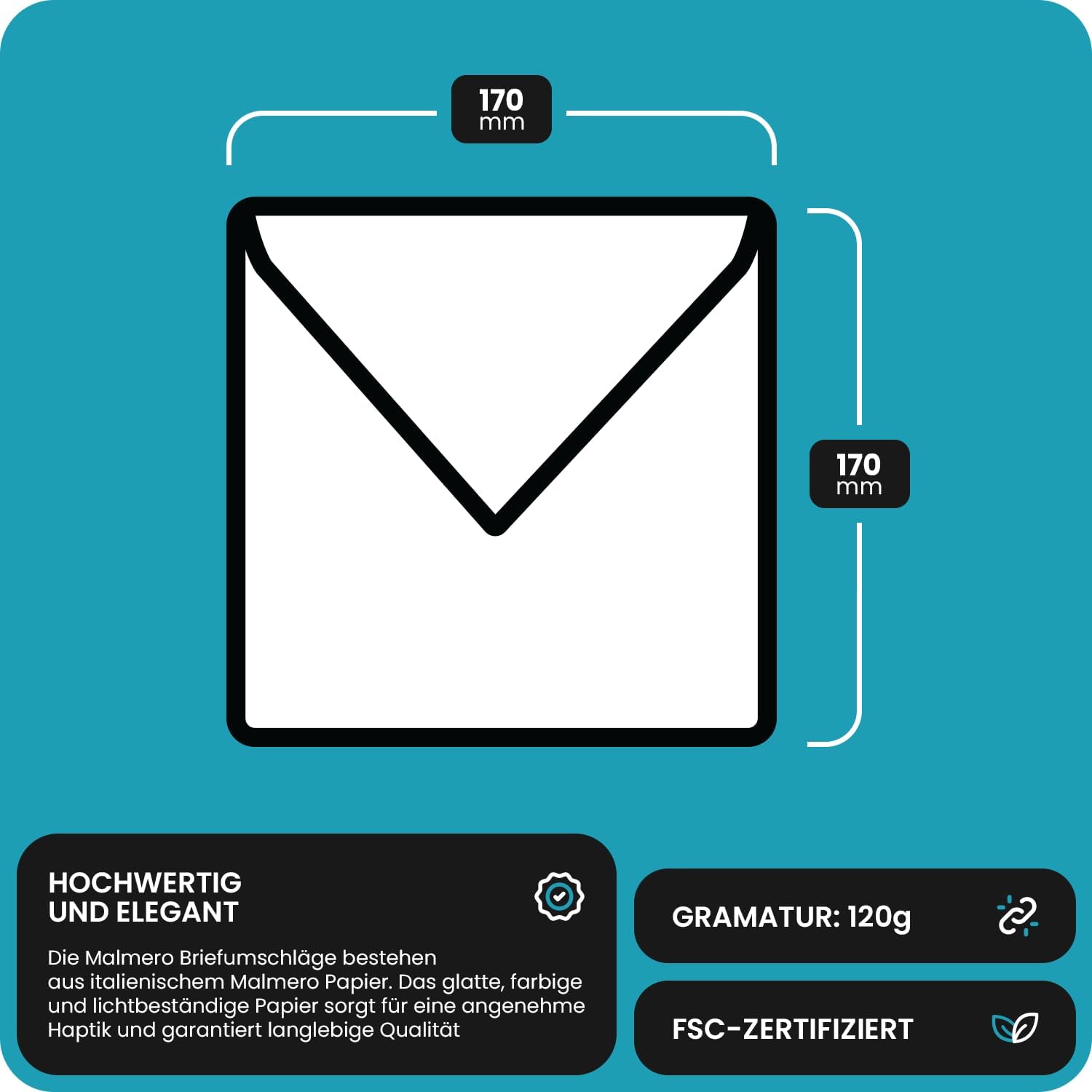 FORMATO CORRETTO – Le buste da lettera quadrate si distinguono per un aspetto raffinato e moderno. Sono spesso utilizzate per inviti, biglietti d'auguri, partecipazioni di matrimonio, compleanno o eventi speciali. ALTA QUALITÀ – Le buste Malmero sono realizzate in carta italiana Malmero con grammatura di 120 g/m². Questa carta liscia e colorata offre una piacevole sensazione al tatto e garantisce una qualità duratura. PRODOTTO ECOLOGICO – La carta Malmero è composta al 100% da pura cellulosa sbiancata senza cloro, proveniente da foreste gestite in modo sostenibile. Le buste sono riciclabili, perfette per chi ha a cuore l’ambiente. USO VERSATILE – Le buste kolorate Malmero sono la scelta ideale per inviti, corrispondenza raffinata o come confezione di lusso per occasioni speciali come Natale, matrimoni, compleanni e anniversari. SPECIFICHE TECNICHE – 100 buste quadrate (170 x 170mm), taglio a punta, lembo gommato; carta Malmero 120 g/m². Il colore del prodotto offerto potrebbe differire da quello visualizzato sul monitor.