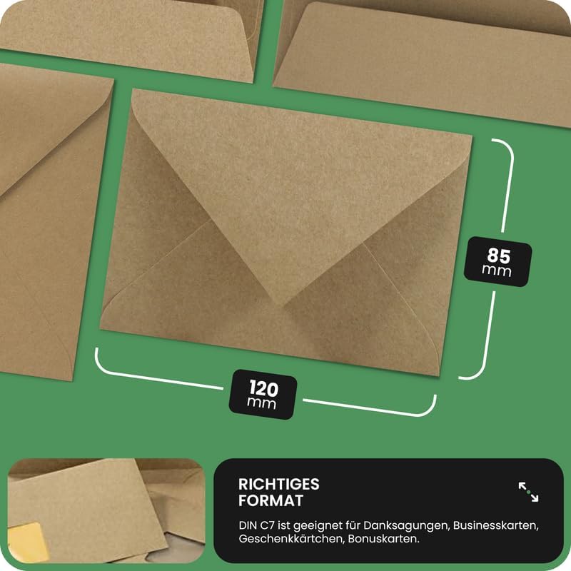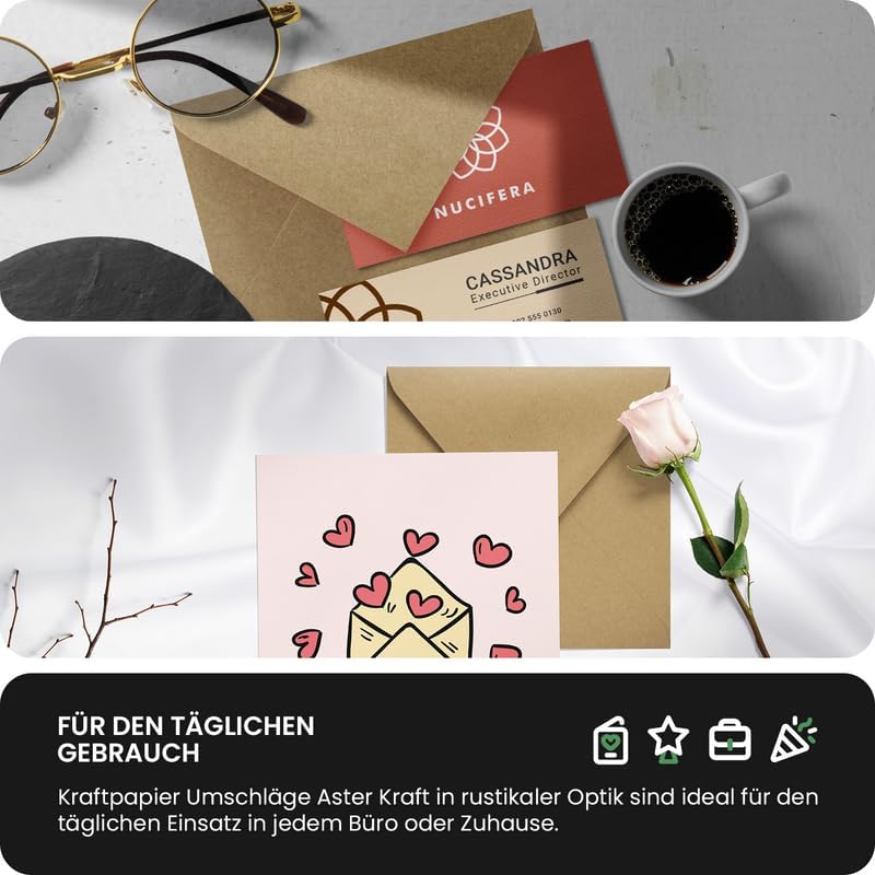 FORMATI BUSTE – A seconda delle vostre esigenze, dovete scegliere la giusta dimensione della busta. Le buste formato C7 sono molto piccole e carine; adatte per inserire piccoli documenti e oggetti, come biglietti d'auguri o di ringraziamento, soldi o banconote. PRODOTTO ECOLOGICO – La carta Kraft Aster Kraft è un materiale completamente riciclabile, composto per quasi il 100% da fibre di cellulosa extra lunghe e stabili, provenienti da coltivazioni sostenibili. La cellulosa utilizzata la rende estremamente resistente. PER L'USO QUOTIDIANO – Le buste Aster Kraft sono perfetti per l'uso quotidiano in ogni ufficio o casa. Si caratterizzano per l'alta qualità ed elevata resistenza, che le rendono ideali per la spedizione di oggetti o documenti: fatture, prospetti, estratti conti o promozioni. PER EVENTI SPECIALI – Le buste di alta qualità in look vintage sono adatte anche agli eventi più importanti come matrimonio, compleanno, battesimo, prima comunione, cresima, Natale o Pasqua. Sono perfette per inviare biglietti di auguri, inviti e partecipazioni. DATI TECNICI – 100 buste formato C7 (85x120mm) in carta Aster Kraft 100g/m², taglio a punta, lembo gommato, senza finestra, colore marrone naturale; certificate FSC, 100% riciclabile, 100% biodegradabile. A causa della materia prima, non possiamo garantire che l'adesivo utilizzato svolga la sua funzione. La tonalità può variare per ogni busta.