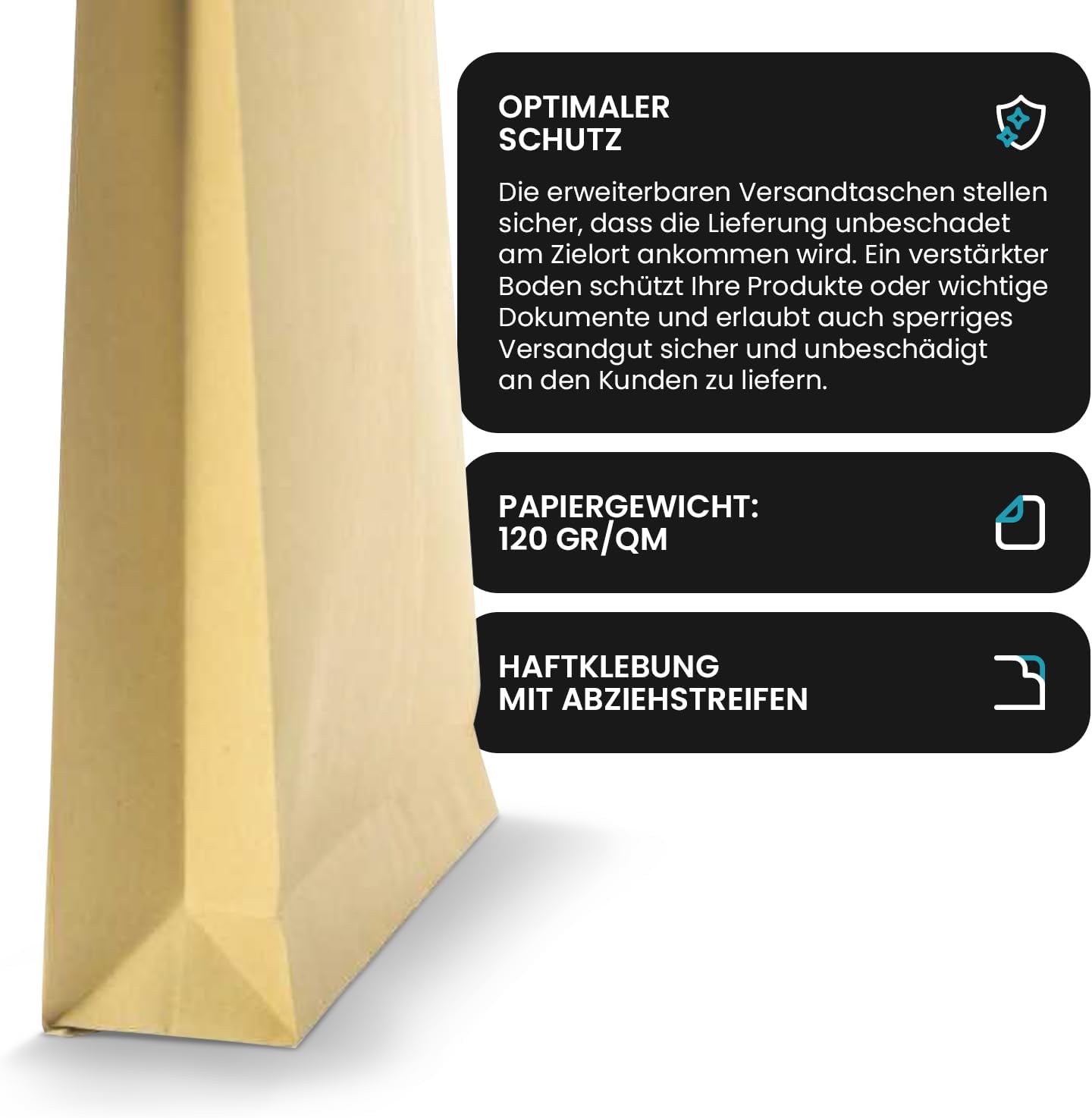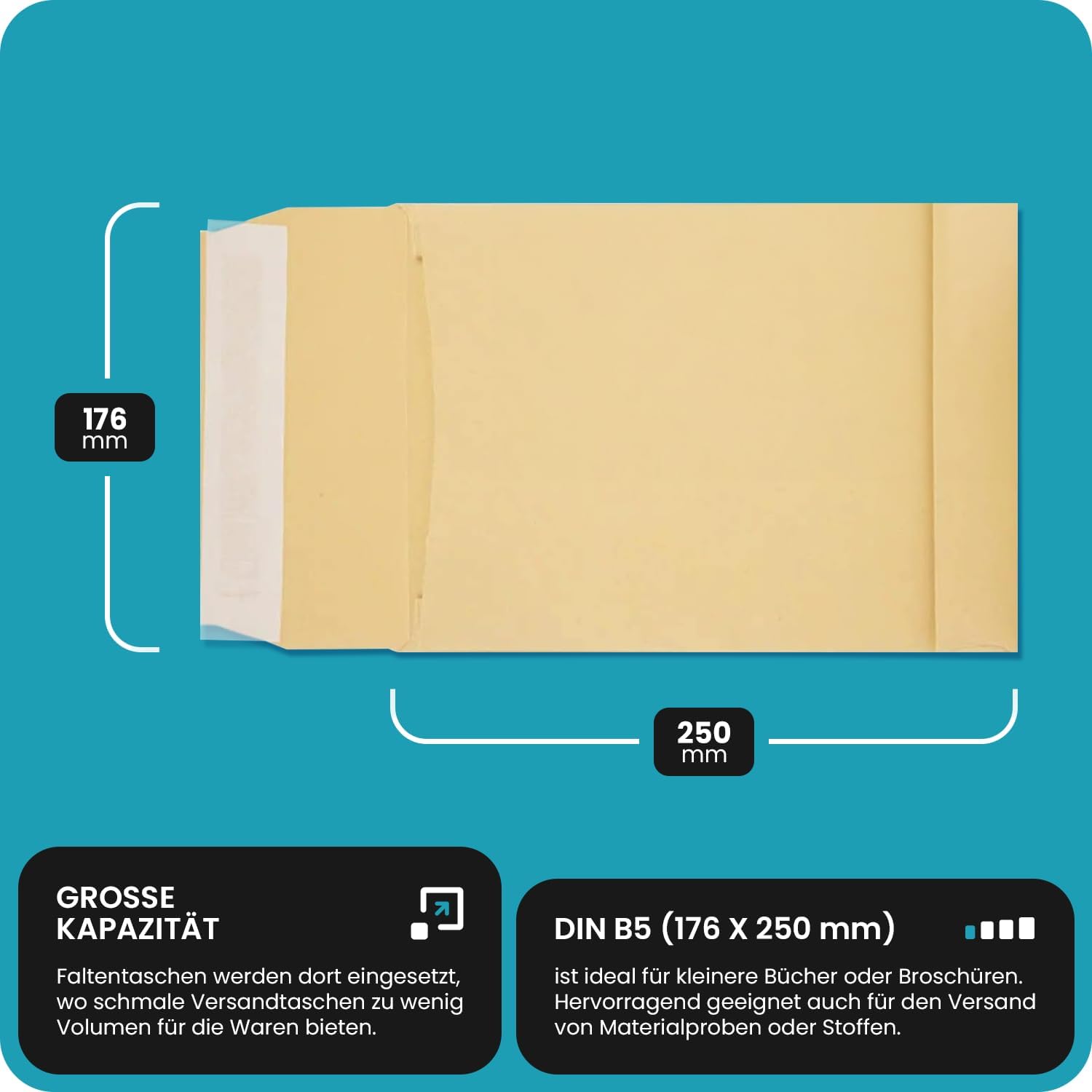 Versatile – le buste sono realizzate in carta resistente con soffietti laterali e fondo espandibile, in modo da poter essere estese se se necessario. Sono utilizzati per quantità variabili, poiché il fondo si adatta al contenuto di riempimento. Grande capacità – le buste con soffietto vengono utilizzate dove le buste tradizionali offrono troppo spazio per le merci. Il fondo estensibile consente di inviare libri e altri oggetti ingombranti che non possono essere spediti in una busta tradizionale. Protezione ottimale – le buste assicurano che la spedizione arrivi il luogo di destinazione senza danneggiare. Un fondo rinforzato protegge i vostri prodotti o documenti importanti e permette anche di spedire oggetti ingombranti e in modo sicuro al cliente. Facile da usare – le nostre buste sono realizzate in materiale di alta qualità e sono quindi particolarmente resistenti agli strappi e affidabili. Si chiude in modo rapido e sicuro e si apre facilmente e rapidamente. Dati tecnici – 20 buste a sacco con lati a soffietto e fondo quadro formato B5 (176 x 250 mm), grammatura della carta: 120 g/mq, senza finestra, apertura sul lato corto, lembo dritto con strip adesivo.