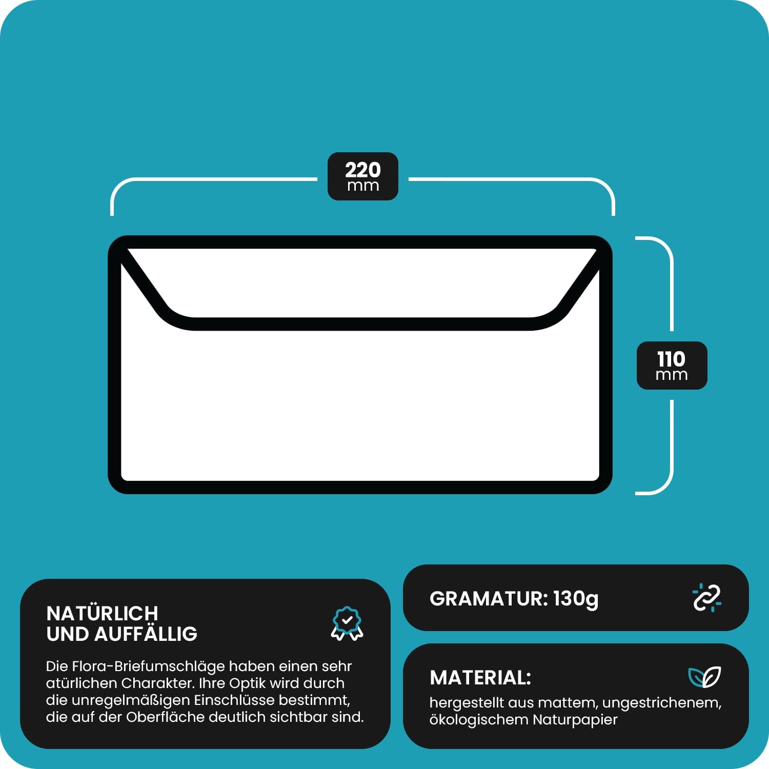 FORMATO CORRETTO – La scelta del formato giusto è fondamentale quando si tratta di buste. Il formato DL è il più comune e pratico, perfetto per contenere un foglio A4 piegato in tre parti. Ideale per lettere, documenti o corrispondenza aziendale. ECOLOGICHE E SOSTENIBILI – Le buste sono realizzate con carta italiana Flora, composta per il 50% da fibre riciclate, 10% fibre di cotone e 40% cellulosa certificata FSC. Sono completamente riciclabili e biodegradabili. ELEGANTI E NATURALI – Le buste Flora hanno un carattere molto naturale. La texture unica con inclusioni irregolari dona un aspetto raffinato e distintivo. Il cotone garantisce una sensazione al tatto morbida e piacevole. PER OGNI OCCASIONE – Perfette per partecipazioni o inviti di matrimonio, auguri, lettere d’amore, biglietti di augurii o ringraziamento, cartoline e creazioni fai-da-te. Ideali per un tocco speciale nelle tue comunicazioni. DATI TECNICI – 25 buste formato DL (110x220mm), taglio dritto con strip adesivo; carta naturale non patinata 130g, senza cloro elementare. Il colore può variare leggermente a causa delle diverse impostazioni del monitor.