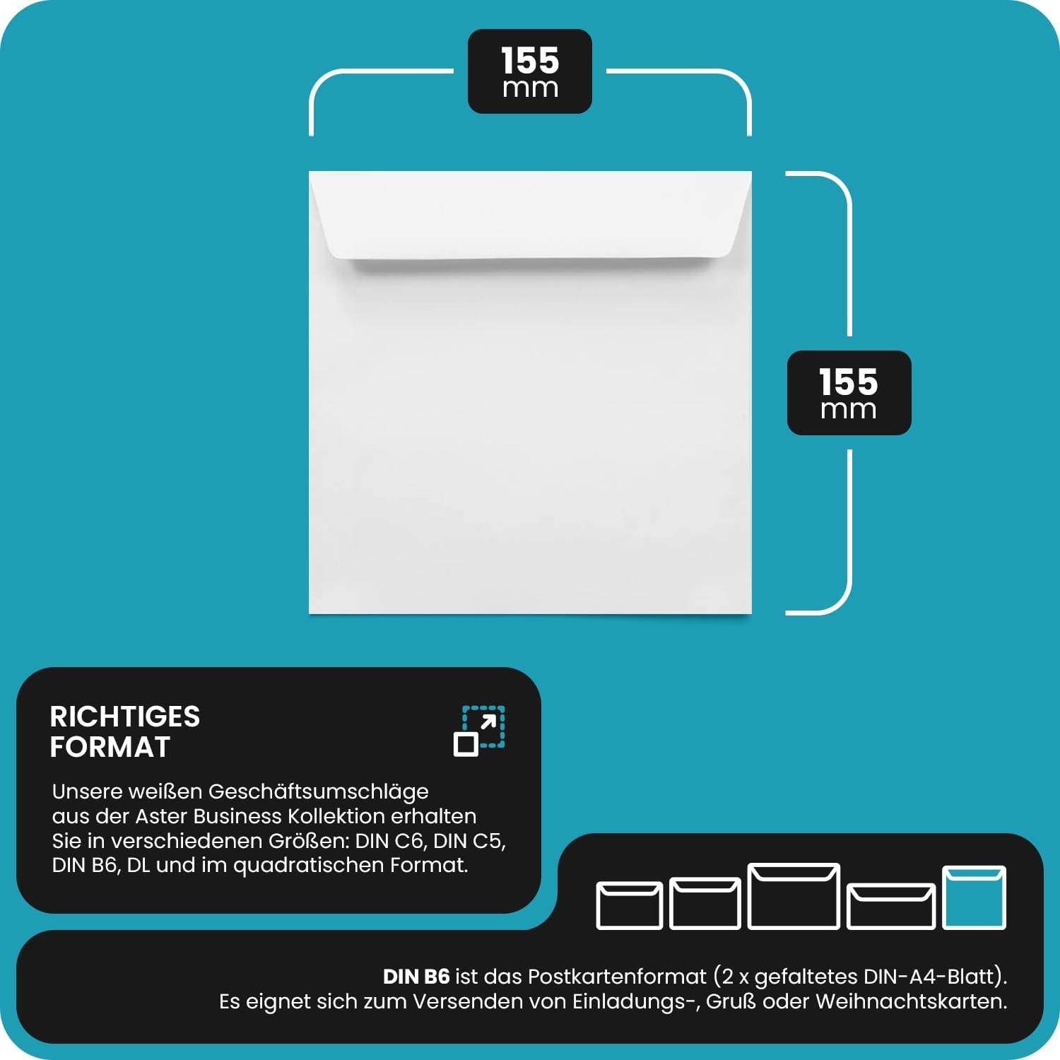 FORMATI BUSTE – Le nostre buste bianche della collezione Aster Business sono disponibili sono disponibili in diverse misure: C6, C5, B6, lunghe e quadrate. Buste lettera quadrate sono indicate per cartoline quadrate, flyers, inviti, biglietti di auguri, partecipazioni o CD. SEMPLICI ED ELEGANTI – Le nostre buste commerciali Aster Business sono fatte di carta di pregio bianca da 120 g. Sono caratterizzate da una striscia protettiva sulla patta dritta e non hanno la finestra. Sono scrivibile con qualsiasi penna. Offrono un'immagine professionale ed elegante. PER IL VOSTRO BUSINESS – Le buste commerciali sono uno strumento fondamentale per la vostra comunicazione aziendale. Sono ideali sia per comunicazioni ufficiali che per attività di promozione della vostra azienda. Possono essere stampate con il vostro logo e i vostri recapiti aziendali. UTILIZZO UNIVERSALE – Le buste Aster Business sono adatte non solo per l'invio di documenti importanti come fatture, candidature, prospetti aziendali, estratti conto o documenti contrattuali. Sono perfetti per qualsiasi tipo di invio, come anche per biglietti d'auguri, promozioni o inviti. CONSEGNA – 50 buste in formato quadrato (155x155mm) senza finestra, lembo dritto con strisce adesiva; realizzate in carta bianca opaca da 100g/m². Sono scrivibili e stampabili (adatte a stampanti inkjet e laser).