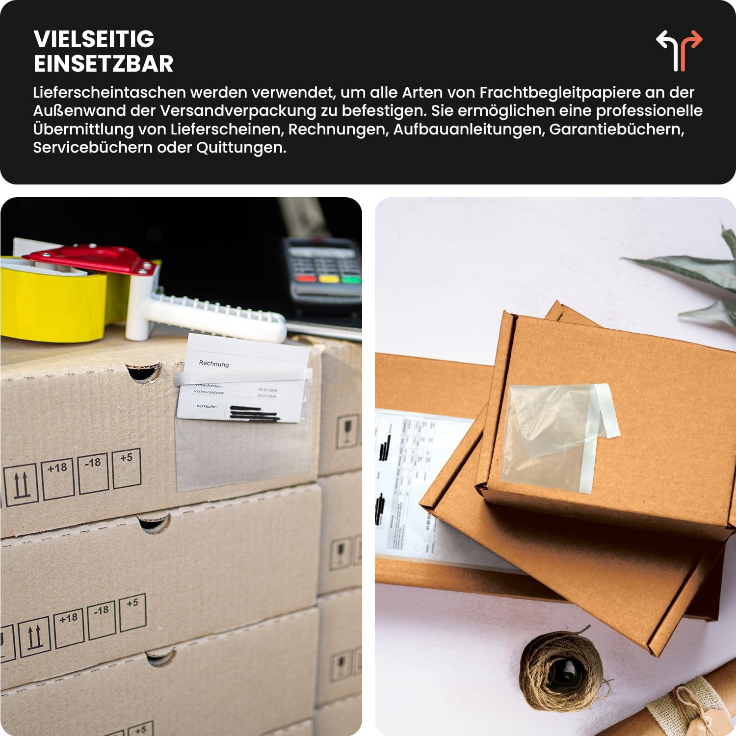 DIMENSIONE BUSTA – Sul nostro sito Amazon troverà buste portadocumenti trasparenti e rosse stampate in nero con il testo per documenti di consegna in diversi formati. Le buste portadocumenti DL sono adatte per documenti in formato DL (foglio A4 piegato in tre parti). PER VARI DOCUMENTI – Le buste portadocumenti per pacchi offrono la custodia ideale per tutti i tipi di documenti di trasporto: fatture, lettere di vettura, bolle di consegna, biglietti di consegna, bollettini di ritorno, polizze di carico, etichette di spedizione, note di spedizione, avvisi, istruzioni, licenze o comunicazioni. AFFIDABILI – Le buste portadocumenti rosse sono realizzati in pellicola LDPE durevole, che protegge i documenti di trasporto da sporco, umidità e danni meccanici. Garantiscono che i documenti non vengono persi durante il trasporto e raggiungano il destinatario. FACILE DA USARE – Sia il retro della busta spedizione che la linguetta di chiusura sono autoadesivi. Le strisce adesive facilmente rimovibili consentono una facile e veloce applicazione della tasca sulla confezione. Lo speciale adesivo garantisce una tenuta ottimale su tutte le superfici anche in condizioni difficili. DATI TECNICI – 50 buste portadocumenti formato DL, dimensioni esterne: 131 x 297 mm, dimensioni interne: 110 x 225 mm, finestra sul lato sinistro; stampa rossa/nera: fattura di consegna/packing Invoice, retro e linguetta di chiusura autoadesiva, realizzati in polietilene riciclabile ecologico; impermeabili.