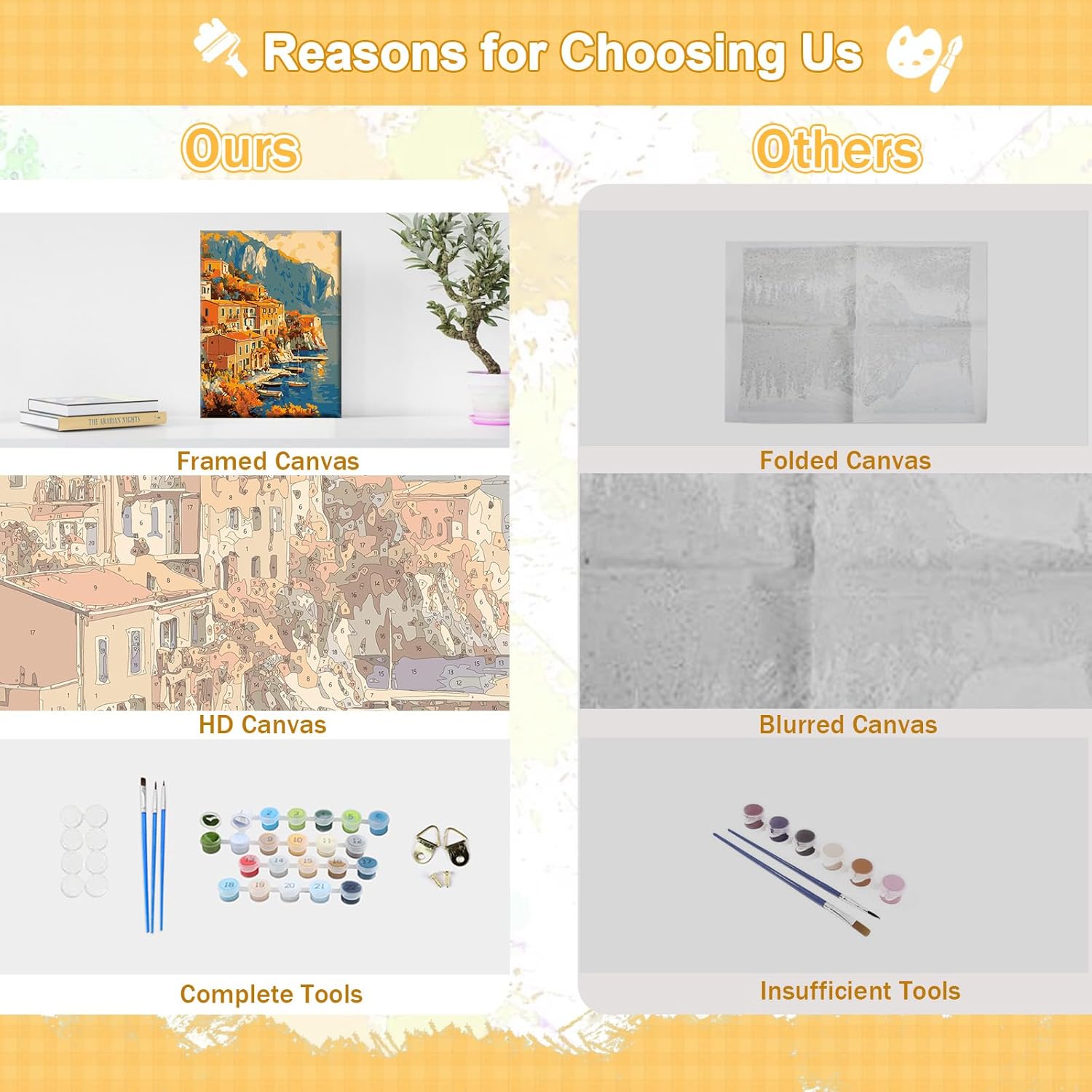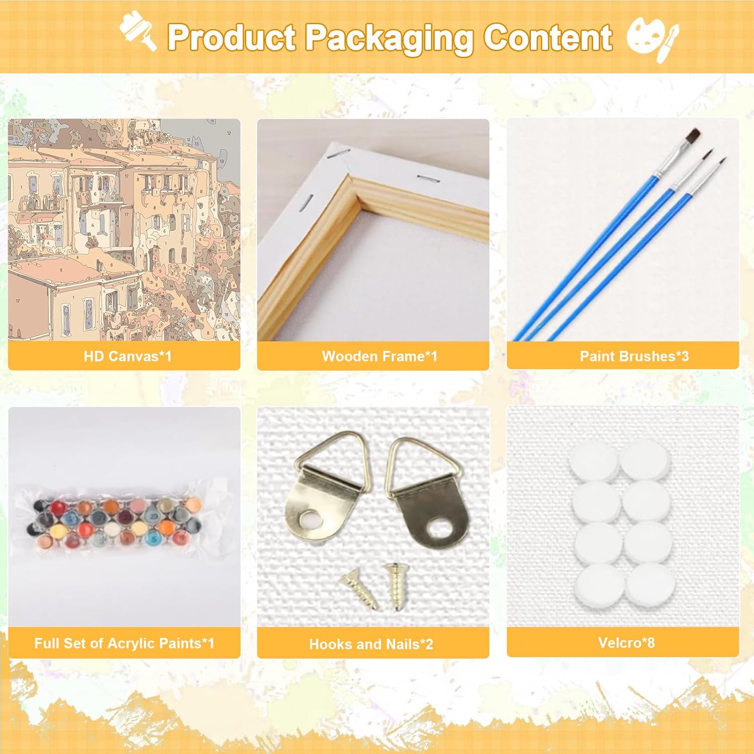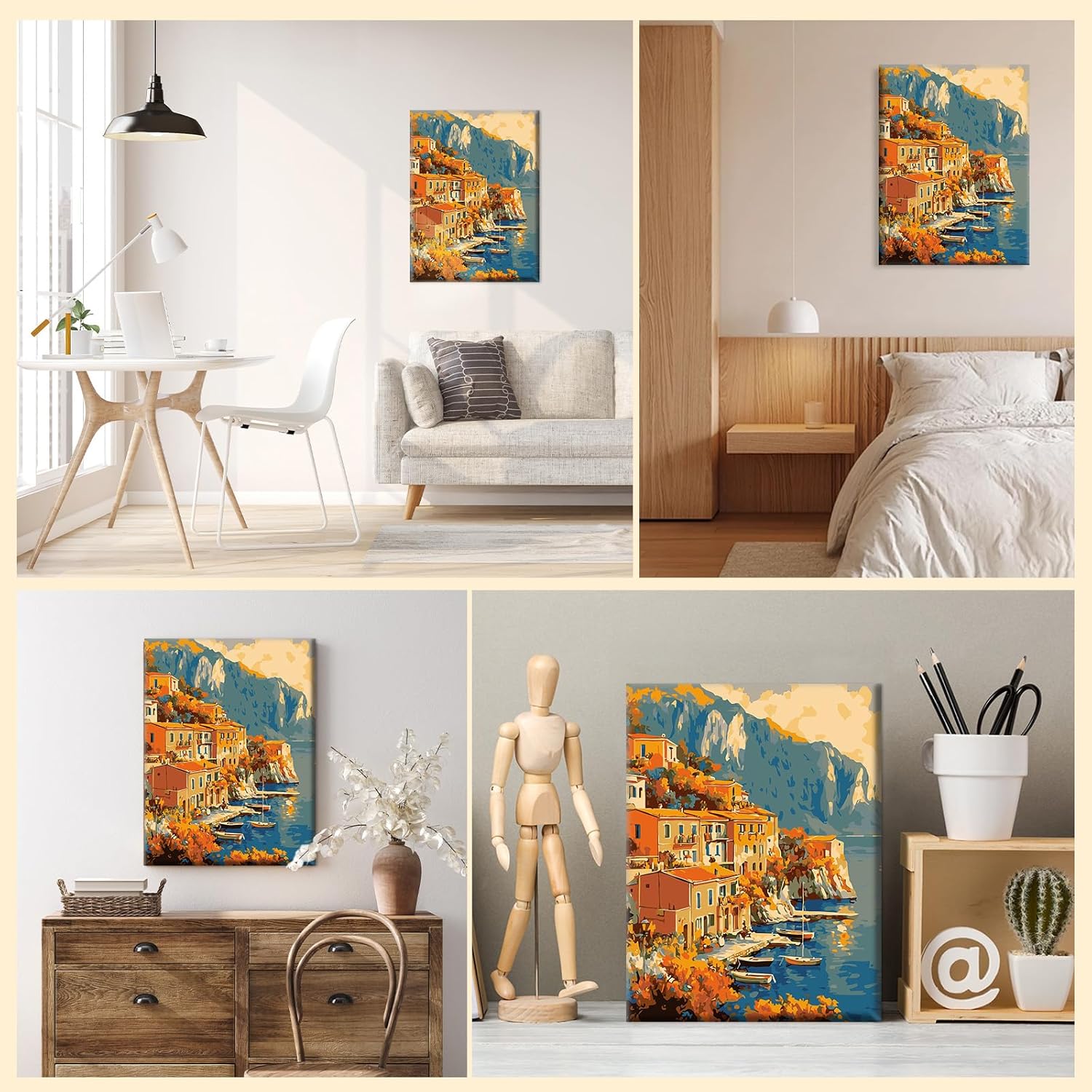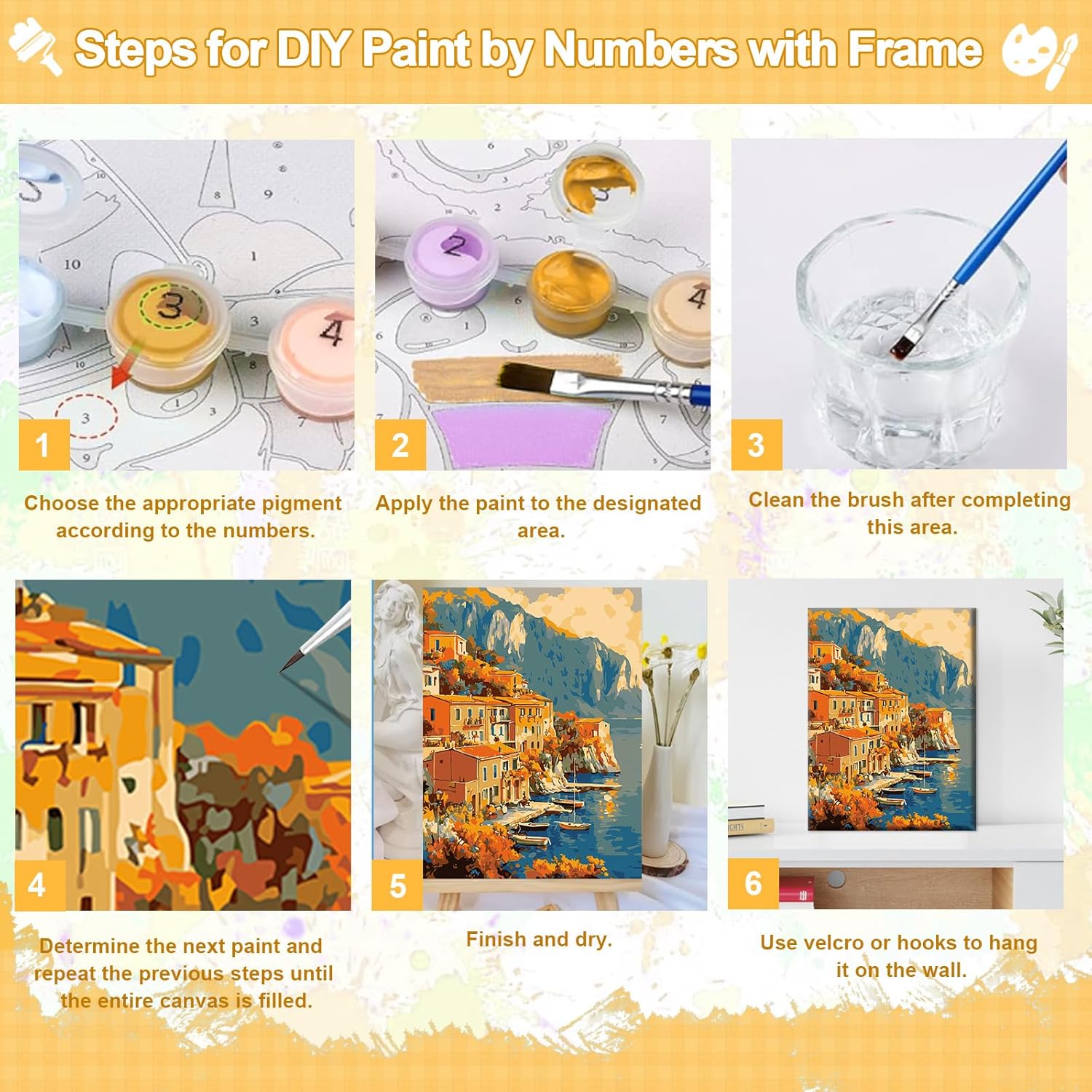 Facile da Dipingere: La tela è prestampata con numeri chiari,la vernice è confezionata singolarmente,la tela è ad alta definizione,resistente e facile da colorare,in modo che l'opera d'arte possa essere conservata a lungo e mostrare il miglior effetto. Kit di Dipingere con i Numeri con Telaio: Non è richiesta alcuna abilità pittorica di base,è possibile completare facilmente la propria opera d'arte semplicemente colorando in base ai numeri e godersi il divertimento del fai-da-te.I nostri pittura a olio con cornice sono adatti a persone di qualsiasi età che amano dipingere. Migliorare la Concentrazione: Il paint by numbers con cornice richiede di concentrarsi sull'abbinamento dei blocchi di colore con i codici, consentendo di immergersi nel processo di scelta dei colori e di riempimento,migliorando efficacemente la concentrazione. Ampiamente Utilizzato: Questo dipingi con i numeri con telaio è perfetto per decorare il soggiorno,la sala da pranzo,la camera da letto, l'ufficio,l'aula,ecc.,aggiungendo più colori e un tocco d'arte alla vostra vita. Design con Velcro e Ganci: Dotato di velcro e ganci,consente di fissare facilmente le opere d'arte finite sulla parete o in altri luoghi,sia per la decorazione della casa che per i regali,può presentare perfettamente le opere d'arte.