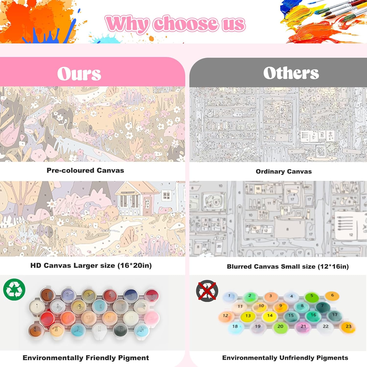 Facile da Disegnare:Il set di dipingere con i numeri per adulti presenta tela ad alta definizione,confezione indipendente di pigmenti,blocchi di colore trasparenti che sono chiaramente visibili,rendendo la colorazione più precisa e senza sforzo,anche per i principianti adulti che possono facilmente iniziare Tela Ad Alta Definizione:I numeri chiari sono pre-stampati sulla tela, rendendola facile da leggere.La tela ad alta definizione è resistente e facile da colorare,consentendo di conservare le opere a lungo e mostrando i migliori risultati Ampiamente Usato:La paint by numbers adulti è molto adatta per decorare uffici,aule,soggiorni,sale da pranzo,camere da letto,ecc.Non solo aggiunge atmosfera artistica,ma serve anche come decorazione squisita per migliorare la bellezza spaziale Promuovere l'interazione Sociale:Partecipare ad attività fai da te di dipingi con i numeri per adulti con la famiglia o gli amici può non solo migliorare le relazioni,ma anche stimolare la creatività e godere la gioia della creazione artistica insieme Miglior Regalo:La dipingere con i numeri kit per adulti è anche il miglior regalo per la famiglia e gli amici per esprimere i vostri migliori auguri.Ad esempio,regali di compleanno,regali di nozze,regali di Natale,regali di Pasqua,regali di ringraziamento,regali di festa della mamma e così via