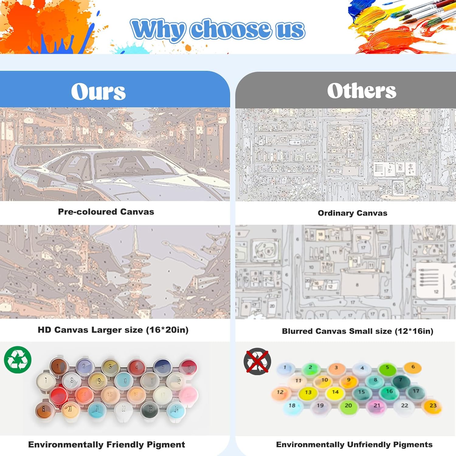 Facile da Disegnare:Il set di dipingere con i numeri per adulti presenta tela ad alta definizione,confezione indipendente di pigmenti,blocchi di colore trasparenti che sono chiaramente visibili,rendendo la colorazione più precisa e senza sforzo,anche per i principianti adulti che possono facilmente iniziare Tela Ad Alta Definizione:I numeri chiari sono pre-stampati sulla tela, rendendola facile da leggere.La tela ad alta definizione è resistente e facile da colorare,consentendo di conservare le opere a lungo e mostrando i migliori risultati Ampiamente Usato:La paint by numbers adulti è molto adatta per decorare uffici,aule,soggiorni,sale da pranzo,camere da letto,ecc.Non solo aggiunge atmosfera artistica,ma serve anche come decorazione squisita per migliorare la bellezza spaziale Promuovere l'interazione Sociale:Partecipare ad attività fai da te di dipingi con i numeri per adulti con la famiglia o gli amici può non solo migliorare le relazioni,ma anche stimolare la creatività e godere la gioia della creazione artistica insieme Miglior Regalo:La dipingere con i numeri kit per adulti è anche il miglior regalo per la famiglia e gli amici per esprimere i vostri migliori auguri.Ad esempio,regali di compleanno,regali di nozze,regali di Natale,regali di Pasqua,regali di ringraziamento,regali di festa della mamma e così via
