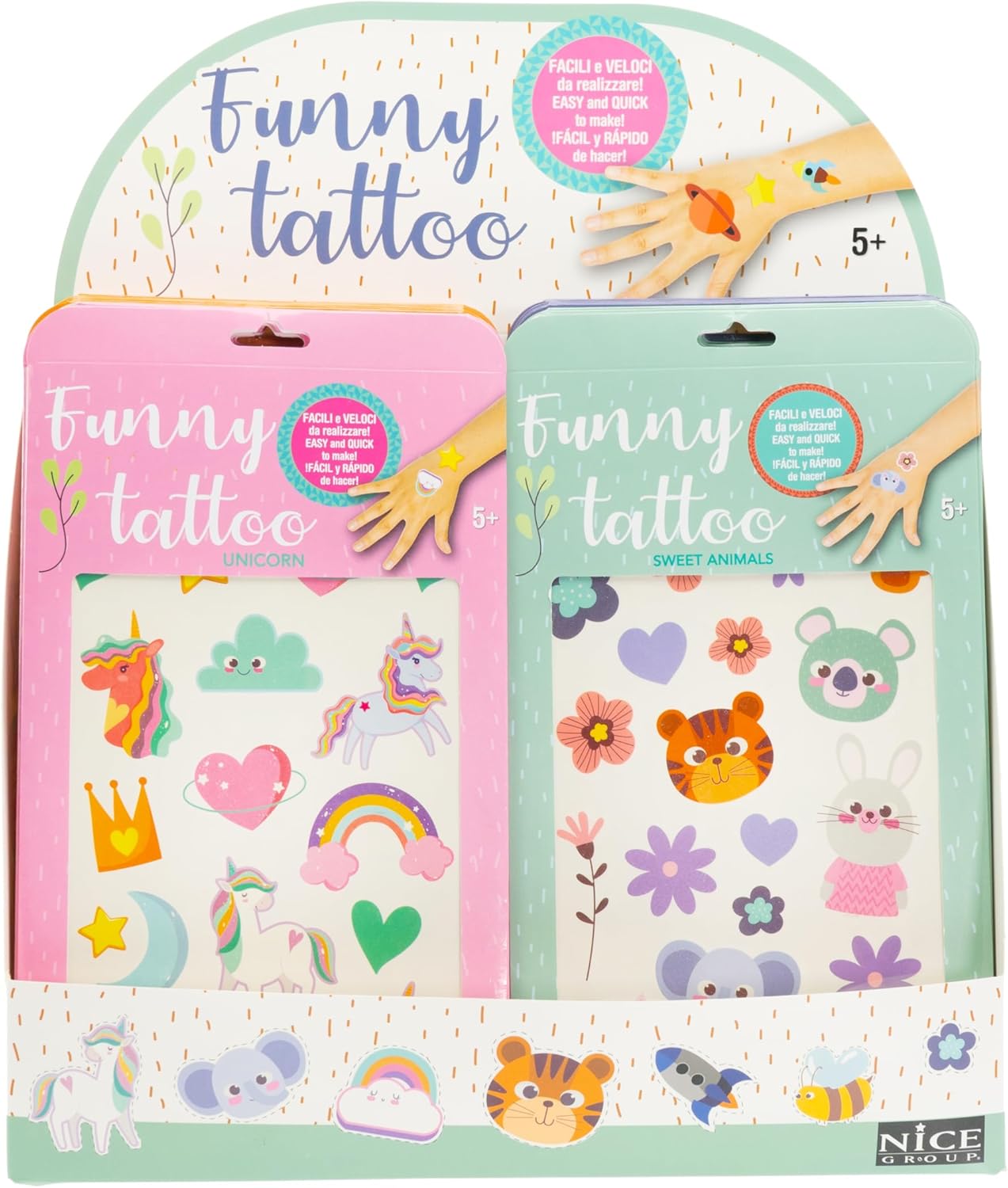 IL PREZZO è riferito alla vendita di 1 singola confezione assortita a sorpresa. CREATIVE FUNNY TATTOO: Kit di tatuaggi colorati per bambini che vedono raffigurati simpatici animaletti e oggetti. Disegni assortiti unisex. CONTENUTO: il blister contiene foglietti con tanti soggetti diversi da applicare sulla pelle. MATERIALI: i componenti usati per realizzare i funny tattoo sono testati, sicuri, certificati secondo la normativa vigente. Età consigliata: 5+
