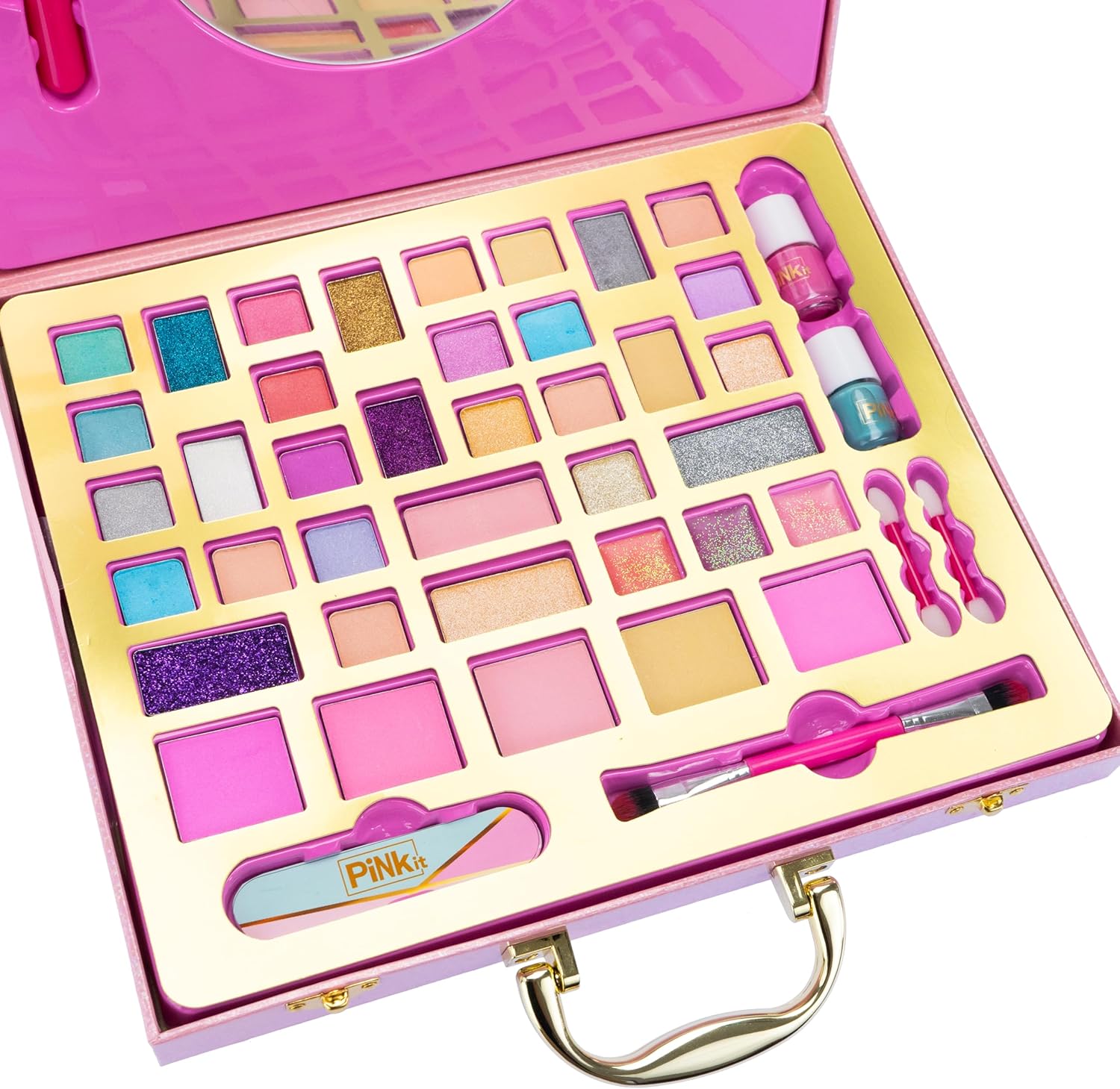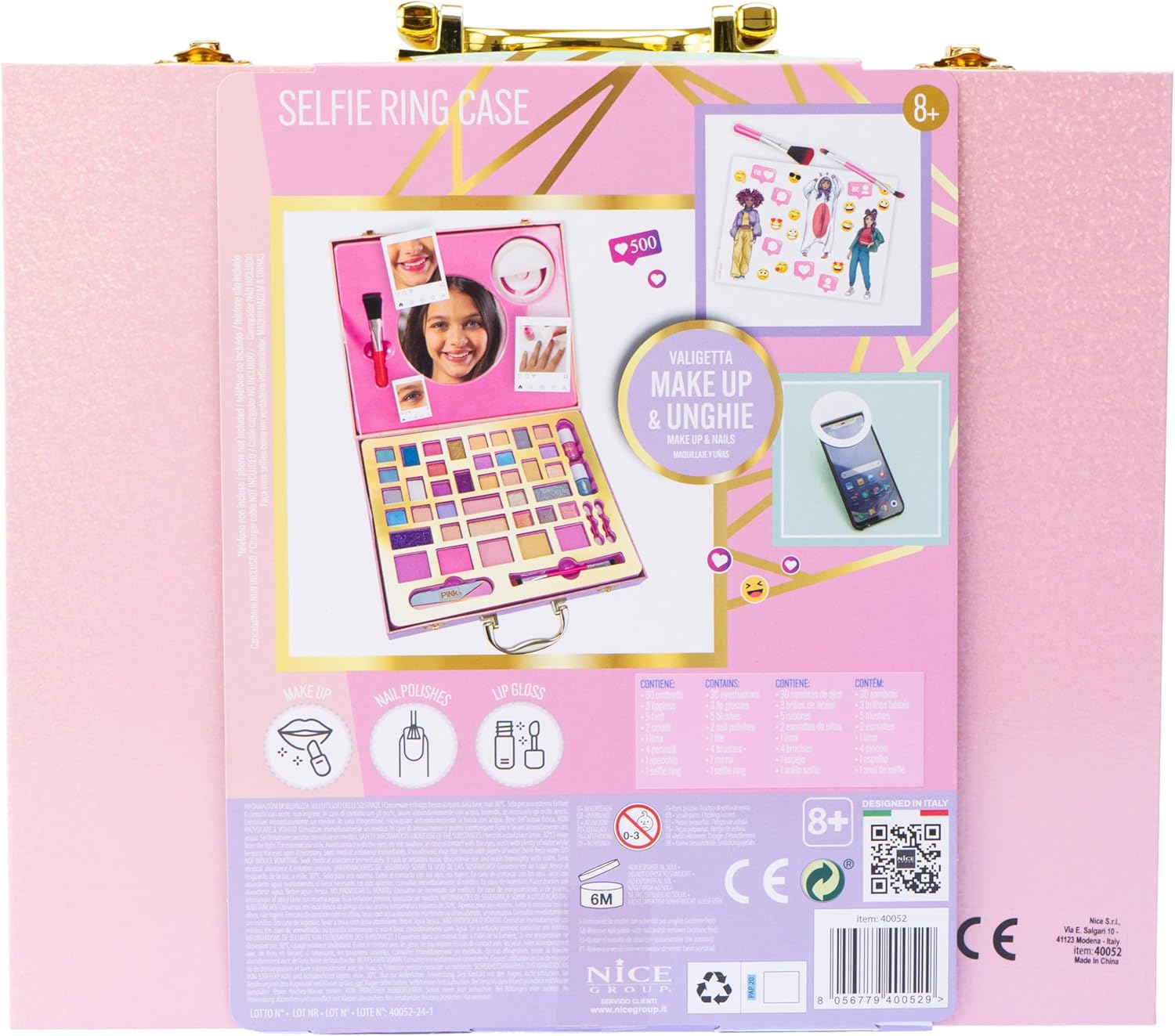 CUSTODIA PER SELFIE RING PINK IT: Si tratta di una scintillante custodia olografica decorata con immagini della linea Pink, che contiene un set trucco assortito per bambine e un anello luminoso per selfie perfetti. CARATTERISTICHE: Il set trucco per bambini è realizzato con materiali testati, sicuri, privi di parabeni, atossici e si rimuovono facilmente dalla pelle con acqua e detergente delicato. Utilizzo: La Valigia Selfie Ring aiuta a stimolare la manualità, la coordinazione e la fantasia di ogni ragazzo e ragazza che vuole sentirsi come in una favola senza limitare la fantasia nel trucco e nei travestimenti. Dimensioni: 30 x 25 x 5,5 cm. Grazie al design compatto e alla pratica maniglia per il trasporto sulla parte superiore, la custodia può essere sempre portata con sé. Contenuto: ombretto, fard, smalto, lima per unghie, applicatori, anello selfie, manuale di istruzioni (potrebbe non essere in inglese). PINK IT originale di Nice Group. Età consigliata: 8+
