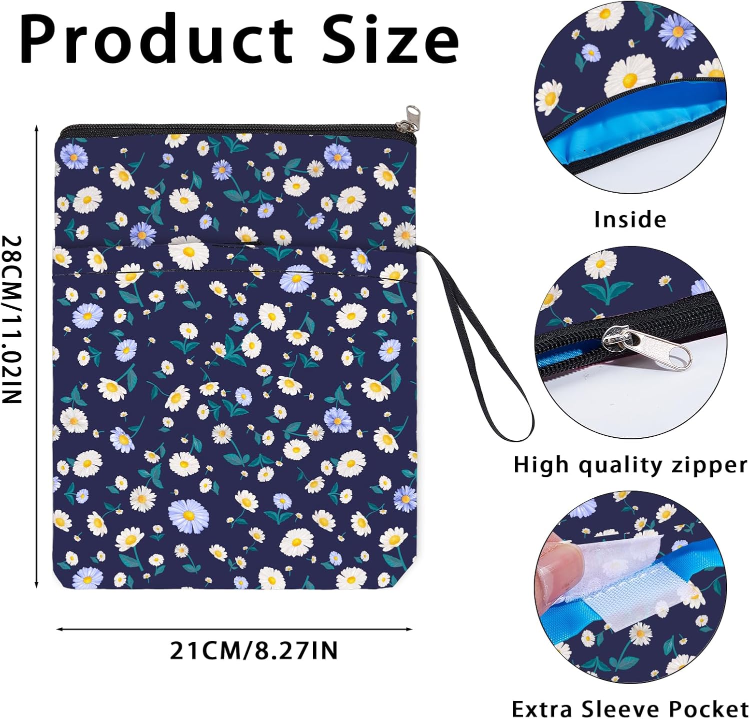 Informazioni sulla quantità:Riceverai 1 copertina per libro, misura 9 x 11.4 pollice / 23 x 29cm , si adatta alla maggior parte dei libri, come i tascabili standard, tascabili di massa, copertina rigida normale e altro ancora Cerniera e maniglia:questa copertina lavabile per libri è dotata di cerniera e maniglia, rende facile l'apertura e la chiusura, Rendi i tuoi libri sicuri e consenti allo stesso tempo un facile trasporto ovunque tu vada, puoi facilmente inserire o estrarre il libro Tasca frontale extra:questa custodia impermeabile per libri non può contenere libri, la tasca extra sulla manica può contenere anche penne, occhiali, segnalibri, bloc notes, cuffie e altri accessori, pratico e bello in Motivo a margherita:la nostra custodia protettiva per libri è realizzata con un motivo a margherita bianca, questo design aggiunge un tocco di eleganza e raffinatezza al tuo libro, non una custodia protettiva, ma un accessorio di stile Tessuto impermeabile:le nostre copertine per libri sono realizzate in tessuto impermeabile. È impermeabile e può proteggere i nostri libri dalla polvere e mantenerli piatti e lisci. È molto leggero e comodo per l'uso quotidiano, molto robusto. Può anche essere riutilizzato