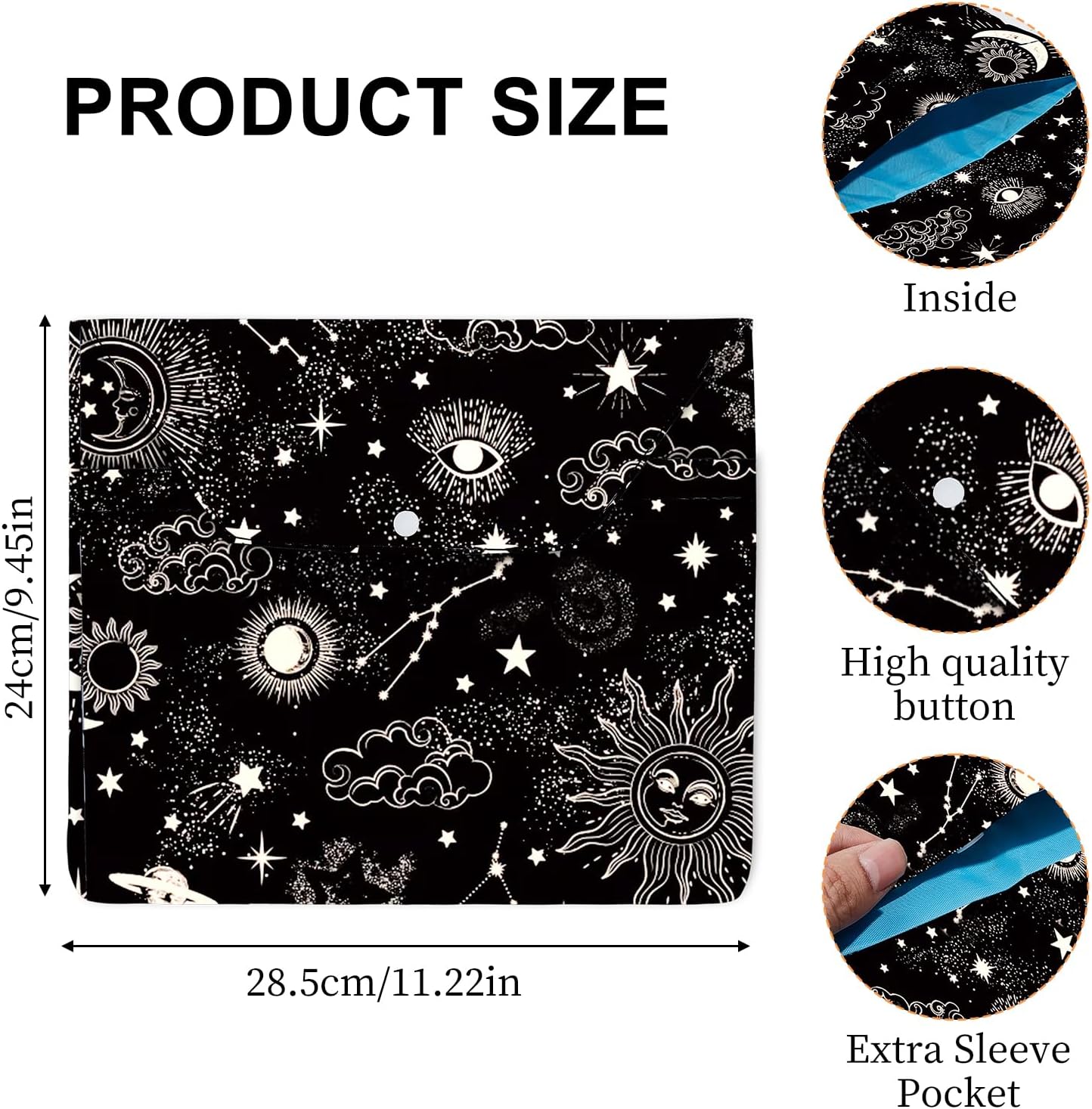 DETTAGLI DIMENSIONI: Misurando 28,5 x 24 cm / 11,2 x 9,4 pollici, questa libreria può ospitare la maggior parte dei tascabili standard, tascabili popolari e classici libri con copertina rigida MATERIALE RIUTILIZZABILE: Realizzata in poliestere e dotata di chiusura a bottone per una facile apertura e chiusura per gli amanti dei libri. Proteggi i tuoi libri da sporco, graffi e pieghe PROTEGGI I TUOI LIBRI: Proteggi i tuoi libri preferiti conservandoli in questa borsa per libri, ideale per i viaggi, assicura che i tuoi libri rimangano in ottime condizioni, mantenendo un aspetto appena uscito dal negozio DESIGN A TEMA: Questa copertina non solo proteggerà i tuoi libri dalla polvere e dagli strappi, ma anche il design a stella e luna in bianco e nero è fantastico. È la copertina perfetta per gli amanti dei libri che si sforzano di mantenere i loro libri preziosi in ottime condizioni. PROTEZIONE EFFICACE: La nostra copertina per libri è un oggetto premuroso e pratico per amici, viaggiatori o professionisti, che migliora la loro esperienza di studio o di lavoro con il suo design elegante e funzionale