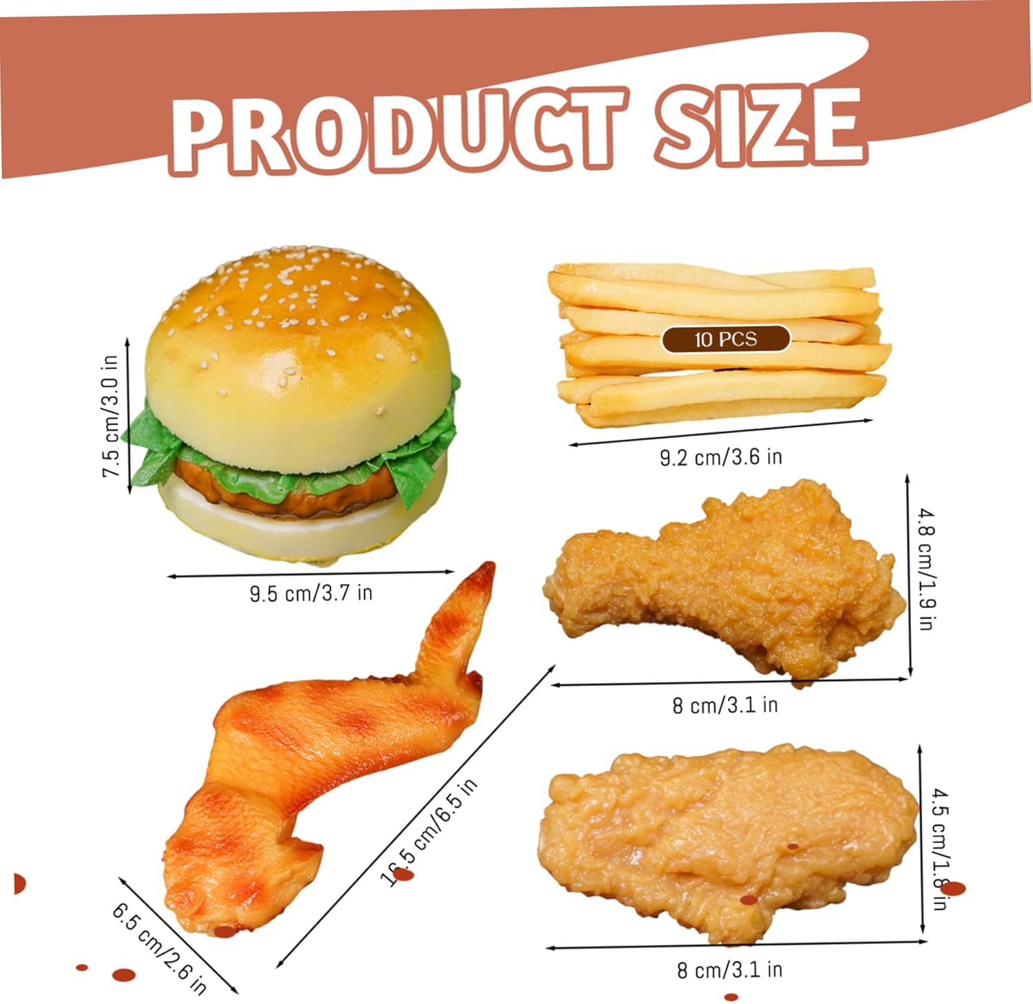 Set pasto completo: include piatti popolari come hamburger, pollo fritto e patatine fritte, aiutando i bambini a conoscere le categorie di alimenti e incoraggiando al tempo stesso il gioco di ruolo e l'interazione sociale. Facile da pulire e riporre: le superfici lisce consentono una pulizia rapida dopo il gioco e le dimensioni compatte garantiscono un comodo stoccaggio, rendendo questo set senza problemi per i genitori e ideale per l'uso quotidiano. Opzioni di utilizzo versatili: perfette per cucine da gioco, giocattoli alimentari, decorazioni per feste o oggetti di scena, offrendo valore multifunzionale sia per il gioco creativo dei bambini che per gli allestimenti festivi. Cibo da gioco realistico: realizzato con trame dettagliate e colori vivaci, questo set di cibo in plastica artificiale sembra proprio quello reale, migliorando il gioco fantasioso e rendendo le decorazioni di Halloween più vivaci. Materiali affidabili: realizzati in plastica atossica di alta qualità, sicura per i bambini e costruita per resistere a un uso ripetuto senza sbiadire o rompersi, garantendo un divertimento duraturo.