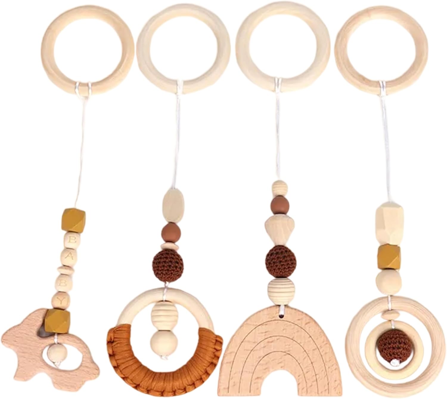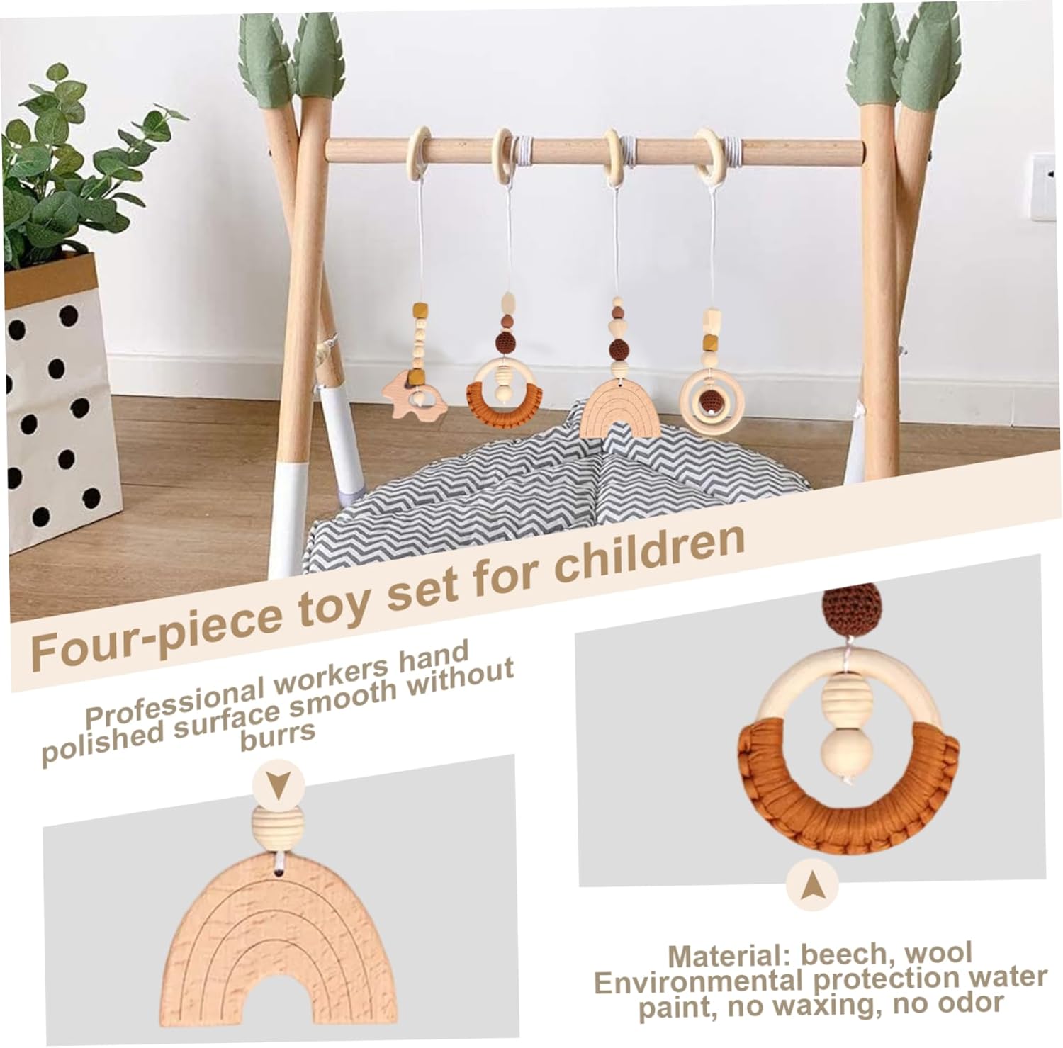 Promuove lo sviluppo sensoriale: la combinazione di diverse forme e texture aiuta a stimolare lo sviluppo sensoriale del tuo bambino, incoraggiando l'esplorazione tattile e migliorando le sue capacità motorie. Opzioni di sospensione versatili: progettati per una varietà di usi, questi giocattoli possono essere facilmente appesi a culle, passeggini o palestre, offrendo diversi modi per coinvolgere il tuo bambino in un gioco divertente e interattivo. Lavorazione artigianale del legno naturale: i nostri giocattoli sospesi da 4 pezzi sono meticolosamente realizzati a mano in legno naturale, garantendo che non vengano utilizzate vernici o sostanze chimiche dannose, rendendoli sicuri per l'interazione del tuo bambino. Scelta ponderata: questi deliziosi giocattoli in legno sono ideali per baby shower, compleanni o feste festive, promuovendo un gioco sicuro ed ecologico per neonati e bambini piccoli. Finitura superficiale liscia: ogni giocattolo presenta una superficie liscia e lucida, priva di schegge o bordi ruvidi, che garantisce un gioco sicuro e consente ai bambini di esplorare le texture senza rischio di lesioni.
