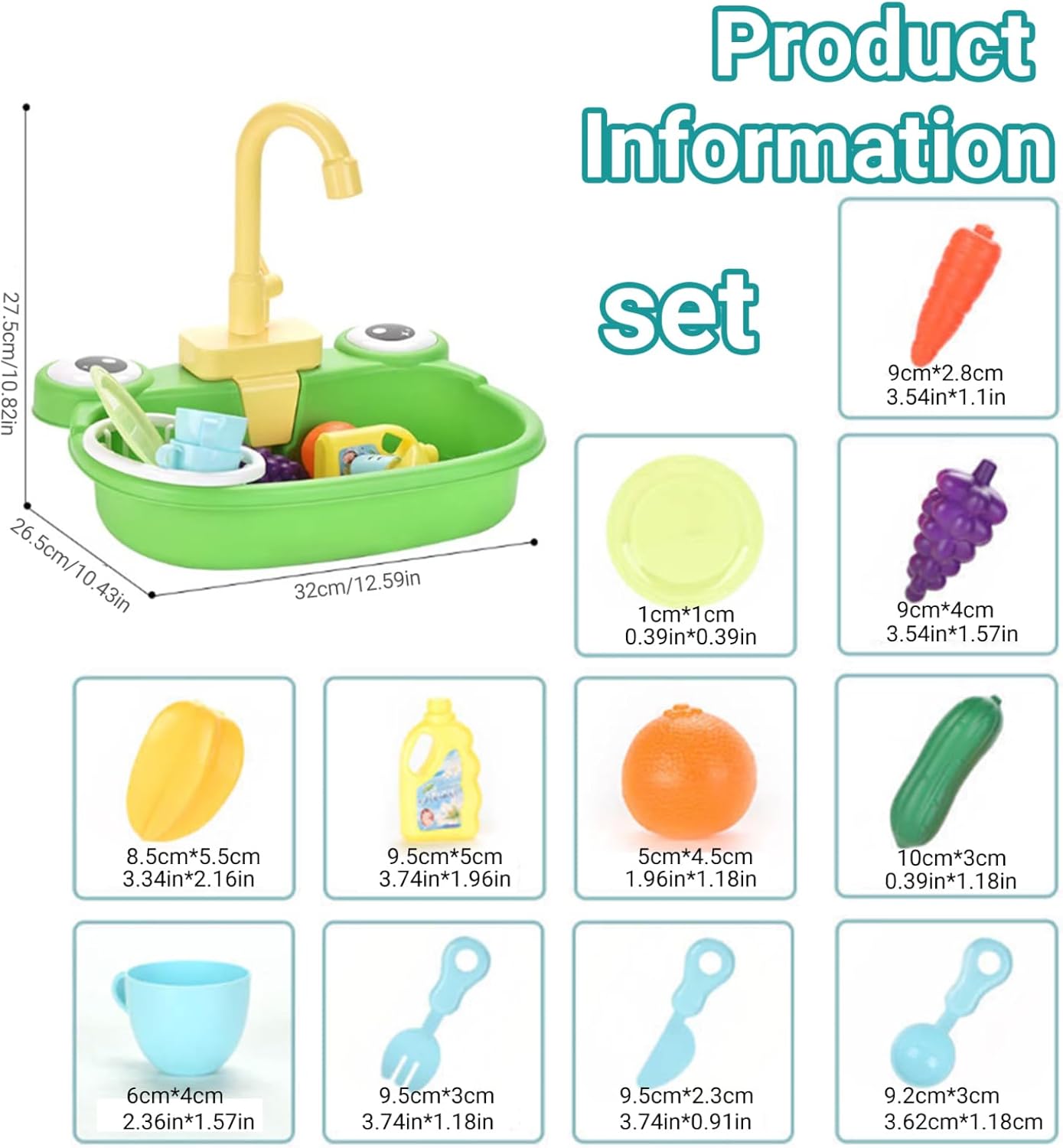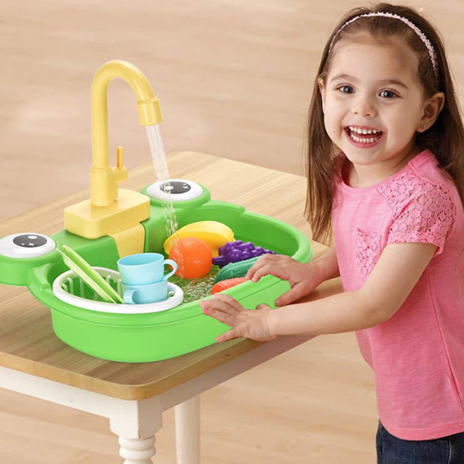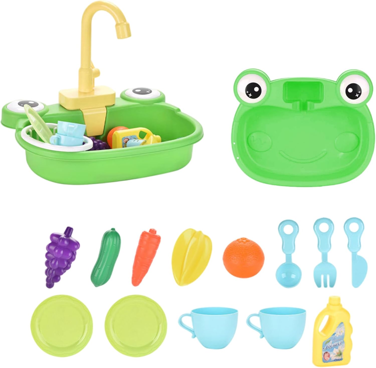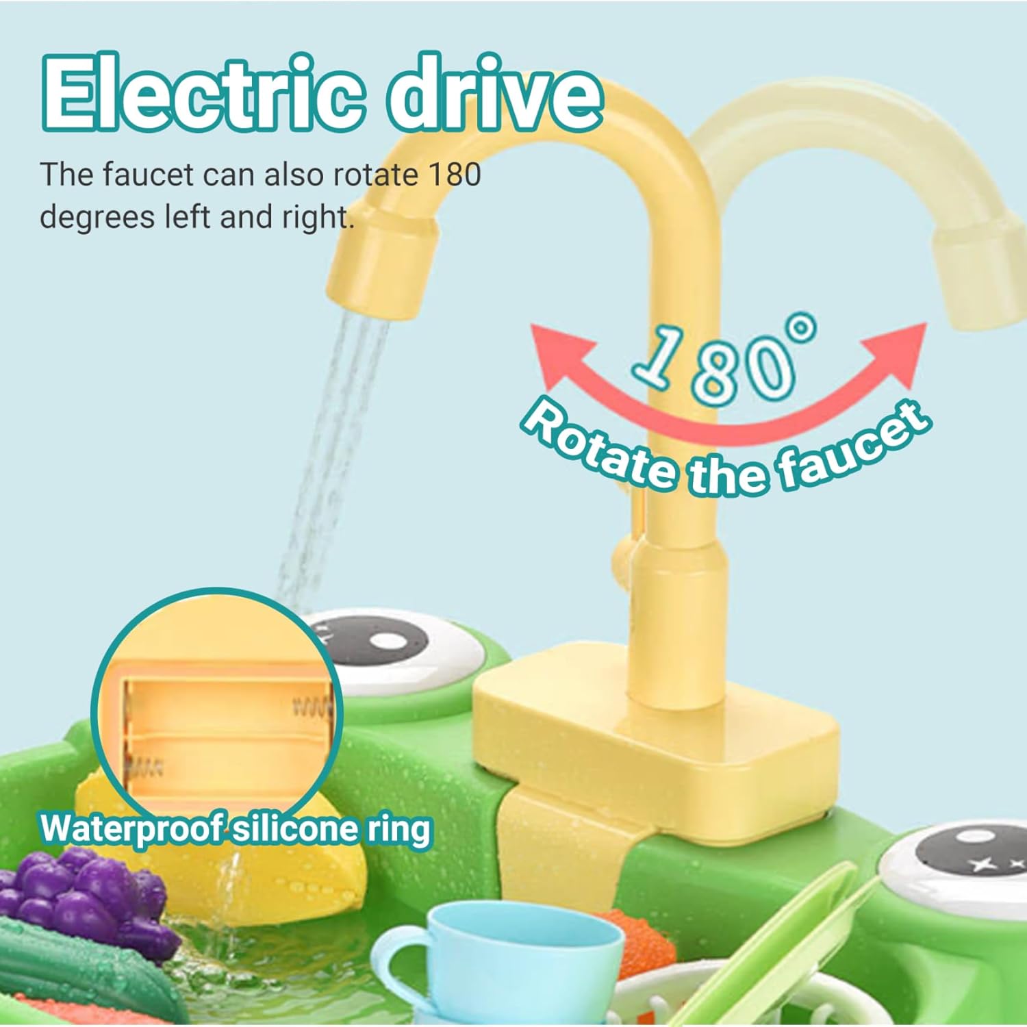 Adorabile tema della rana: il vivace design delle rane offre divertimento e coinvolgimento extra, incoraggiando i bambini a esplorare i giochi in acqua e allo stesso tempo a sviluppare responsabilità attraverso il gioco di ruolo. Design del rubinetto ruotabile di 180°: il rubinetto può ruotare da un lato all'altro, aiutando i bambini a sviluppare la coordinazione delle mani mentre imitano le vere attività della cucina come sciacquare i piatti o lavare le verdure. Accessori per giocattoli educativi: viene fornito con un ricco set di oggetti di gioco finti: frutta colorata, verdura, stoviglie e una bottiglia di detersivo per insegnare ai bambini la pulizia e le faccende domestiche. Sicuro e facile da usare: realizzato in plastica priva di BPA con bordi lisci, è sicuro per i bambini dai 3 anni in su..Facile da installare, pulire e utilizzare all'interno o all'esterno per ore di divertimento. Vera acqua corrente con alimentazione a batteria: questo lavandino da gioco simula un vero lavandino con acqua circolante..Basta aggiungere acqua alla bacinella e lasciare che i bambini attivino il rubinetto: non sono necessarie tubature!