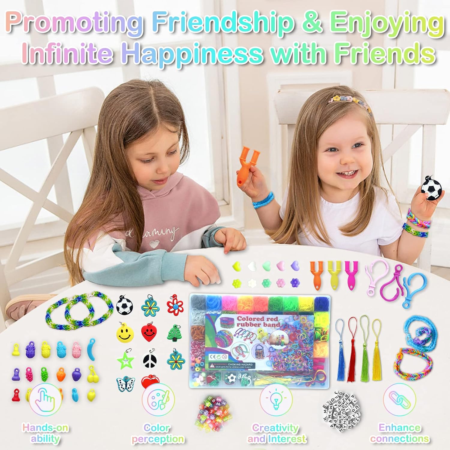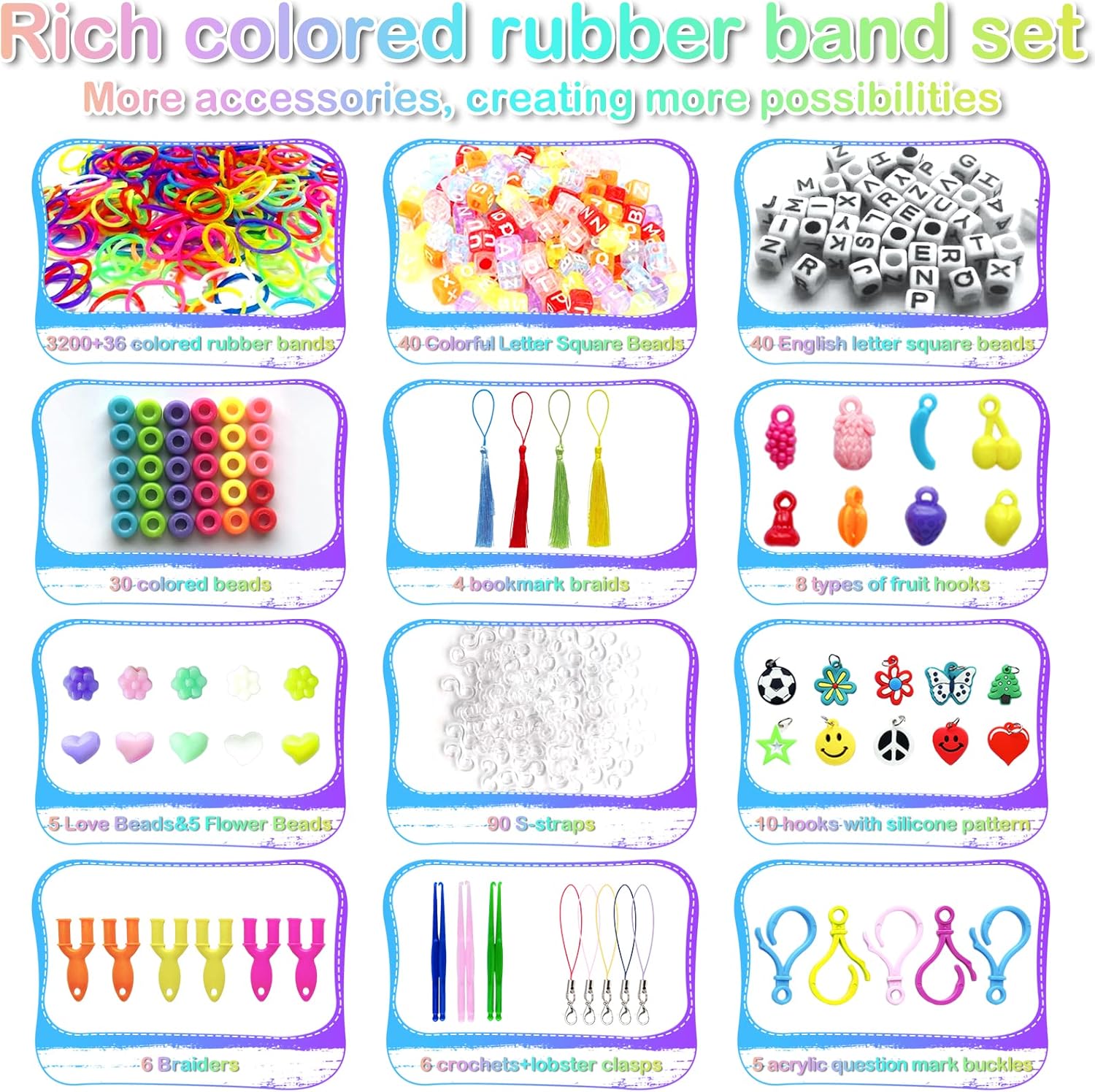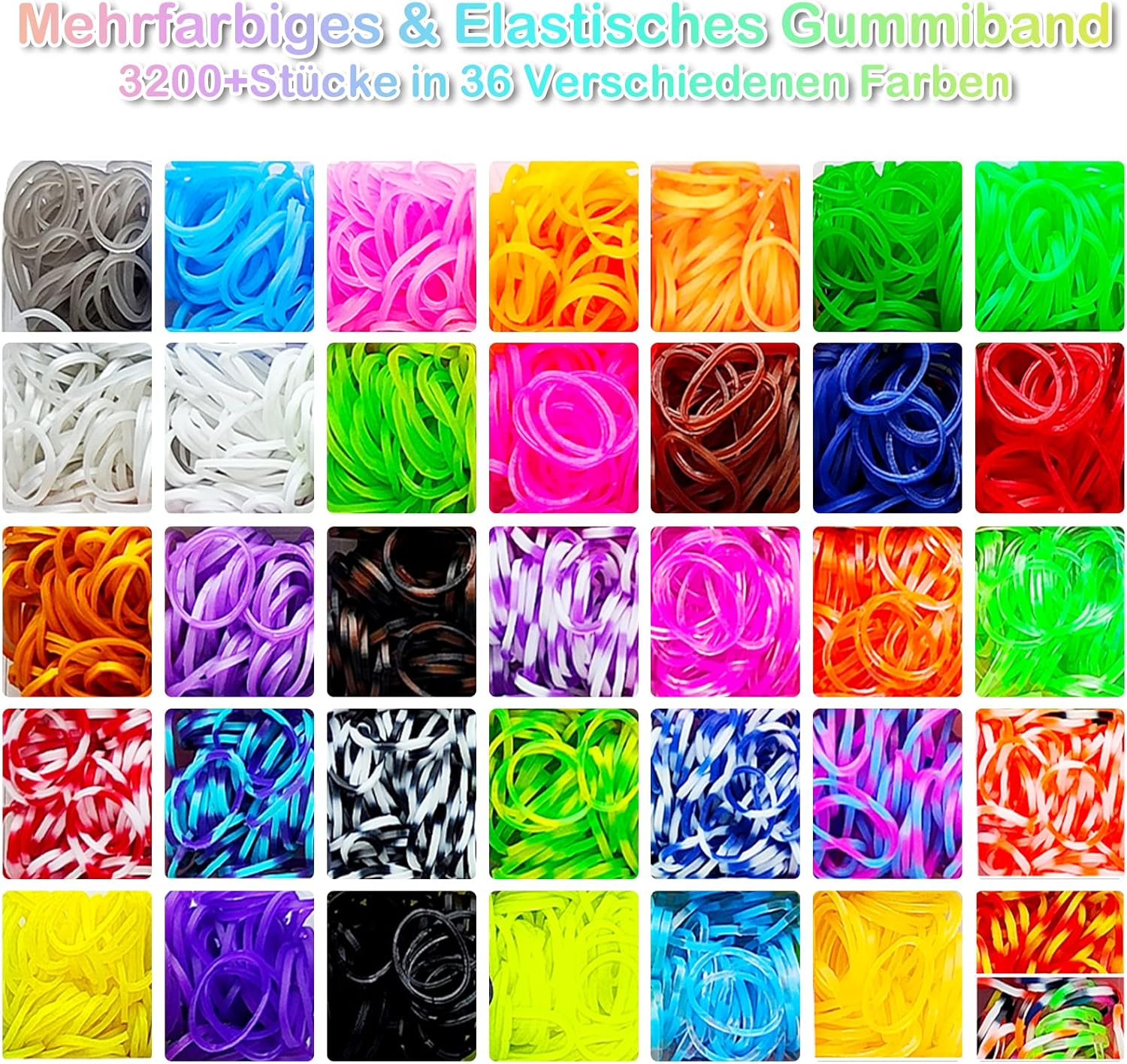 Il kit di braccialetti elastici 3600+ contiene una scatola di immagazzinaggio, 3600+ elastici colorati di alta qualità (più di 36 colori), 40 perline con lettere, 40 perline colorate, 30 perline rotonde colorate, 5 perline di frutta, 5 perline di fiori, 4 frange, 8 frutti. Ciondoli sagomati, 10 graziosi pendenti (casuali), 4 nappe, 6 strumenti a forma di Y, 90 clip a S, 6 uncinetti, 5 ganci colorati, 5 cordini. Materiale di alta qualità. Cinturino in gomma siliconica di alta qualità con buona elasticità. Può essere utilizzato ripetutamente, morbido e resistente e non facile da rompere, garantendo la sicurezza dei bambini. Bellissimi colori, difficili da sbiadire. Sicuro e non aromatizzato. Stimola la creatività Questo kit per realizzare braccialetti con telaio ha una varietà di colori, creerà un sacco di cose divertenti, come braccialetti, collane, fasce per capelli, accessori per borse e molti altri ornamenti, il braccialetto elastico intrecciato può aiutare i tuoi bambini a migliorare la coordinazione occhio-mano, stimolare la loro immaginazione e creatività. Puoi progettare e creare braccialetti di gomma colorati, giocattoli e molto altro ancora! Comodo da riporre Gli elastici e i ciondoli arcobaleno sono ordinatamente conservati in una scatola di plastica trasparente con una griglia da 54. Ogni colore è conservato in uno scomparto separato. Questo rende più facile il riordino e aiuta i bambini a sviluppare l'abitudine di organizzare le proprie cose. Kit per realizzare braccialetti con telaio elastico per ragazze e ragazzi di età 5 6 7 8 9 10 11 12 anni. Elastico per scatola bracciale e bellissimo regalo: I telai sono distribuiti in una scatola di plastica che permette di chiuderli, aprirli e trasportarli. Permette inoltre ai bambini di sviluppare buone abitudini organizzative e questo kit di braccialetti elastici intrecciati per bambini è perfetto per principianti ed esperti fai da te ed è anche un'ottima scelta per un regalo o una festa con gli amici