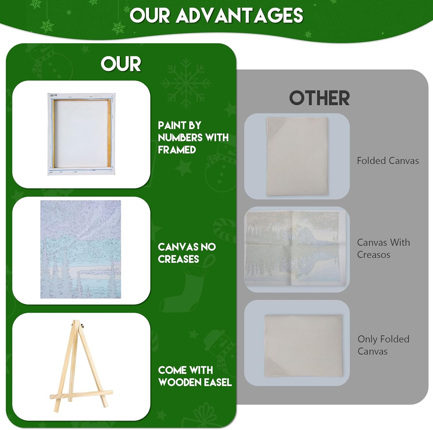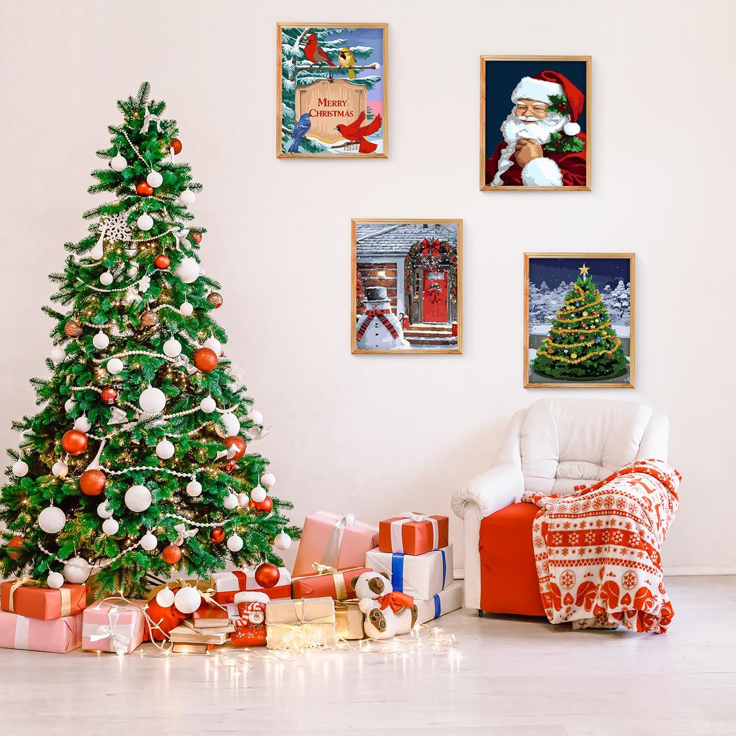 Kit per dipingere con i numeri per adulti - Il kit per dipingere con i numeri è un ottimo modo per rilassarsi. Può aiutare ad adattarsi emotivamente. È divertente e facile, un nuovo hobby per donne, adulti e principianti dell'arte. Divertitevi a creare un'opera d'arte straordinaria, tutti possono diventare bravi artisti. Regali e decorazioni di Natale - Il dipinto finito sembra un'opera d'arte professionale, eccellente decorazione natalizia per la casa. I kit di pittura per adulti possono essere un regalo significativo per i vostri genitori, amanti e amici Facile da dipingere - La tela testurizzata prestampata mostra esattamente dove dipingere ogni colore. Questo kit per dipingere con i numeri è adatto a tutti, non importa l'età o l'abilità di disegno. È sufficiente dipingere seguendo i numeri sulla tela per creare da soli un dipinto eccellente Cosa riceverete - 4 pacchetti di pittura natalizia (Colibrì, Pupazzo di neve, Babbo Natale, Albero di Natale), tela predelineata su telaio, cavalletto in legno da 1 pezzo, 4 set di colori acrilici, 16 pennelli di alta qualità, 4 cartoline guida a colori per riferimento, il tutto confezionato in una scatola di carta Tela incorniciata senza pieghe - A differenza di altre tele piegate o arrotolate, forniamo kit di pittura incorniciati per numeri, che non richiedono stiratura e possono essere appesi direttamente alla parete come dipinti decorativi dopo la finitura