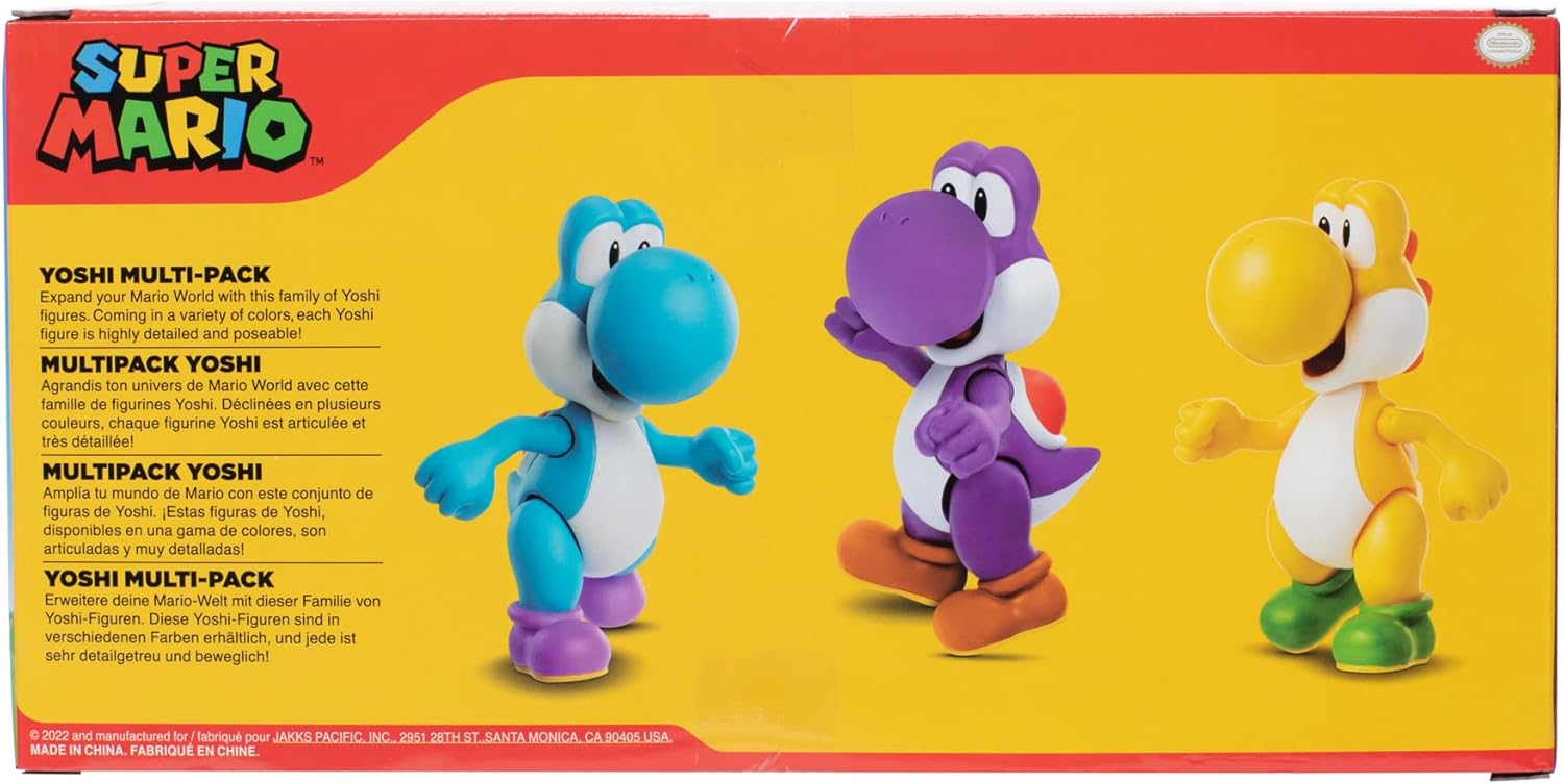Set Yoshi collezione: Scopri il fantastico mondo di Yoshi con il nostro set di 3 personaggi! Ogni confezione include Yoshi azzurro, Yoshi giallo e Yoshi viola. Aggiungi vivacità alla tua collezione di action figure Yoshi. Design dettagliato: Le action figure Yoshi sono realizzate con dettagli sorprendenti e colori brillanti. Porta a casa un pezzo di magia Super Mario e goditi la qualità artigianale di ogni Yoshi da 10 cm. Materiale di Alta Qualità: I personaggi di Yoshi sono realizzati con materiali resistenti, garantendo una lunga durata e sicurezza per i più piccoli. Aggiungi un tocco di avventura Nintendo alla tua collezione Super Mario. Regalo Ideale: Sorprendi i tuoi amici e familiari con questo set di 3 personaggi di Yoshi. Un regalo perfetto per compleanni o festività, che farà felici sia i bambini che gli adulti appassionati di Super Mario. Versatile e Divertente: Oltre a essere una fantastica aggiunta alla tua collezione, questi Yoshi possono essere usati per giocare e ricreare le avventure di Super Mario. Unisciti a Yoshi e vivi emozionanti avventure Nintendo!