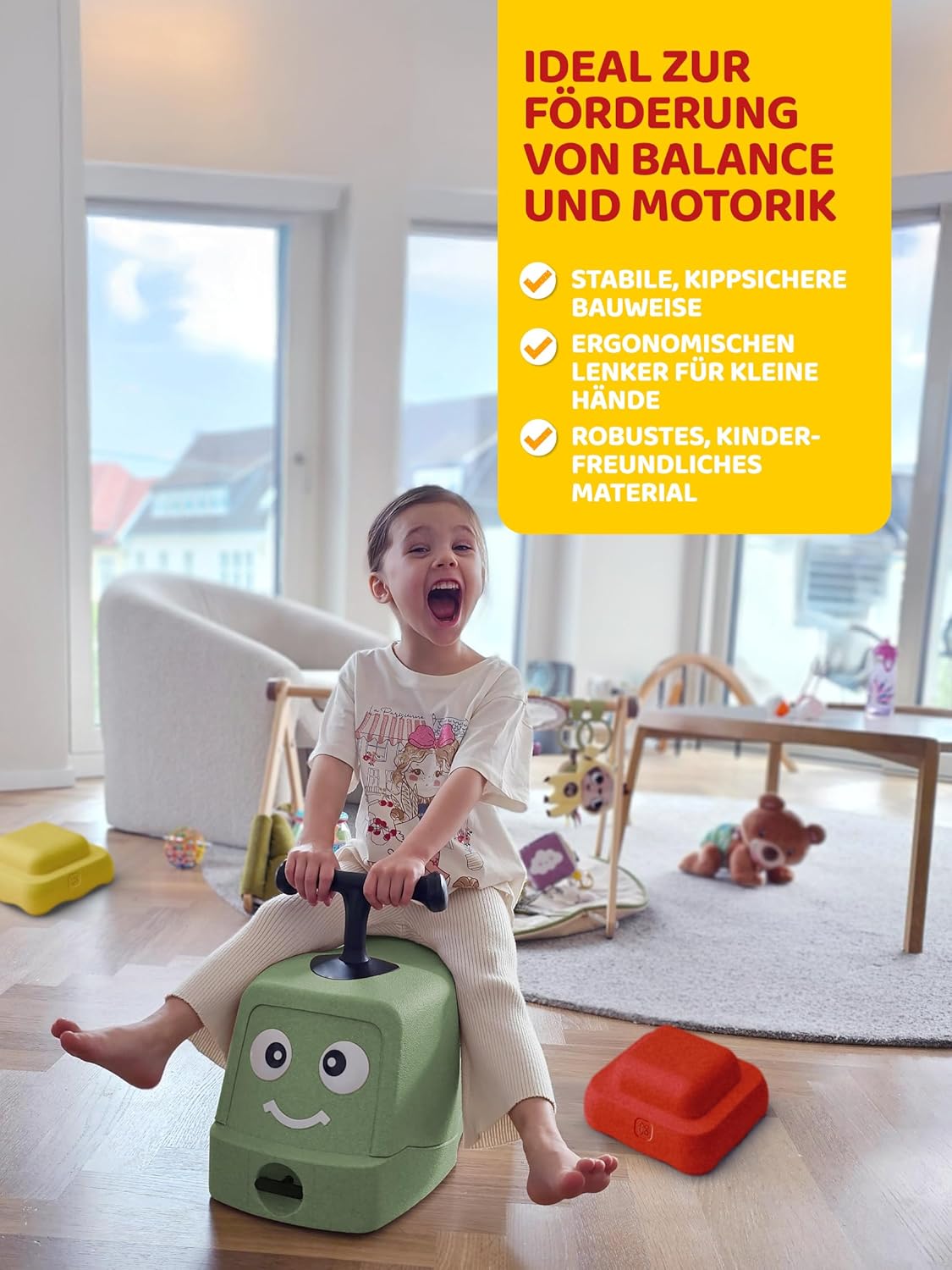 Il multifunzione 4 in 1 – girello, auto cavalcabile, monopattino a dondolo, girello e seggiolino in uno – accompagna i bambini in ogni fase dello sviluppo. Guida silenziosa: le ruote ultra-smorzate e silenziose offrono una mobilità silenziosa anche su pavimenti duri. Veicolo scivolo compatto per interni - Ideale per interni: sicuro, manovrabile e poco ingombrante quando si gioca in tutta la stanza. Portata fino a 20 kg - La struttura robusta sostiene i bambini piccoli fino a 20 kg in modo affidabile e duraturo, le ruote girevoli a 360° sono facili da sterzare e antiribaltamento. Pratico spazio di archiviazione - Spazio di archiviazione integrato sotto il sedile: spazio per i tuoi giocattoli preferiti sempre a portata di mano.