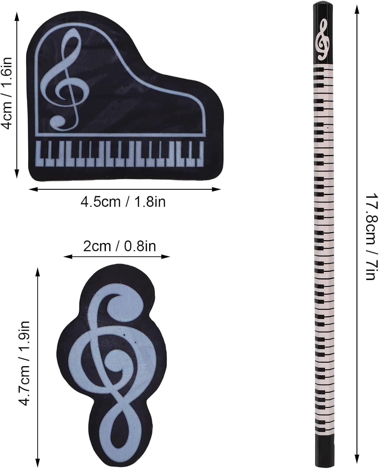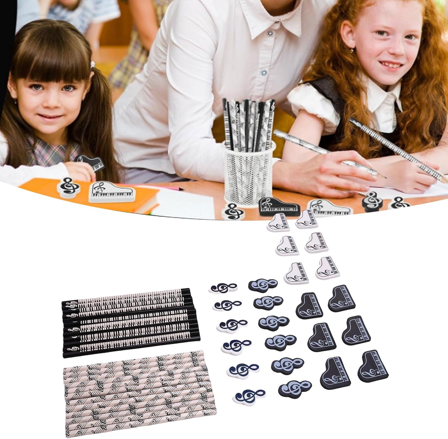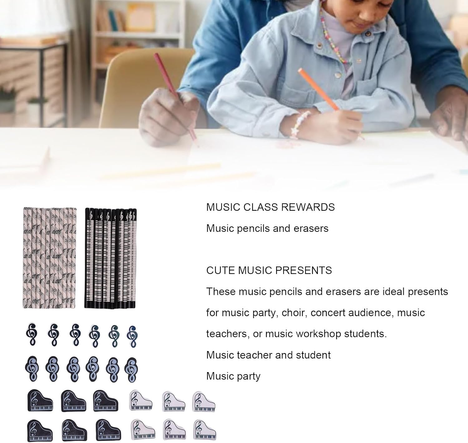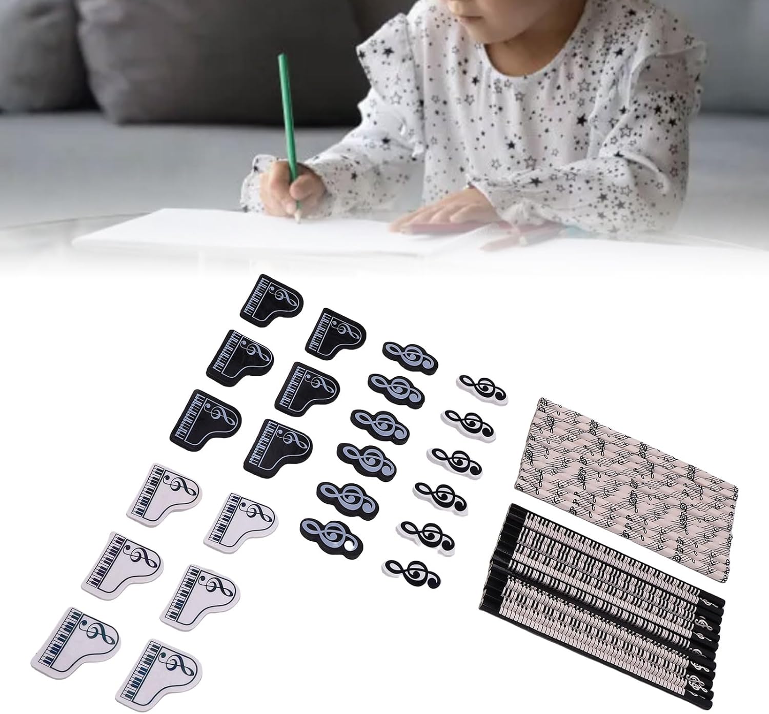 [Afferma comoda] La forma esagonale delle matite offre una presa comoda per sessioni di scrittura estese, impedendo loro di rotolare via i tavoli. [Tema musicale accattivante] con design in bianco e con note musicali e motivi per tastiera per pianoforte, questo set offre un'estetica unica e creativa. [Ampia varietà di scelte] con 24 matite in due stili e 24 gomme in stili, questo set si rivolge a tutte le esigenze di scrittura e cancellazione. [Premium Craftsmanship] realizzato in legno e gomma premium, le matite offrono prestazioni di scrittura fluide e le gomme assicurano cancellazioni ordinate. [Idea] Ideale per appassionati di musica, studenti o artisti, questo set è sid per scuola, casa o come oggetto da collezione unico.