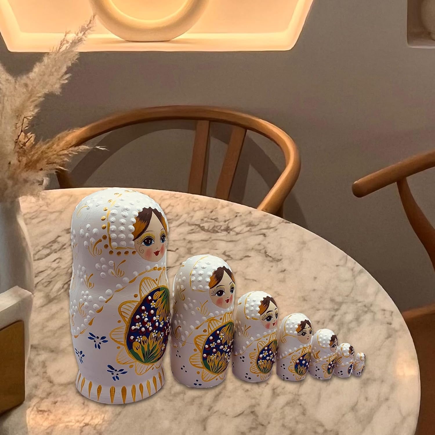 Come pezzo decorativo culturale per la casa o l'ufficio, queste bambole impilabili aggiungono un tocco artistico a qualsiasi stanza che crea una rosa calda e accogliente. Realizzato in legno, bella decorazione per la casa. Un set di 7, bambole nidificanti dipinte a mano che mostrano la cultura russa. Per collezionisti e amanti dell'arte, queste bambole Matryoshka parlano a coloro che apprezzano dispositivi culturali unici e vogliono possedere un pezzo di tradizione russa. Non solo servono come un affascinante oggetto di visualizzazione, ma queste bambole di nidificazione russe offrono anche un'esperienza coinvolgente quando si rivela ogni figura più piccola nella figura più grande, il che rende una deliziosa scoperta per tutte le età.