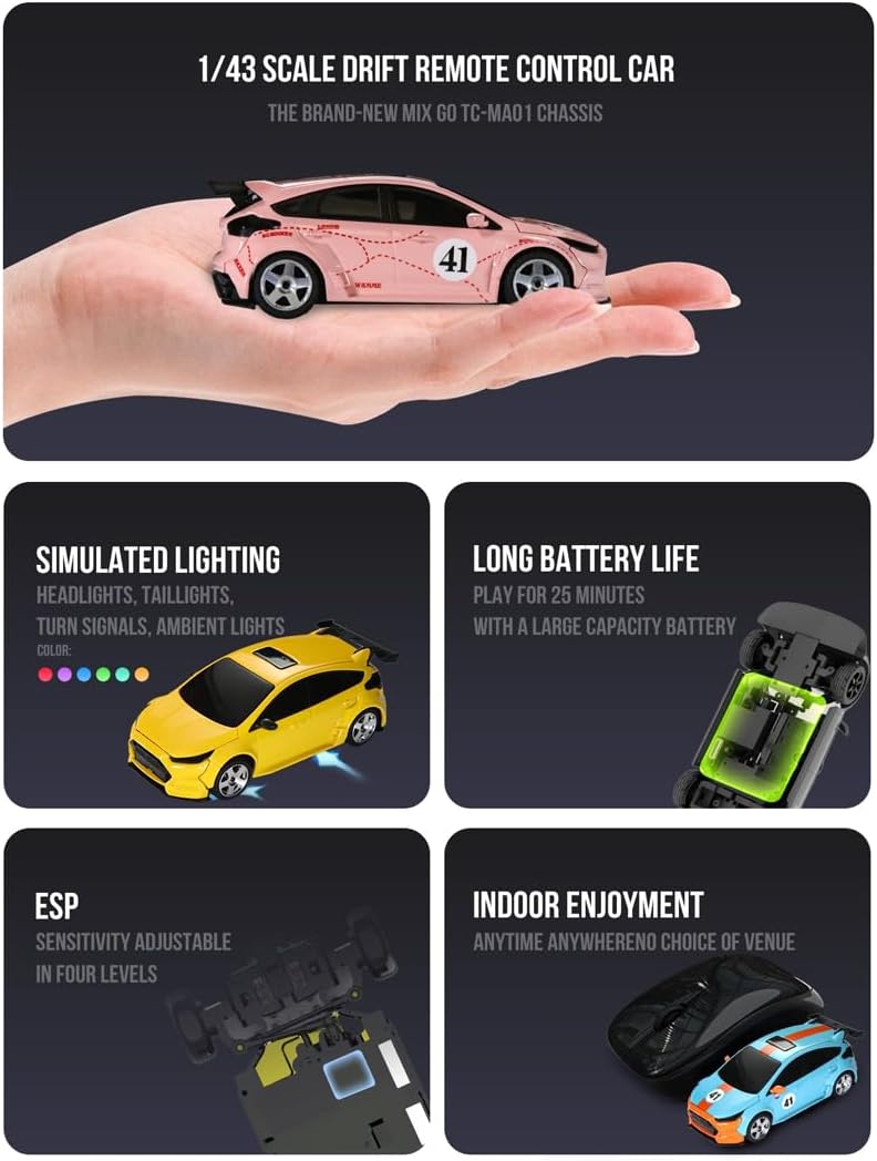 Modalità mini drifting e corsa: design compatto da 11,6 × 5,3 × 3,7 cm con sterzo a pieno titolo, che consente di passare senza problemi tra modalità corsa e deriva per un'esperienza di guida dinamica e reattiva. ✅ 【Illuminazione a LED realistica】: con fari, indicatori di direzione, luci dei freni, luci di retromarcia e illuminazione ambientale multicolore che aumenta il realismo e rende la guida più intensa di notte. Prestazioni ad alte prestazioni: dotato di un sistema a motore centrale 4WD e di una batteria al litio da 15.500 mAh che offre fino a 25 minuti di riproduzione (15 minuti in modalità FPV) per un divertimento prolungato senza ricarica frequente. Controllo preciso da 2,4 G: il telecomando ergonomico con leva dell'acceleratore e sterzo proporzionali garantisce una maneggevolezza fluida e precisa e offre un'eccellente manovrabilità durante la deriva e la corsa. Sospensione avanzata: la sospensione indipendente a doppio braccio trasversale imita il movimento di una vera auto, mentre il sistema di fibbia anteriore e guscio magnetico posteriore consentono uno smontaggio e una regolazione rapidi senza attrezzi.