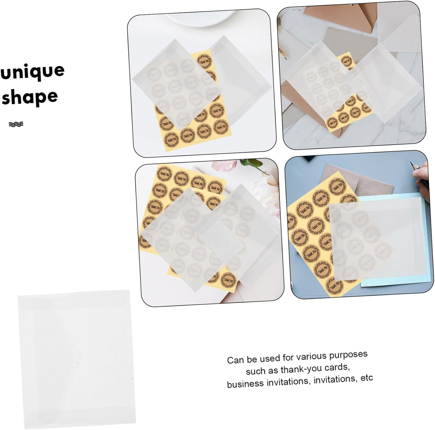 Buste trasparenti per inviti: ampiamente utilizzate per inviti di compleanno, biglietti di ringraziamento, biglietti di congratulazioni, inviti di nozze, lettere, buste per lettere Buste per festival: la busta per biglietti d'invito è realizzata con materiale di carta da lucido per un uso sicuro e pratico, buste per lettere fotografiche Buste di auguri: buste dallo stile semplice, adatte a varie occasioni, le buste classiche sono realizzate con materiale cartaceo, eleganti, involucri trasparenti per inviti Busta per inviti: realizzata in carta da lucido di per un aspetto unico ed elegante, crea un look elegante, buste trasparenti Buste per la casa: realizzate in carta retrò e traslucida, queste buste hanno un aspetto unico e di buon gusto, buste per contanti