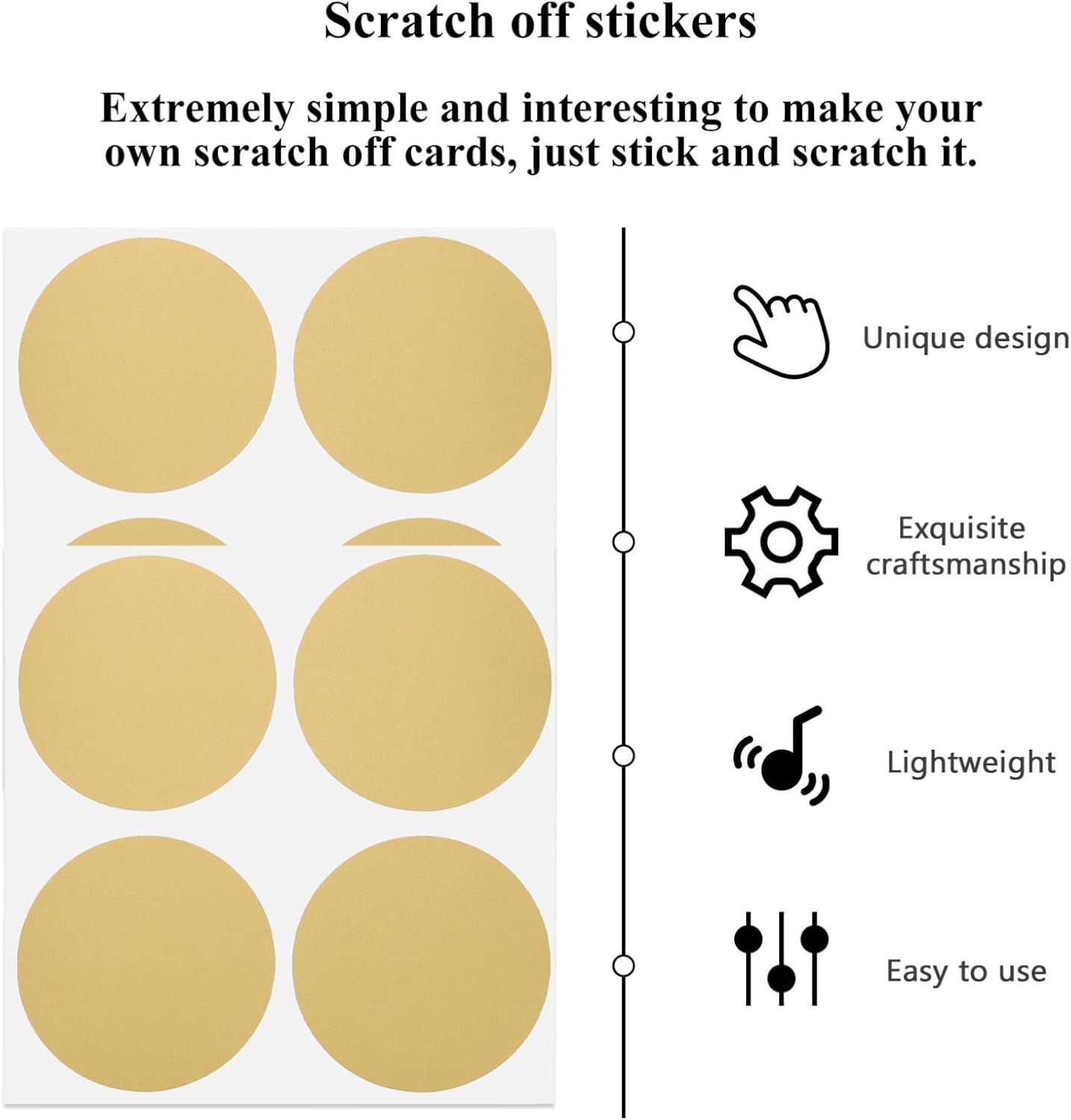 Adesivi rotondi da grattare: attacca il lato adesivo sulle parole che vuoi tenere nascoste e gratta con una moneta quando necessario. Adesivi circolari: questi adesivi da grattare portano più gioia alla tua festa, adatti per compleanni, matrimoni e altre occasioni. Gratta-- c'è una pellicola tra lo da grattare e la carta, i tuoi contenuti sono ben protetti. Adesivi da grattare: questi adesivi possono anche rivelare indizi sul di un neonato, un ottimo strumento per interagire con la famiglia o gli amici. Adesivo da grattare per giochi: estremamente semplice e interessante per creare i tuoi biglietti da grattare, basta incollarli e grattarli.