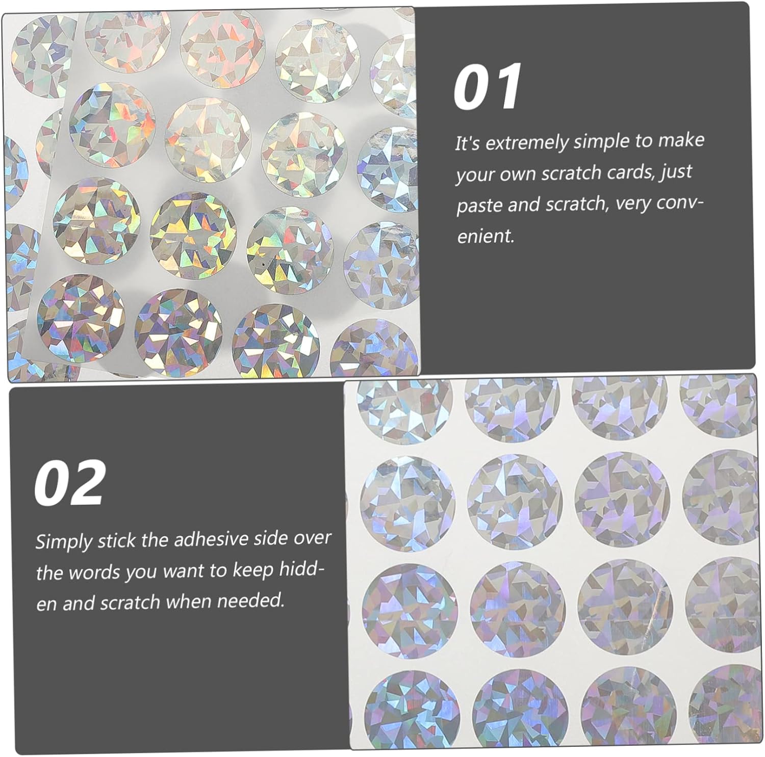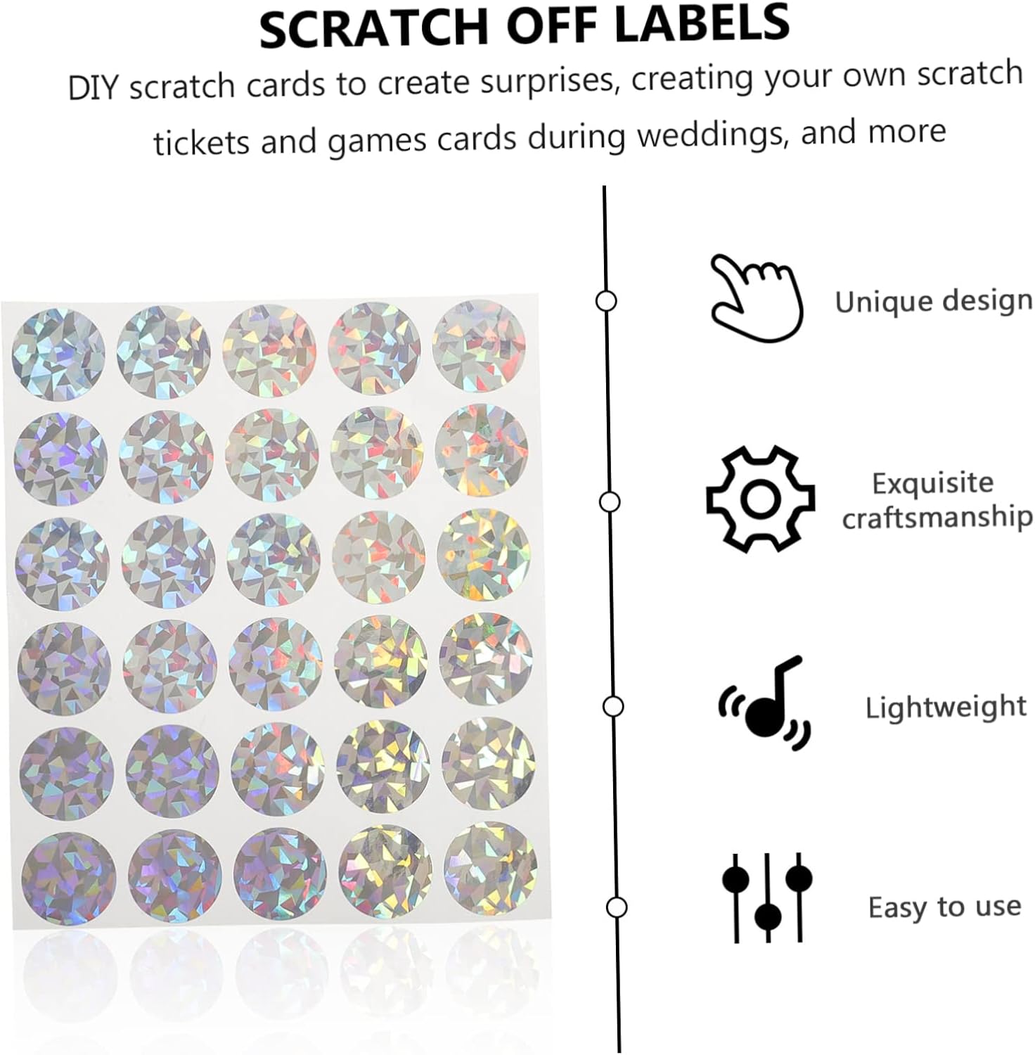 Etichette gratta e vinci: è estremamente semplice creare i tuoi gratta e vinci, basta incollare e grattare, molto comodo, adesivi gratta e vinci circolari Adesivi fai da te per rivelare il genere: gratta e vinci fai da te per creare sorprese, creare i tuoi gratta e vinci e carte da gioco durante i matrimoni e altro ancora, giochi da grattare adesivi Stacca e attacca le etichette fai da te: questi adesivi possono anche rivelare indizi per una caccia o il di un neonato, un buon strumento per interagire con i tuoi ospiti, etichette adesive fai da te Adesivi da grattare di compleanno: per decorare il tuo album, fai da te le tue carte della personalità, cartoline, lettere, giochi di matrimonio, adesivi da grattare Adesivi gratta e vinci: attacca semplicemente il lato adesivo sulle parole che vuoi tenere nascoste e gratta quando necessario, gratta i biglietti