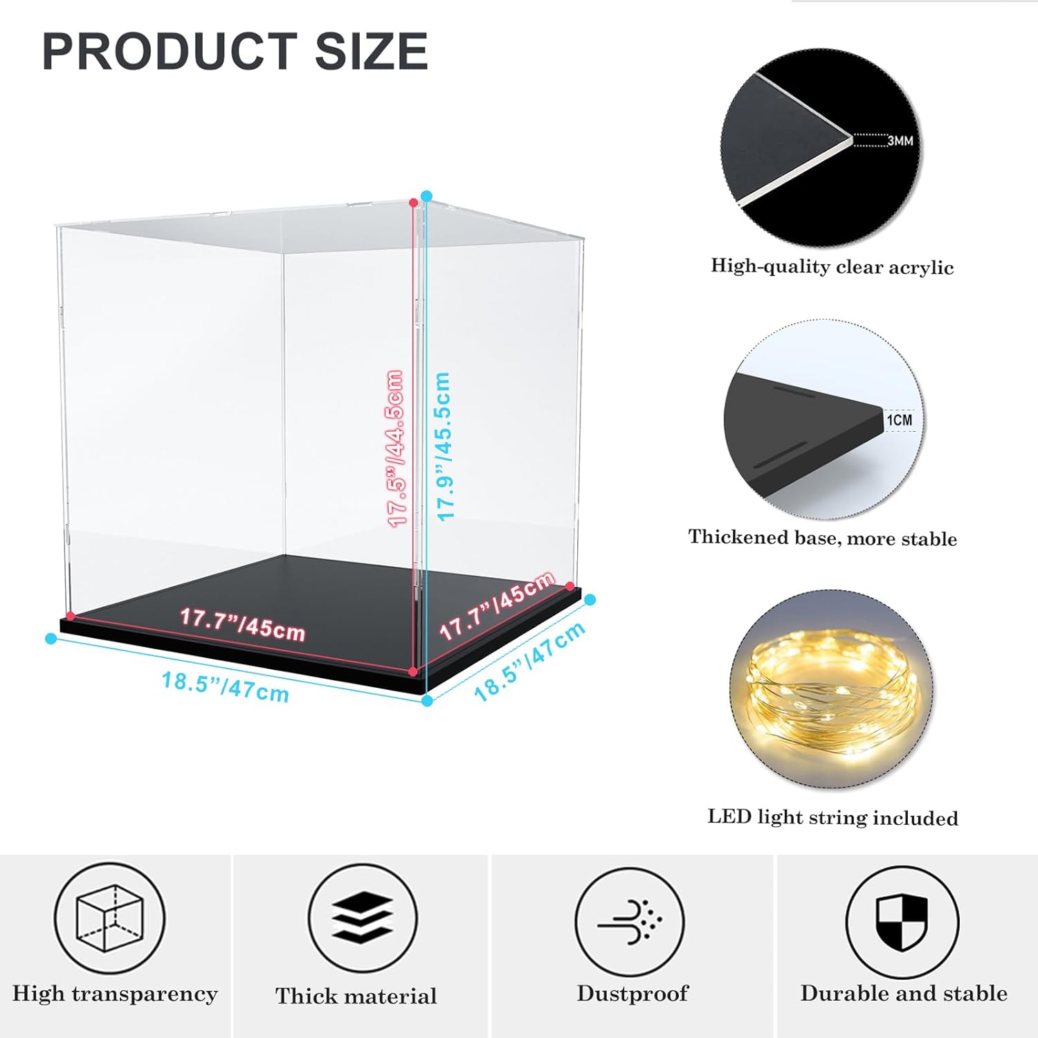 【Materiali di alta qualità】 La vetrina da collezione in acrilico è realizzata in materiale acrilico spesso 3 mm, con una trasmittanza del 95% che può mostrare più chiaramente i tuoi oggetti da collezione preferiti. Inoltre, la base in legno e plastica ispessita lo rende robusto e durevole. 【Dimensioni】Le dimensioni interne della vetrina da collezione in acrilico trasparente sono 45x45x44,5 cm / 17,7"Lx17,7"L lontano dalla polvere, riducendo i danni UV e rallentando l'invecchiamento della plastica. Inoltre, il pannello acrilico ha una pellicola protettiva su entrambi i lati per evitare graffi. 【Multiuso】 Queste scatole da esposizione trasparenti si adattano magnificamente. mostra la tua preziosa collezione. Ideale per riporre la tua collezione di giocattoli, personaggi pop, modelli Lego, bambole e altro ancora.