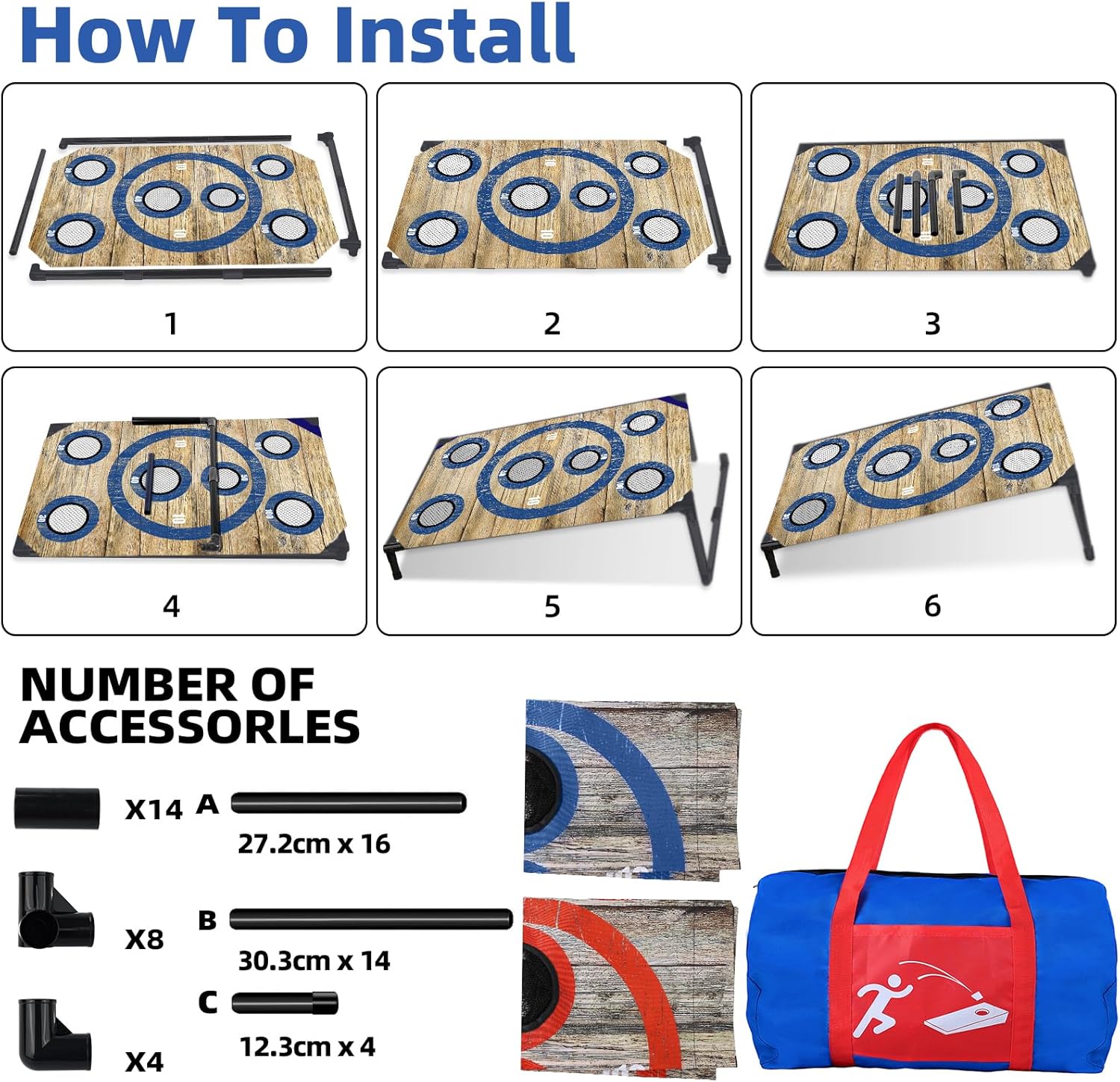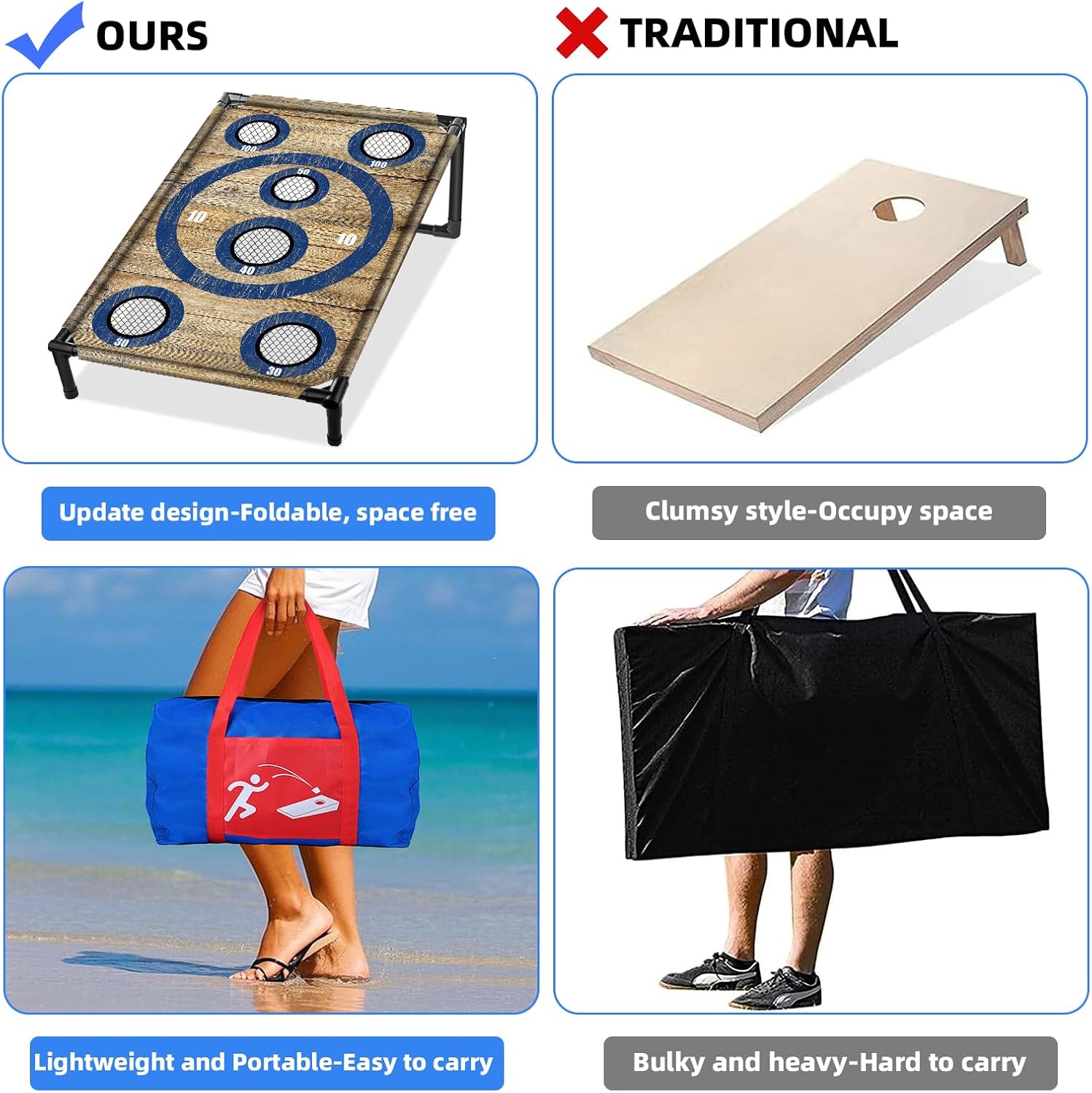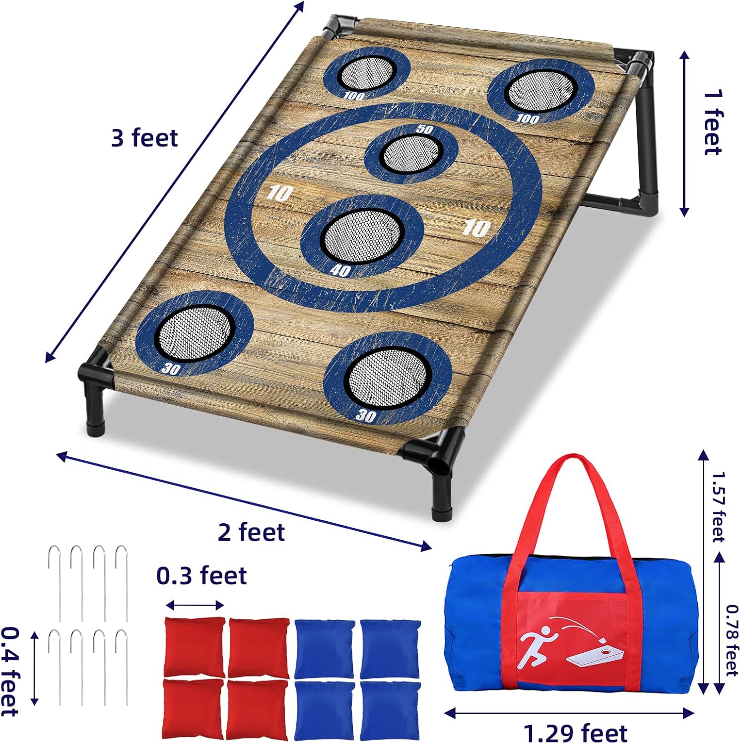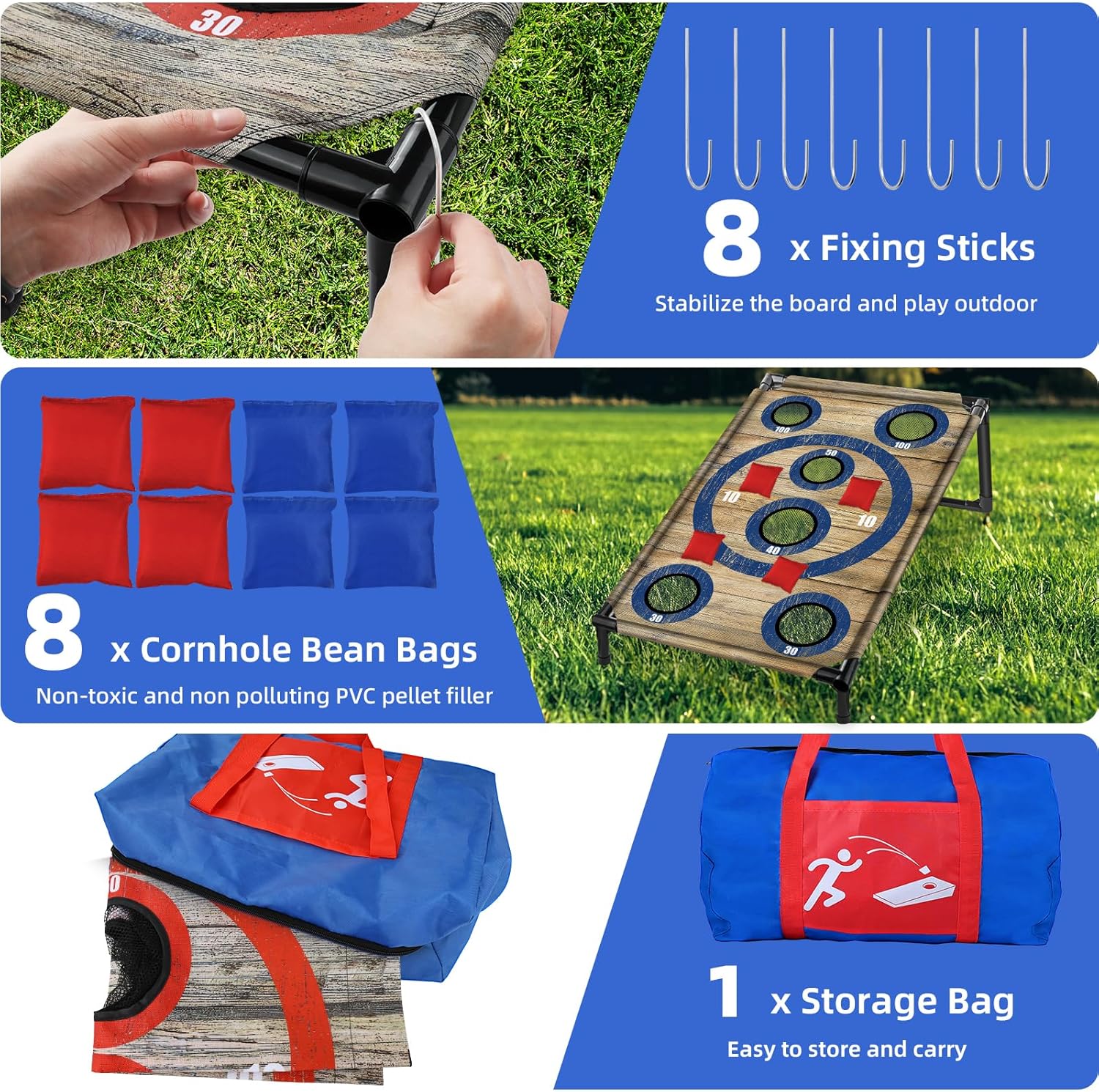 【Elenco prodotti】 2 tavole da cornhole staccabili, 8 sacchetti di fagioli premium (4 rossi e 4 blu), 1 borsa portaoggetti e 8 picchetti di metallo per migliorare la stabilità. Nota: per garantire stabilità durante il gioco, assicurarsi di stringere il giunto di testa durante l'installazione. 【Portabilità imbattibile】 Realizzato con un tessuto Oxford 420D per le tavole, che non è solo impermeabile di livello professionale ma anche altamente resistente allo strappo e antiscivolo, e un telaio in PVC che è sia robusto che leggero. È molto più comodo da trasportare rispetto ai ingombranti set in legno, rendendolo perfetto per i viaggi. 【Divertimento infinito per 2-4 giocatori】 Con un'elevata giocabilità e valore di intrattenimento, questo gioco di cornhole è perfetto per 2-4 giocatori. Offre ore di gioco coinvolgente che intrattiene tutti. Le regole semplici ma entusiasmanti lo rendono accessibile a giocatori di tutte le età, assicurando che tutti possano unirsi al divertimento. Non è solo un gioco; è una fonte di risate e competizione amichevole. 【Ideale per scene al chiuso e all'aperto】 Che tu stia organizzando una festa in giardino, facendo un picnic al parco, godendoti una giornata in spiaggia o andando in campeggio durante i fine settimana estivi o le vacanze, il nostro set di gioco del cornhole è il compagno perfetto. È ugualmente adatto per l'uso in interni, come in un seminterrato o in un soggiorno in una giornata piovosa. Si adatta a qualsiasi ambiente, portando gioia e intrattenimento in ogni occasione. 【Perfetto per tutta la famiglia】 Questo prodotto è un must per le attività in famiglia. È ugualmente amato da adulti e bambini, il che lo rende una scelta ideale per il tempo di legame familiare. Incoraggia l'interazione e la cooperazione tra i membri della famiglia, creando ricordi duraturi durante le vacanze estive, le riunioni del fine settimana o qualsiasi celebrazione delle vacanze. È un ottimo modo per riunire la famiglia lontano dagli schermi e godersi del tempo di qualità.