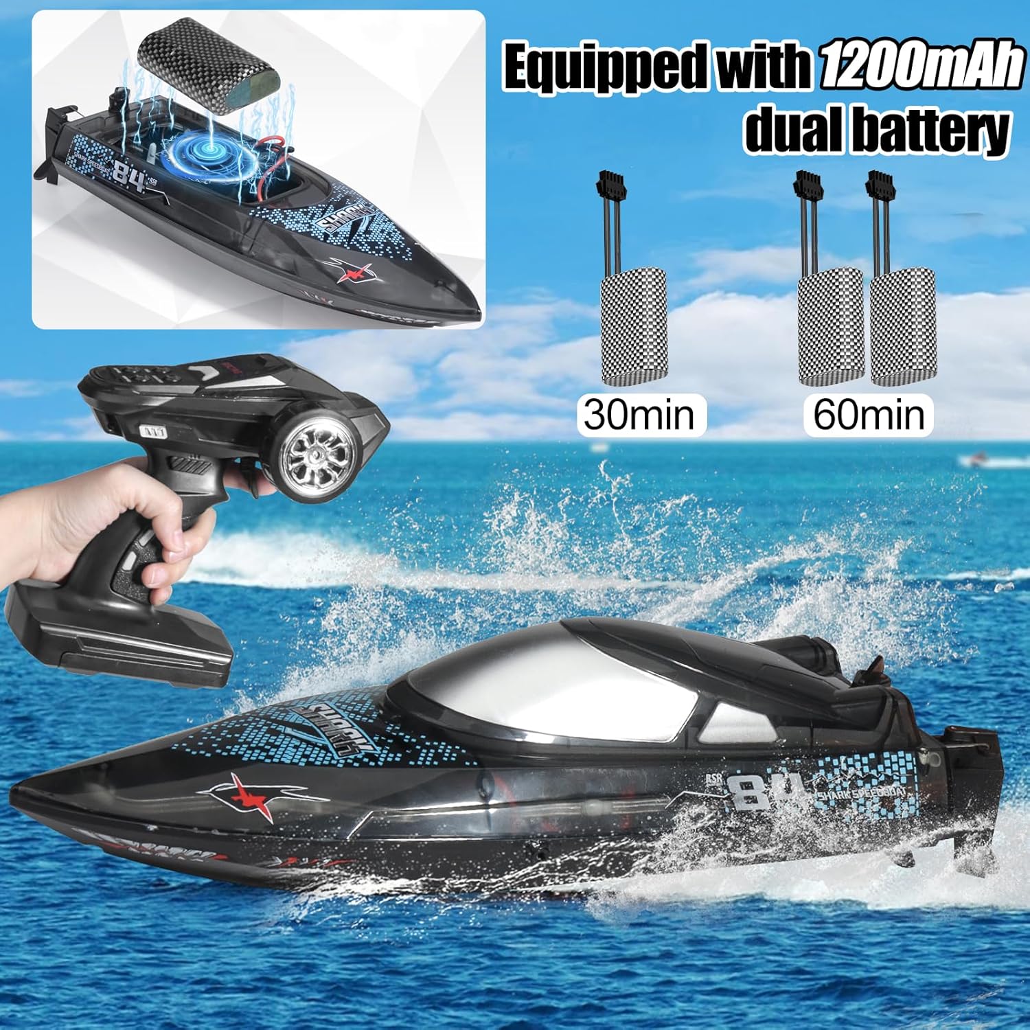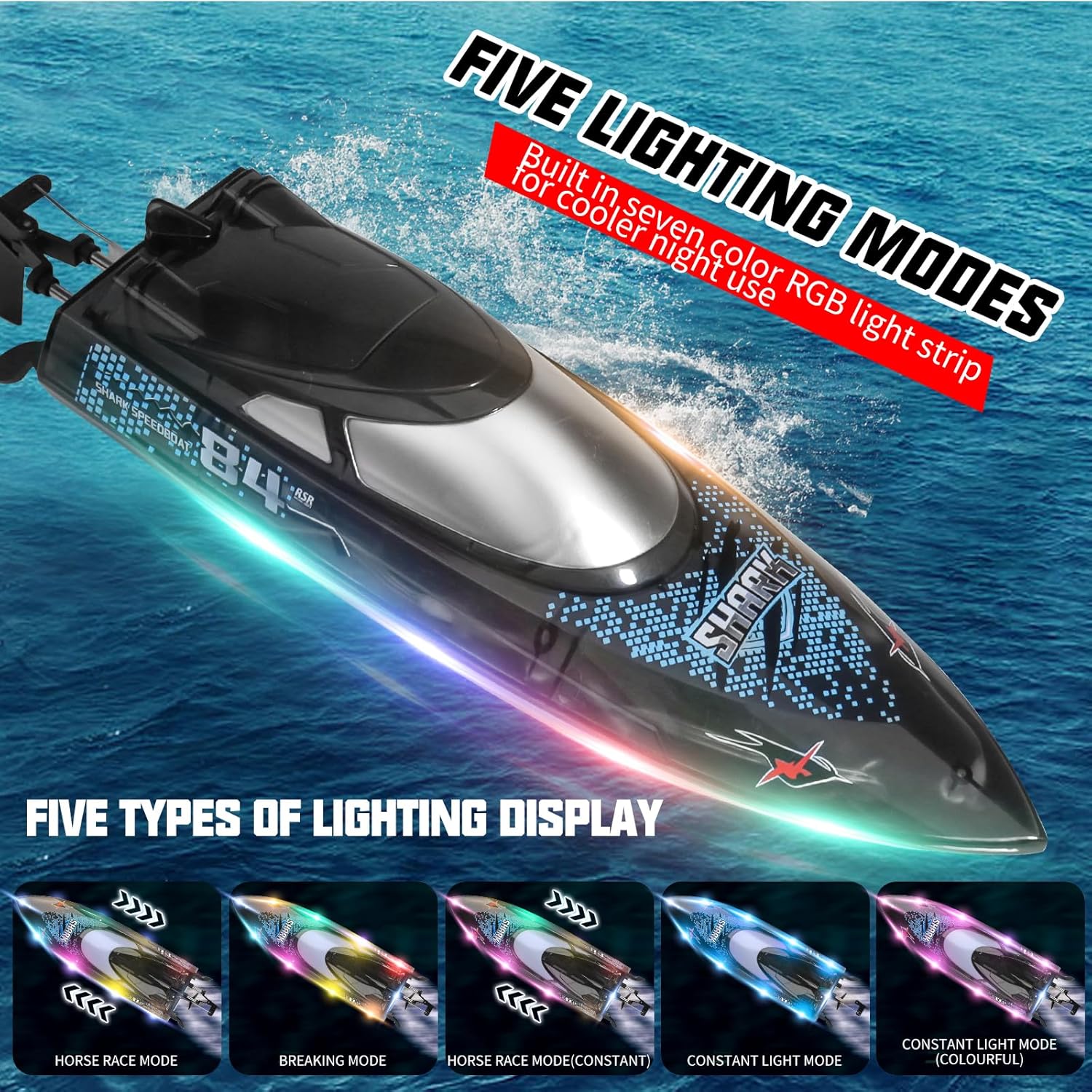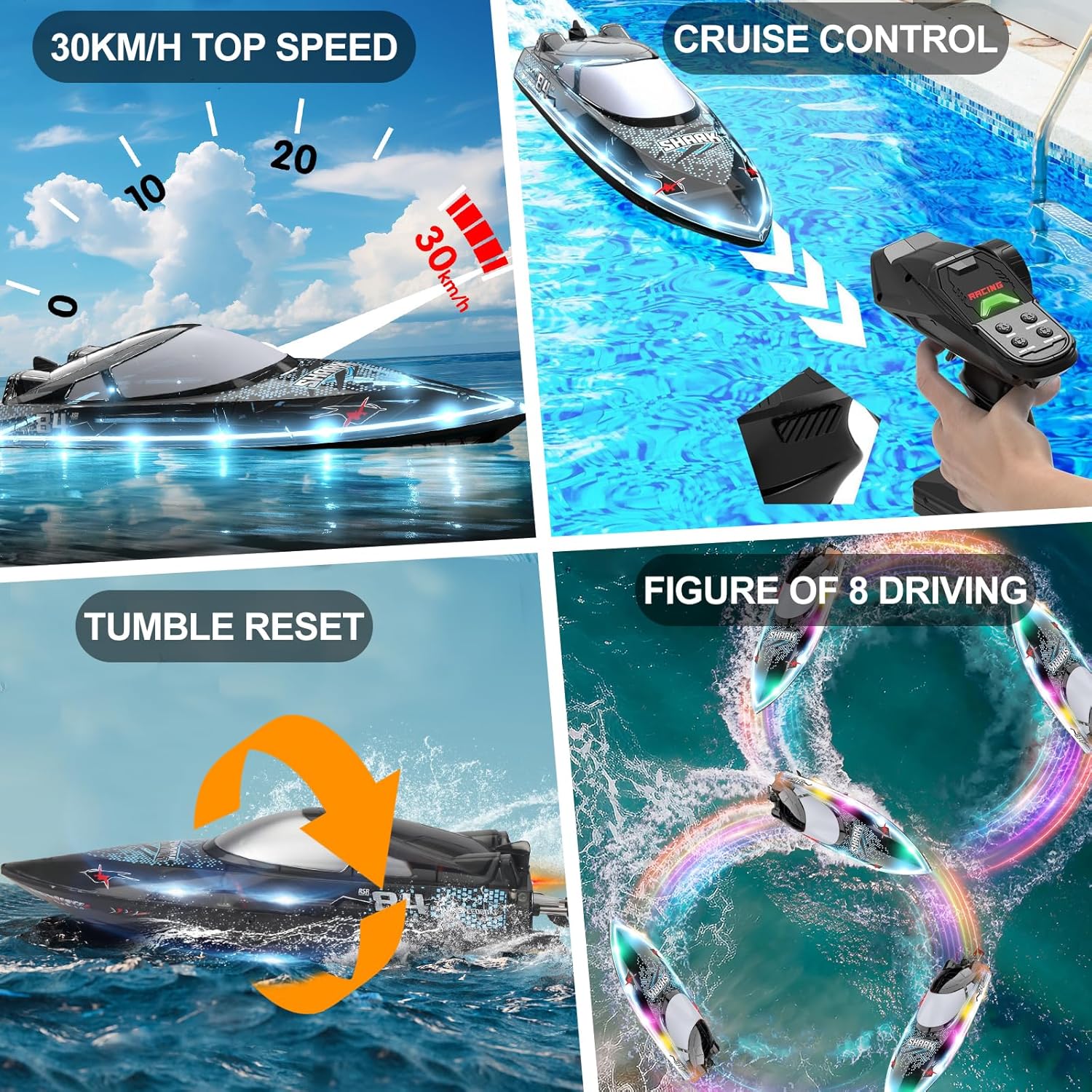 【Barca squalo radiocomandata luminosa】 La barca telecomandata ad alta velocità è caratterizzata da graffiti di squali che sono amati dai bambini, dotata di luci a LED a sette colori e supporta 5 modalità di illuminazione, consentendo a voi e al vostro bambino di godere del divertimento acquatico notturno al massimo. 【Dimostrazione acrobatica multifunzionale】Il motoscafo telecomandato può raggiungere un'alta velocità di 30 km/h grazie a un potente motore, supporta la commutazione a 3 velocità ed è dotato di funzioni di rollio e controllo della velocità di crociera con un clic. La dimostrazione con un clic può seguire automaticamente il percorso a forma di 8, e la velocità e il controllo dell'acqua sono un'esperienza emozionante. 【Funzione super impermeabile】 La barca RC adotta una copertura impermeabile completamente chiusa in EVA e una forte chiusura a torsione, impedendo efficacemente all'acqua di entrare all'interno. Il design del rilevamento dell'acqua avvia il motore solo in acqua, impedendo un funzionamento errato ed essendo amichevole per i bambini e i principianti. 【Divertimento duraturo】 Dotato di 2 batterie al litio ricaricabili da 1200 mAh, che garantiscono almeno 60 minuti di gioco. Il dispositivo di circolazione raffreddato ad acqua riduce efficacemente le perdite del motore, prolunga la durata di vita ed è dotato di un sistema di allarme di batteria scarica per ricordare di tornare e ricaricare in modo tempestivo quando la batteria è scarica 【Giochi e regali multigiocatore】 La barca telecomandata a 2,4 GHz utilizza segnali di controllo remoto ad alta frequenza, consentendo di competere con gli amici in giochi multigiocatore. La distanza del telecomando può raggiungere i 150 metri, favorendo l'esplorazione di acque più profonde come laghi e stagni. È anche il regalo ideale per i bambini di tutte le età.