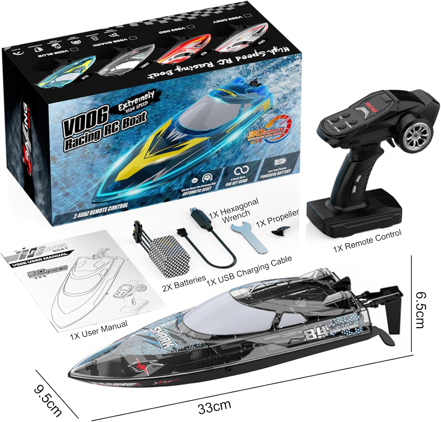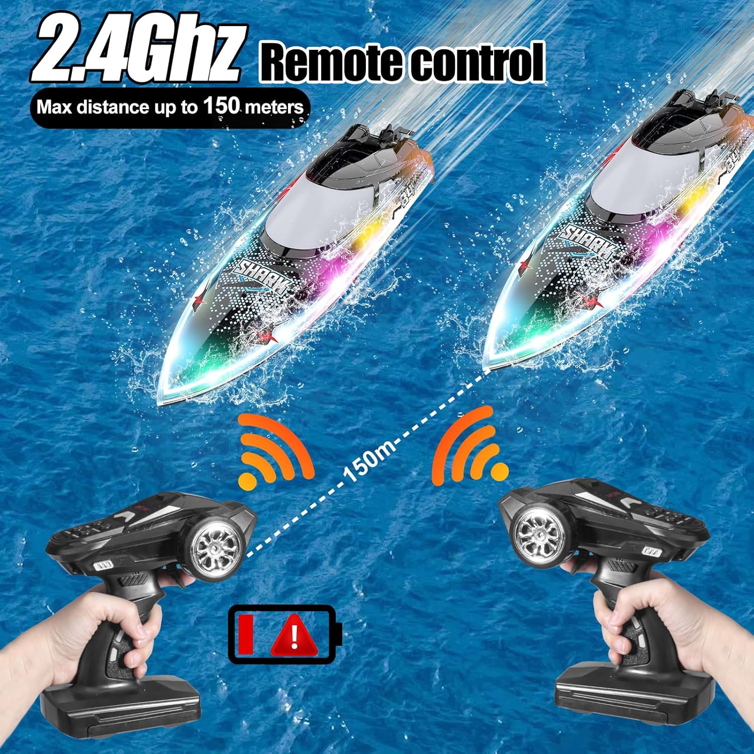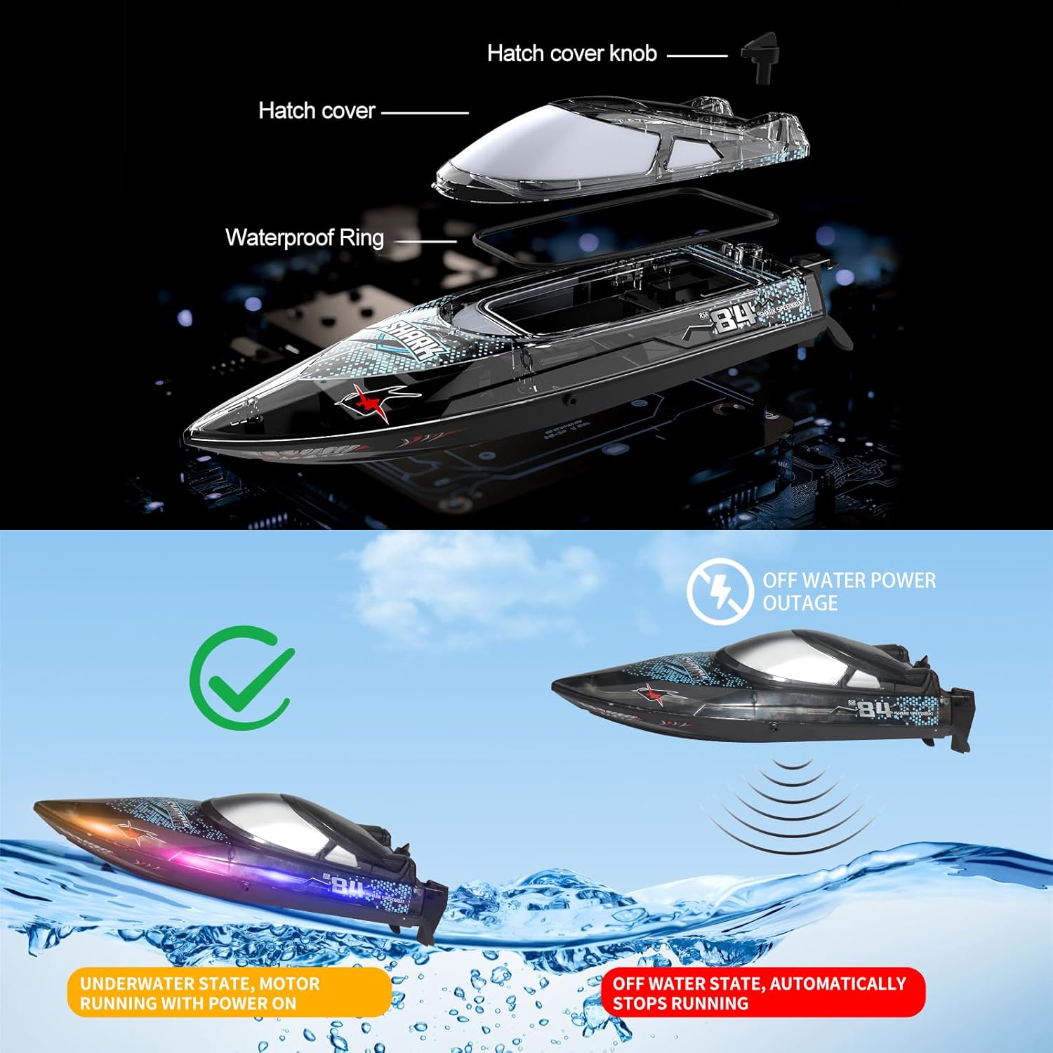 【Barca squalo radiocomandata luminosa】 La barca telecomandata ad alta velocità è caratterizzata da graffiti di squali che sono amati dai bambini, dotata di luci a LED a sette colori e supporta 5 modalità di illuminazione, consentendo a voi e al vostro bambino di godere del divertimento acquatico notturno al massimo. 【Dimostrazione acrobatica multifunzionale】Il motoscafo telecomandato può raggiungere un'alta velocità di 30 km/h grazie a un potente motore, supporta la commutazione a 3 velocità ed è dotato di funzioni di rollio e controllo della velocità di crociera con un clic. La dimostrazione con un clic può seguire automaticamente il percorso a forma di 8, e la velocità e il controllo dell'acqua sono un'esperienza emozionante. 【Funzione super impermeabile】 La barca RC adotta una copertura impermeabile completamente chiusa in EVA e una forte chiusura a torsione, impedendo efficacemente all'acqua di entrare all'interno. Il design del rilevamento dell'acqua avvia il motore solo in acqua, impedendo un funzionamento errato ed essendo amichevole per i bambini e i principianti. 【Divertimento duraturo】 Dotato di 2 batterie al litio ricaricabili da 1200 mAh, che garantiscono almeno 60 minuti di gioco. Il dispositivo di circolazione raffreddato ad acqua riduce efficacemente le perdite del motore, prolunga la durata di vita ed è dotato di un sistema di allarme di batteria scarica per ricordare di tornare e ricaricare in modo tempestivo quando la batteria è scarica 【Giochi e regali multigiocatore】 La barca telecomandata a 2,4 GHz utilizza segnali di controllo remoto ad alta frequenza, consentendo di competere con gli amici in giochi multigiocatore. La distanza del telecomando può raggiungere i 150 metri, favorendo l'esplorazione di acque più profonde come laghi e stagni. È anche il regalo ideale per i bambini di tutte le età.