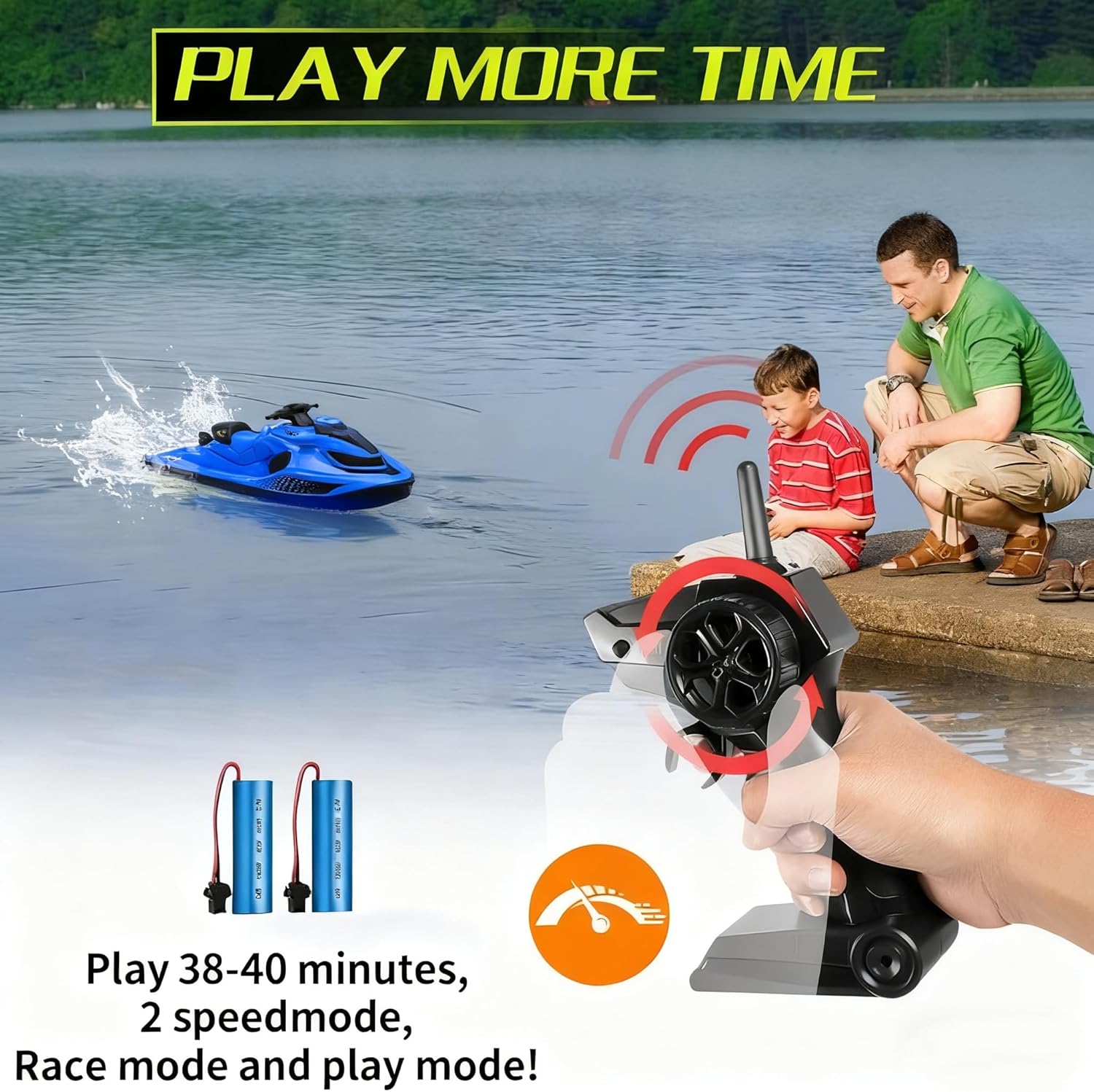 Giocattoli per barche telecomandate per bambini: controllo tramite telecomando wireless da 2,4 GHz, la portata del telecomando può raggiungere i 60 metri, il funzionamento del telecomando è semplice e più persone possono usarlo contemporaneamente senza disturbarsi a vicenda. Il telecomando richiede 2 batterie AA non incluse. Avviamento dell"acqua: il motore del giocattolo telecomandato per motoscafo si avvia solo quando tocca l"acqua e l"elica gira solo in acqua. Il design è sicuro e impedisce all'elica di ruotare sul pavimento e di ferire accidentalmente le dita. Inoltre, può proteggere efficacemente il motore e prolungare la durata di utilizzo. 2 batterie ricaricabili: lo yacht telecomandato viene fornito con 2 batterie, ciascuna da 3,7 V/600 mAh, che durano circa 20 minuti. Se la batteria è troppo scarica, emetterà un promemoria luminoso, in modo da poter tornare a casa in tempo senza paura di perdere la batteria. Modello a remi: la barca giocattolo è progettata secondo il design della barca a motore, motoscafo con due velocità regolabili, alta e bassa, che può realizzare la deriva e la rotazione e godere di un'esperienza di gioco d'acqua spensierata Come regalo: questa gara di barche giocattolo è ben confezionata, realizzata in robusta plastica ABS e presenta un design sofisticato, quindi è adatto come regalo per ragazzi e ragazze dai 6, 7, 8, 9, 10 anni