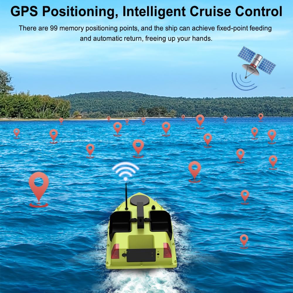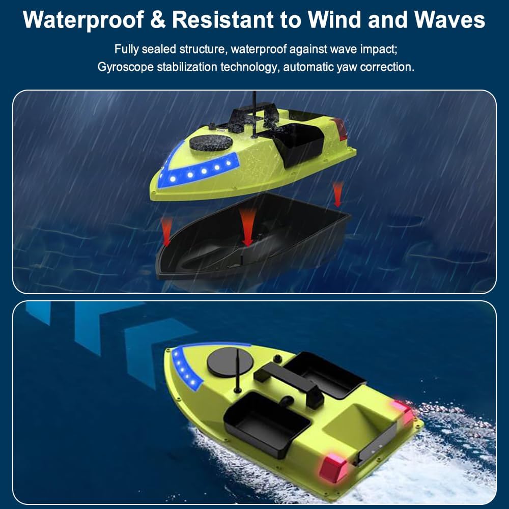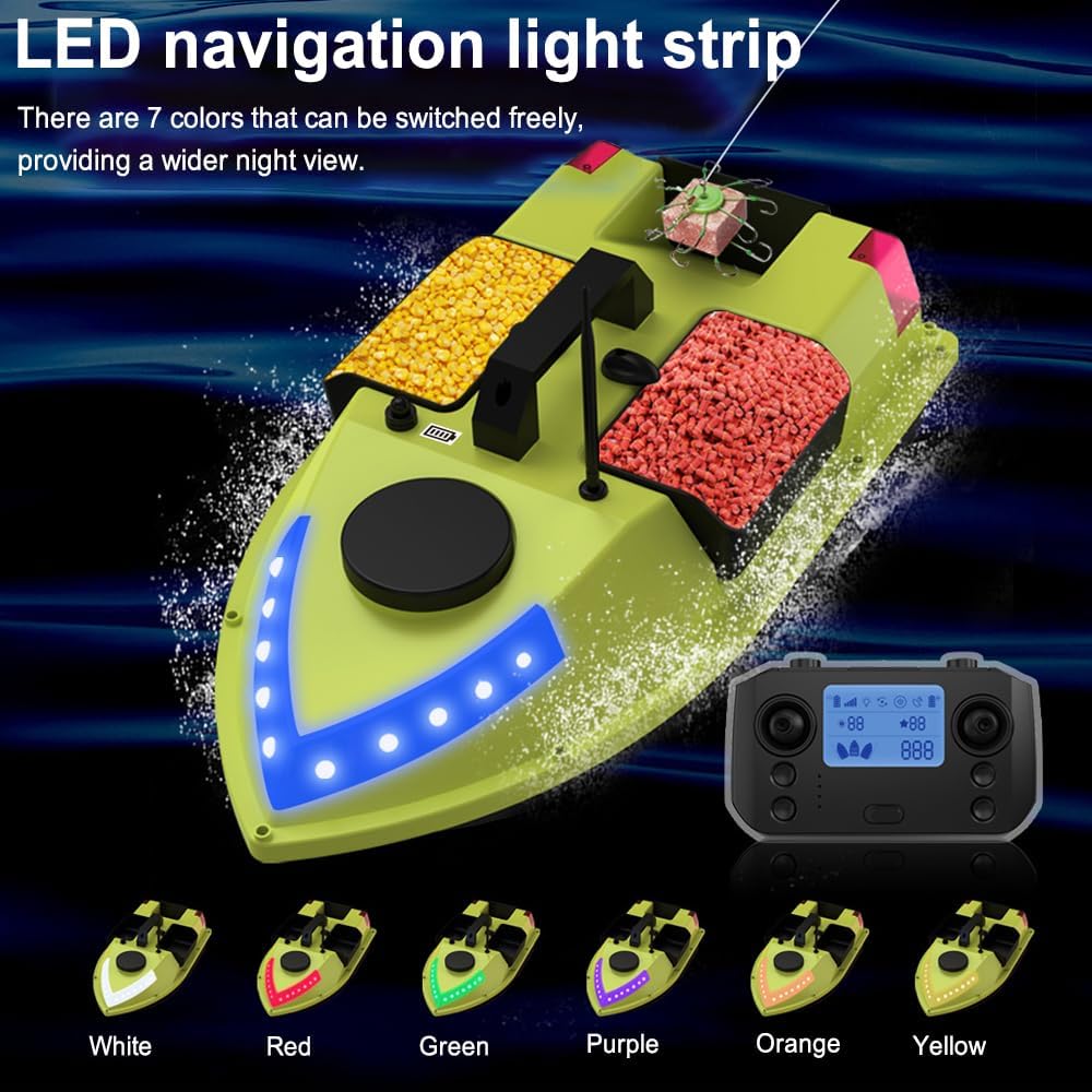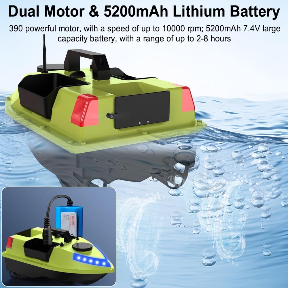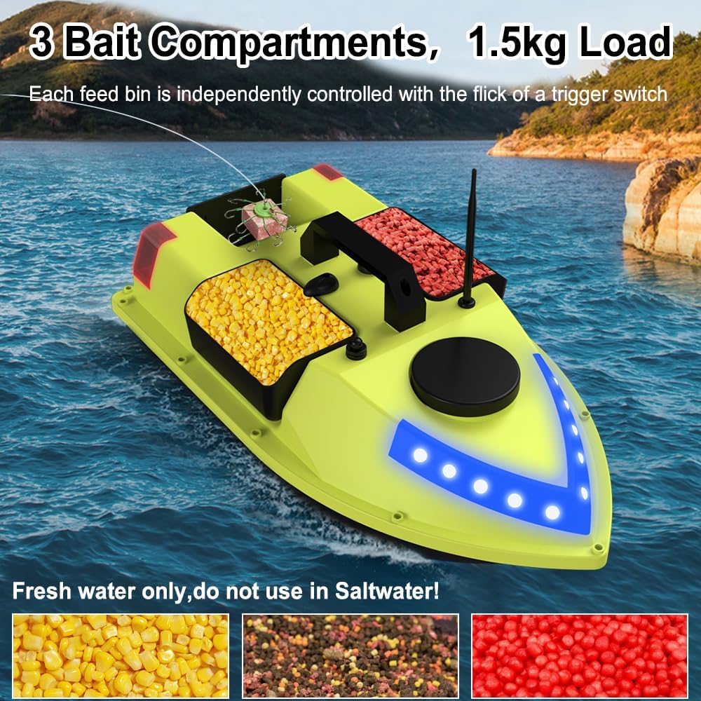 600 METRI CONTROLLO WIRELESS, CALIBRAZIONE AUTOMATICA: Il telecomando FM risolve le interferenze tra la navigazione a trasmissione multipla, il controllo wireless a lunga distanza è di circa 600M, che può colpire il nido con precisione da una lunga distanza; la barca feeder ha un sistema di bilanciamento automatico, quando la barca imbardata a causa del vento eccessivo e le onde durante il viaggio, i doppi motori controllano efficacemente la direzione di viaggio della barca per mantenerla in linea retta. LOCALIZZAZIONE GPS, RITORNO CON UN TASTO: la barca baitcasting telecomandata con GPS e sistema di posizionamento Beidou offre fino a 99 punti di pesca di localizzazione, può andare alla posizione designata con un solo tasto, il display LCD può mostrare la posizione della barca e la distanza al largo; inoltre non dovete preoccuparvi di perdere la vostra barca in acqua, quando la batteria è scarica o non c'è segnale GPS, la barca invierà un allarme e tornerà automaticamente. 3 COMPARTIMENTI INDIPENDENTI, CAPACITÀ DI CARICO DI 1,5KG: le 3 scatole per esche sono controllate in modo indipendente l'una dall'altra, evitando di rilasciare esche diverse alla volta e realizzando un posizionamento multi-punto; i compartimenti di sinistra e di destra raggiungono un buon equilibrio e stabilità, funzionando più velocemente e con prestazioni migliori, con una capacità di carico totale di circa 1,5kg. LUCE LED PER LA PESCA NOTTURNA, BATTERIA DA 5200 mAh: la luce LED per la pesca notturna è dotata di 7 colori che possono essere commutati a piacimento, il che vi aiuterà a confermare facilmente la posizione della vostra barca di notte per garantire che l'esca sia precisa; la batteria integrata da 5200 mAh ha un'autonomia più lunga e duratura, e il tempo di standby è fino a 2-8 ore. MATERIALE IMPERMEABILE, POTENZA: la barca da pesca RC è realizzata in plastica ABS di alta qualità, robusta e durevole, portatile e galleggiante; il design impermeabile a doppio motore raddoppia la potenza in uscita, la velocità del motore è fino a 10.000 giri al minuto, che può prevenire efficacemente l'interferenza dell'affondamento dell'elica, resistere a forti venti e onde enormi, e può essere utilizzato in giorni di pioggia intensa.