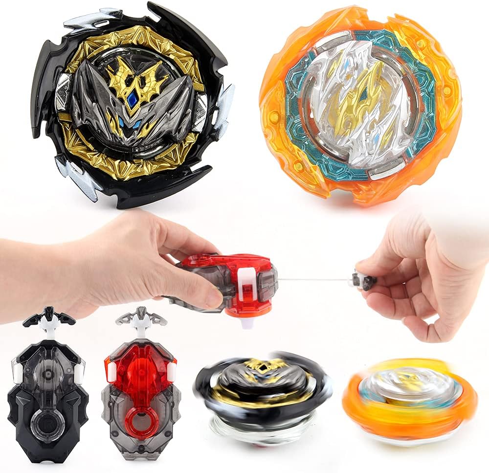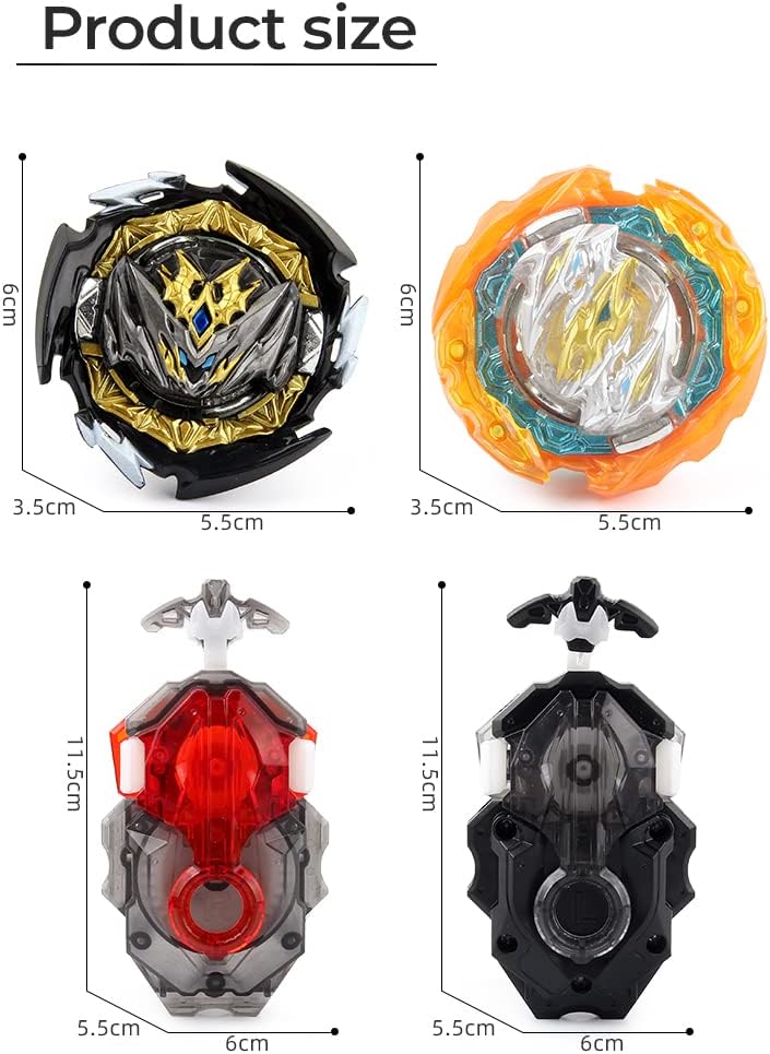 【Burst Tops】 Il set di trottole da combattimento Bey Battling Top può essere "esploso" in pezzi durante la battaglia (i tassi di esplosione variano). Esplode in una plastica di alta qualità che ha più forza d'impatto e potere distruttivo, in modo che le trottole sconfiggano l'avversario. Incluso: il set di giocattoli Gyros contiene 2 trottole e 2 lanciatori perfettamente adattati ai modelli da combattimento, in particolare in Finalmatches. Puoi provare il divertimento del combattimento nel gioco. Materiale: plastica e lega di alluminio. Il set di trottole da combattimento Bey Battling Tops è realizzato in metallo di alta qualità, robusto e non si rompe facilmente. Resistente a cadute e urti, materiale esterno in lega, resistente all'usura e durevole, design ad anello in metallo superiore, riduce l'attrito e riduce il rumore. 【Progettate la vostra trotttola 】 Il set di lanciatori di battaglia può essere assemblato secondo le proprie idee. Diversi giroscopi possono essere assemblati con diverse forze di combattimento. Ottieni subito la tua battaglia di spin top! Regalo perfetto: il set di trottole da combattimento è un ottimo gioco al chiuso. I bambini possono giocare a questo insieme ai loro genitori o amici. Goditi la felicità che ti porta. Ideale per collezioni o come regalo, Pasqua, Halloween, Natale, compleanni e Capodanno.