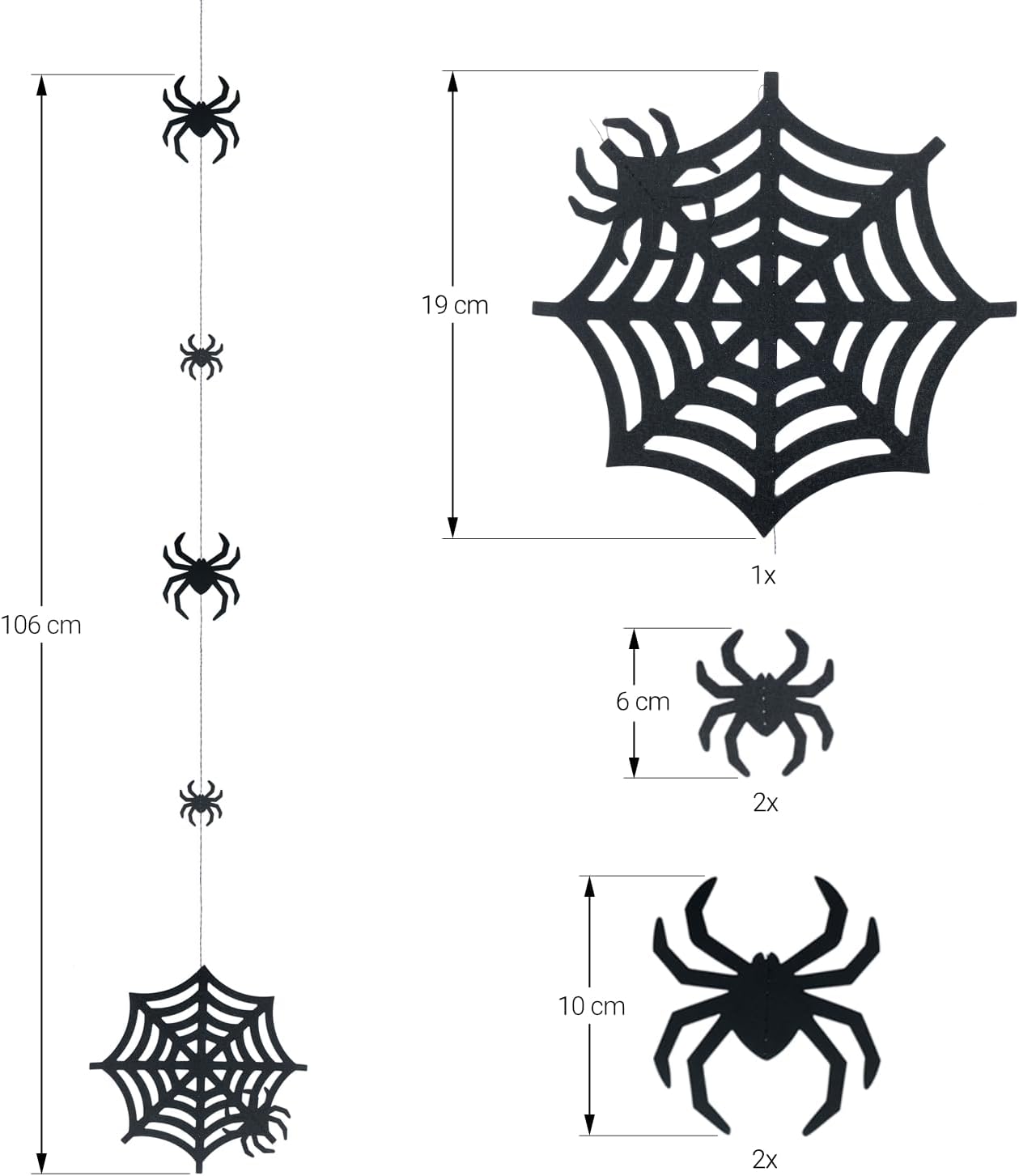 QUANTITÀ VERSATILE: Immergiti nel mondo dell'orrore con la nostra bellissima ghirlanda sospesa al soffitto, che include 2 impressionanti ragni grandi, 2 graziosi ragni piccoli e una ragnatela con ragno. La tua prossima festa sarà un'esperienza indimenticabile con questa decorazione sospesa! Eleganza in nero e glitter: la nostra ghirlanda mozzafiato è in un colore nero intenso e in parte decorata con glitter magici che brillano in qualsiasi fonte di luce. Materiale: cartone Dimensioni variabili per il massimo effetto: con 2 diverse dimensioni di ragno da 6 cm, 10 cm e un'impressionante ragnatela da 19 cm, questa ghirlanda attirerà sicuramente l'attenzione. Uso creativo: aggiungi un tocco unico alla tua festa di Halloween, a un evento spettrale o a qualsiasi evento ispirato all'orrore con questa ghirlanda appendiabiti da soffitto. Appendili, posizionali sopra il buffet, usali come sfondo da fotografare o appendili alla finestra come decorazioni per finestre.