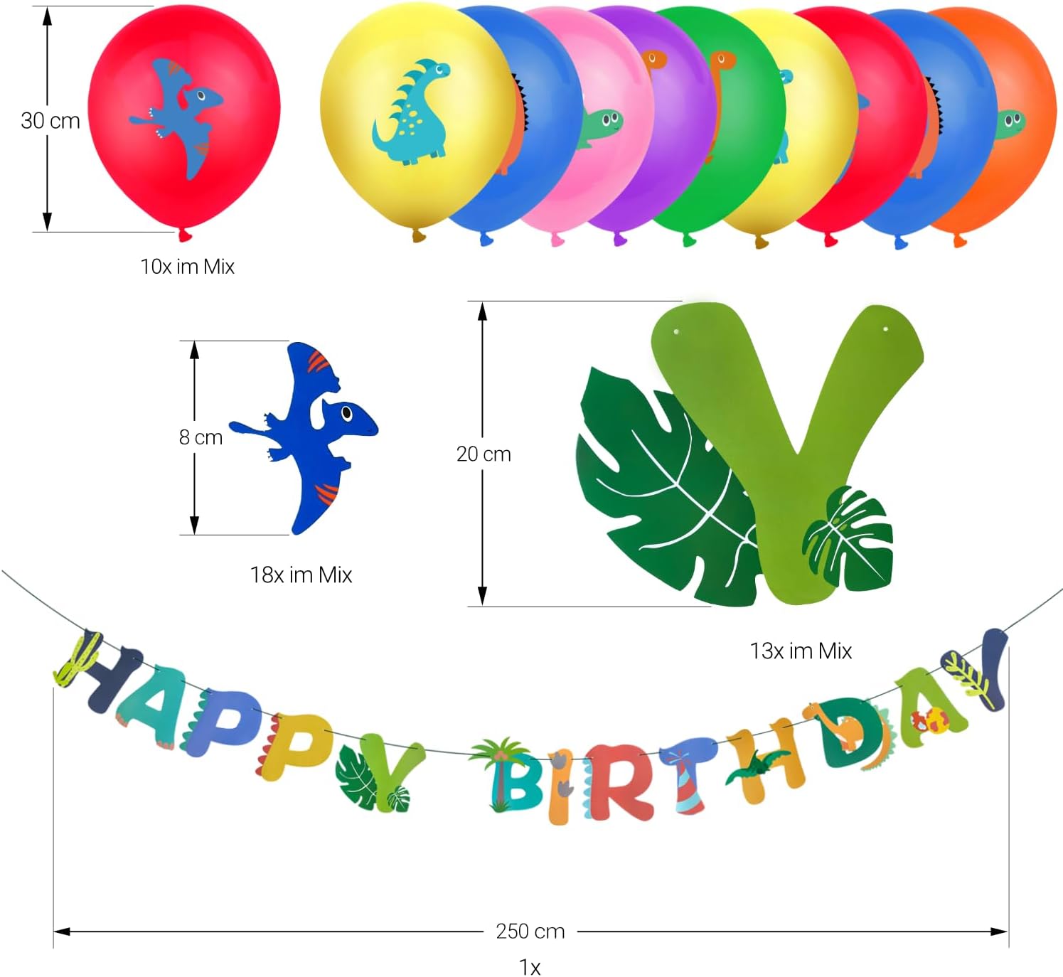Quantità: 1x fantastica ghirlanda di buon compleanno con motivi di dinosauri; 10 fantastici palloncini con motivi di dinosauri (blu, rosso, giallo, rosa, viola, arancione, verde in un mix); 18 pezzi di coriandoli colorati di dinosauro: ogni dinosauro è disponibile 2x, 2x uova di dinosauro e 2x palme. Colore: colorato; Materiale: carta, cartone, 100% plastica. La ghirlanda è lunga 2,50 me ogni lettera misura ca. 20 cm di altezza, ogni palloncino ha un diametro di ca. 25-30 cm e i coriandoli sono ca. 8 centimetri di dimensione. Bellissimo e ampio set di decorazioni: perfetto come decorazione per feste di dinosauri e compleanni di bambini