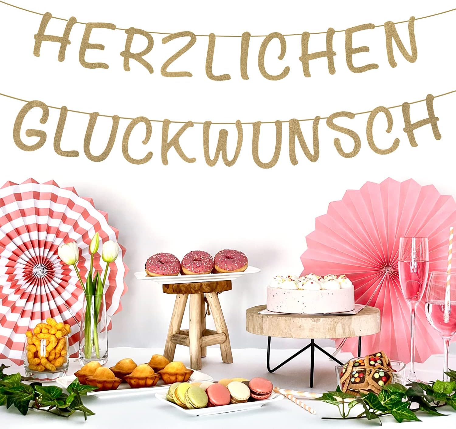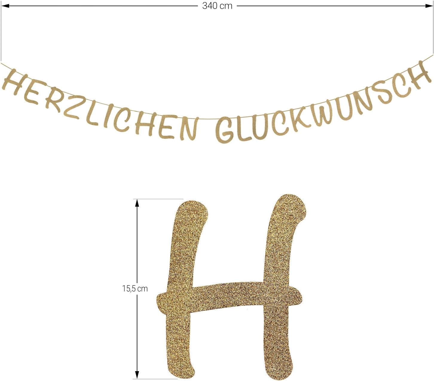 Quantità: 1 bellissima ghirlanda di congratulazioni scintillante di ottima qualità Colore: oro; Materiale: cartone La ghirlanda è di ca. 3,40 m di lunghezza, le lettere misurano ca. 15,5 cm di altezza e da 2 cm a 13 cm di larghezza. Decorazione bella, elegante ed elegante per occasioni come compleanni, compleanni di bambini, anniversari, matrimoni, nozze d'argento, nozze d'oro e molte altre occasioni