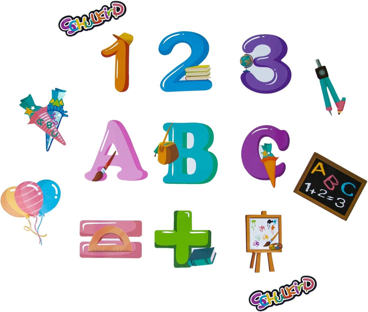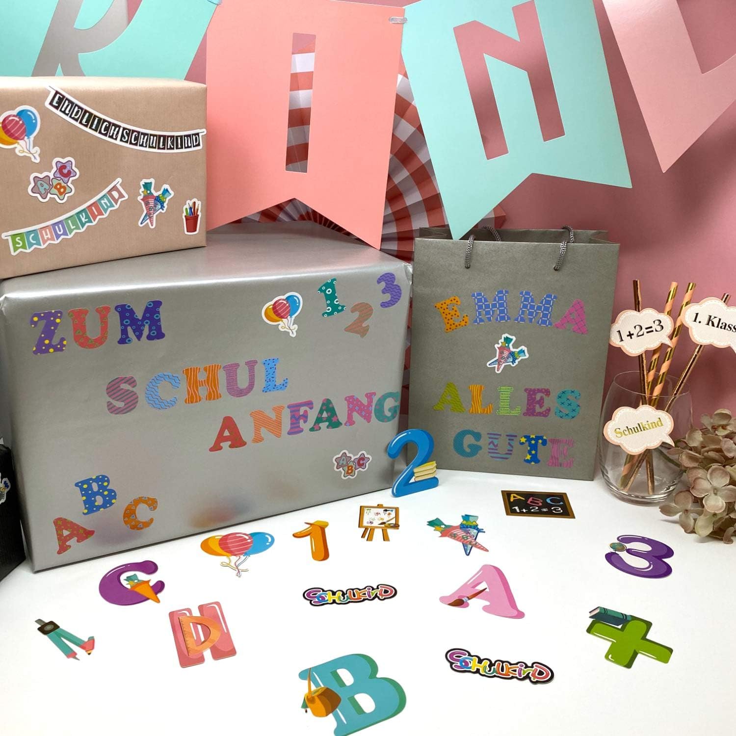 1x bellissima e colorata ghirlanda "bambino in età scolare"; 10 simpatici palloncini in un mix di colori con motivi ABC, 1+2=3, penne e caramelle (2x gialli, 2x verdi, 2x blu, 2x viola); 15 bellissimi coriandoli colorati per le presentazioni a scuola con motivi come 1, 2, 3, bustine di zucchero, palloncini e molto altro ancora. Materiale: cartone, plastica La ghirlanda ha una lunghezza di ca. 1,8 m, ogni lettera misura ca. 16 cm x 20 cm, ogni palloncino ha una circonferenza di ca. 70 cm e i coriandoli sono tra ca. 2 cm - 5,5 cm di larghezza e ca. 5 cm di altezza. Bellissimo ed ampio set decorativo con molti contenuti - perfetto come decorazione per l'introduzione alla scuola o l'inizio della scuola per ragazze e ragazzi