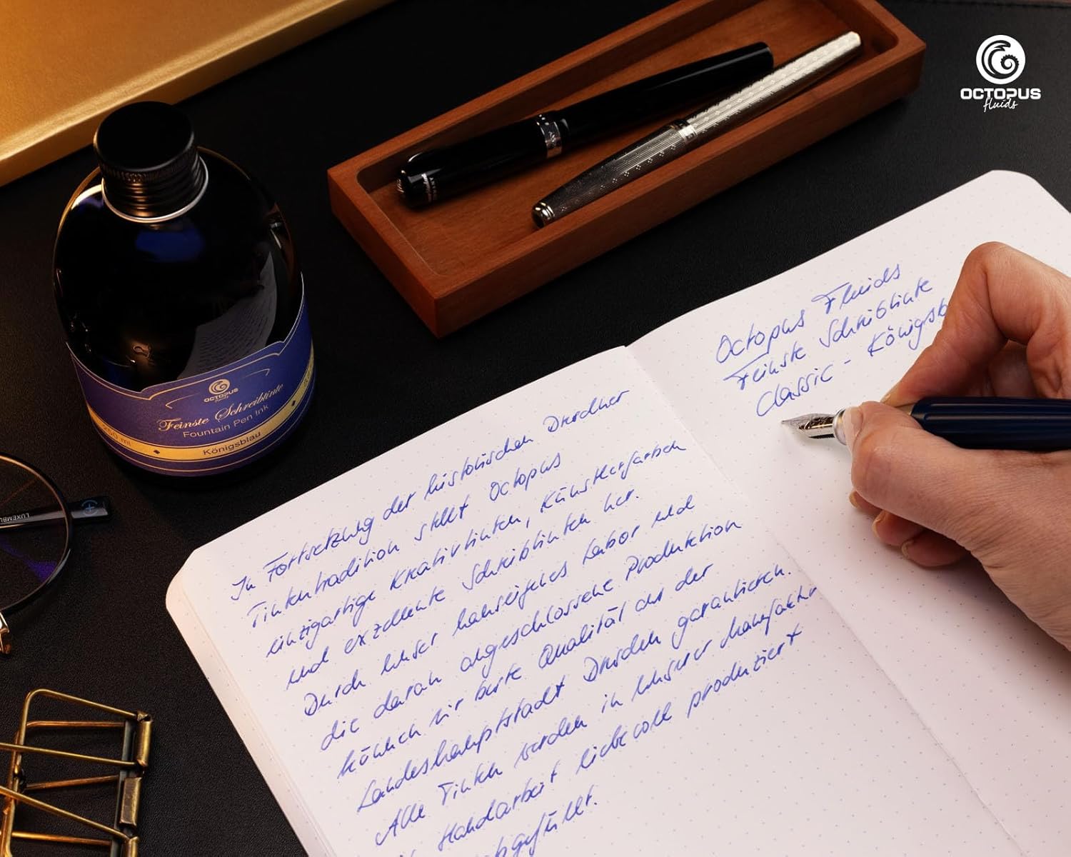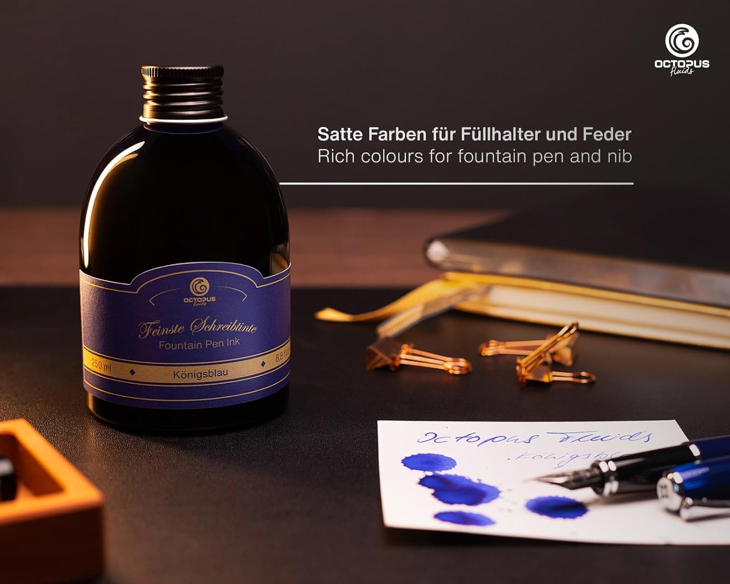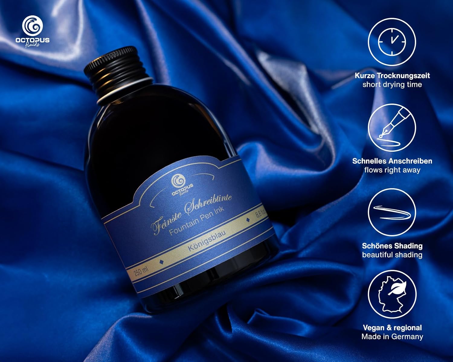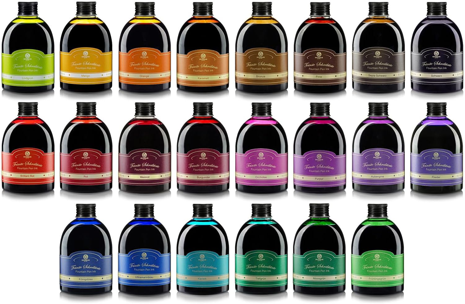 Ampia gamma di colori: scopri la ricca selezione di inchiostri Octopus in colori brillanti per un'esperienza di scrittura squisita. Dimensioni pratiche: scegli tra il classico flacone di inchiostro in vetro da 30 ml o l'elegante flacone di ricarica PET da 250 ml per mantenere la tua penna stilografica sempre pronta all'uso. Facile da usare: con pratico convertitore per ricaricare facilmente l'inchiostro. Evitate le cartucce di inchiostro tradizionali. Con il nostro convertitore di inchiostro, la vostra penna stilografica standard funziona come una classica penna stilografica a stantuffo. Qualità unica: goditi un'elevata brillantezza dei colori, caratteri nitidi e fluidità ad ogni tratto di penna. Il flusso di inchiostro uniforme e la splendida sfumatura degli inchiostri Octopus conferiscono alla tua scrittura una profondità ed estetica particolari. Qualità Made in Germany: affidati alla qualità degli inchiostri Octopus, prodotti dal produttore di inchiostri Octopus Fluids a Dresda.