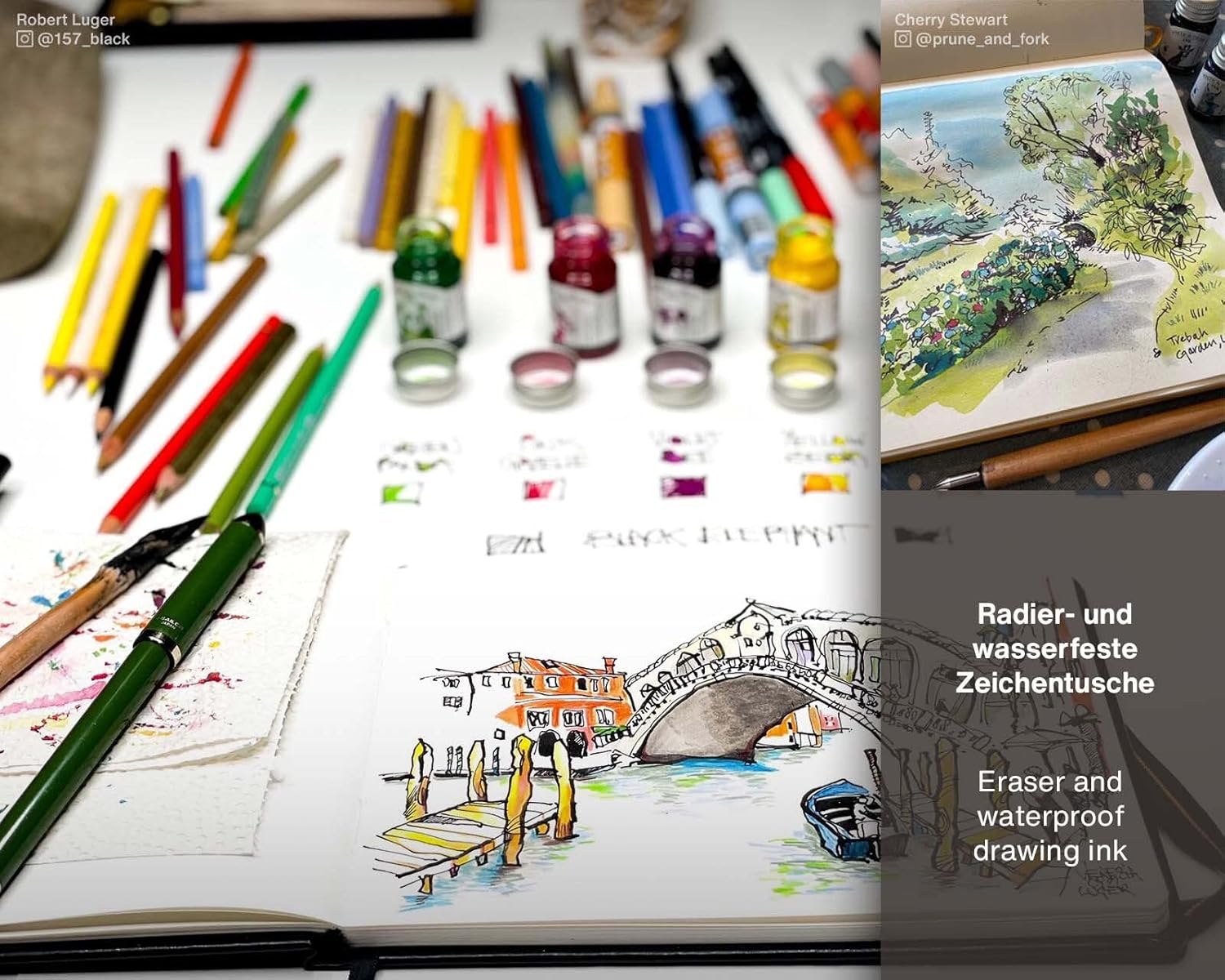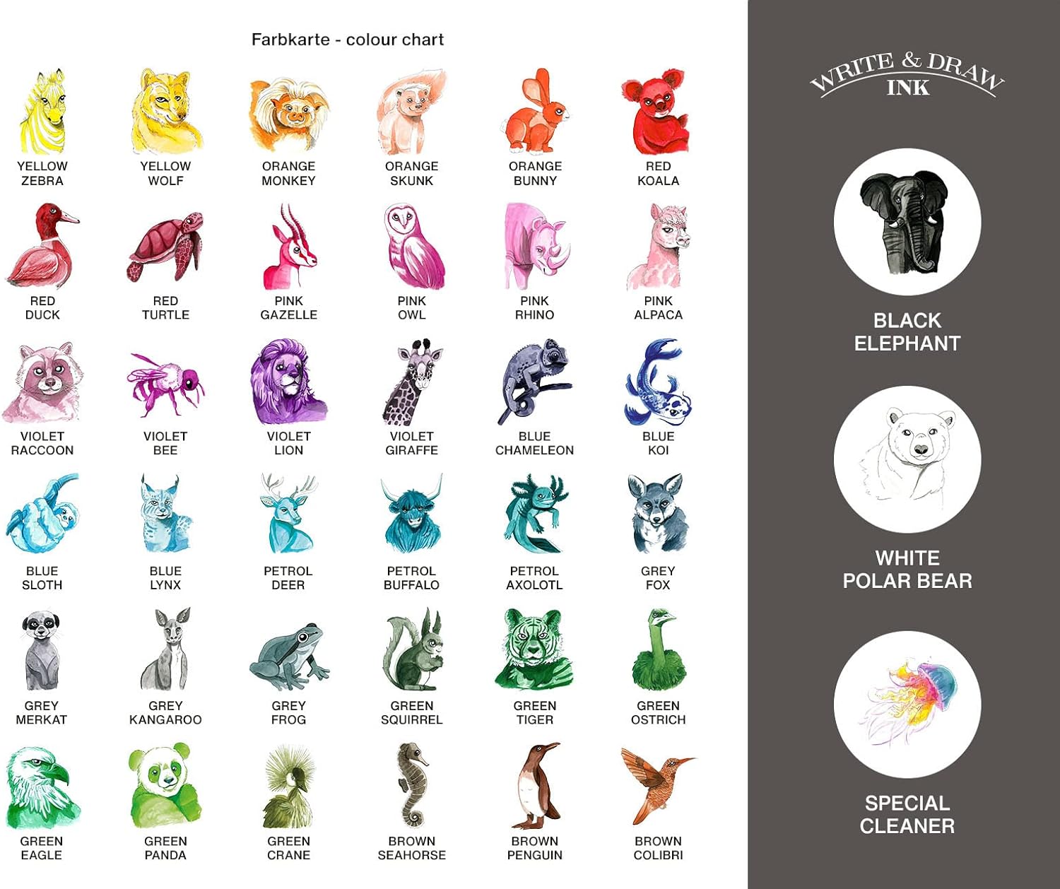 INCHIOSTRO IMPERMEABILE per scrivere, disegnare e colorare. Adatto per penne stilografiche, pennini in vetro, penne calligrafiche, pennelli o penne a pennello. Perfetto per artisti, calligrafi, scrittori abituali, artisti di Urban Sketching, artisti grafici, architetti e designer. Intermiscelabile, diluibile e a prova di cancellatura. 72 COLORI BRILLANTI ad alta luminosità, tra cui un bianco opaco per sfondi scuri e un nero particolarmente intenso per disegnare contorni precisi o linee sottili. L'inchiostro da disegno si asciuga in un attimo e può essere colorato con acquerelli o con un'altra tonalità di inchiostro da disegno Write and Draw. I PIGMENTI PIÙ PREGIATI garantiscono un'elevata resistenza alla luce e assicurano un buon flusso d'inchiostro e un carattere nitido. L'inchiostro da disegno soddisfa i requisiti dell'inchiostro resistente ai documenti secondo le norme DIN ISO 12757-2 e DIN ISO 14145-2 ed è vegano. ADATTI ALLE PENNE STILOGRAFICHE, in quanto realizzati senza gommalacca. Se non si lascia asciugare la stilografica, lo strumento di scrittura può essere pulito con acqua calda. Per una pulizia intensiva, si consiglia il detergente speciale Write & Draw. MADE IN GERMANY: sviluppato e prodotto nel laboratorio del produttore di inchiostri Octopus Fluids GmbH & Co. KG con sede a Dresda.