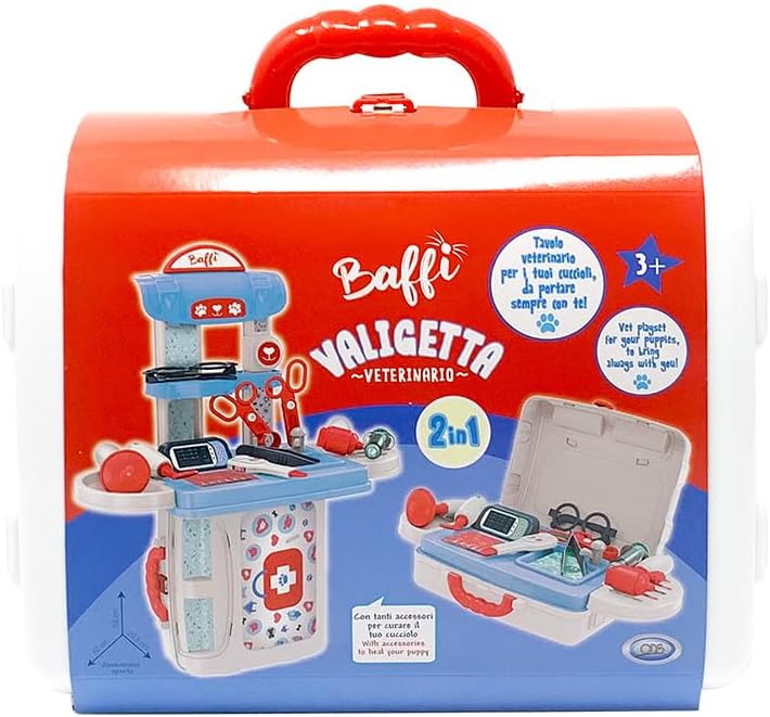 Valigia trasformabile per animali: da normale valigia veterinaria a playset completo con tavolino e accessori per la cura del cucciolo. DIMENSIONI: Prodotto chiuso 25,5 x 23 x 10,5 cm, assemblato 42 x 53 x 20,5 cm ACCESSORI COMPLETI: Include tutti gli accessori necessari per prendersi cura del cucciolo e stimolare la fantasia e l'empatia verso gli animali. IDEA REGALO PERFETTA: ottimo regalo per tutti gli amanti degli animali e per i bambini dai 3 anni in su, stimola l'immaginazione e l'interazione attraverso il gioco di ruolo con il cucciolo e gli strumenti veterinari. BAFFI: perfetti per i piccoli fan, i set baffi uniscono divertimento e apprendimento con cuccioli e accessori a sorpresa.