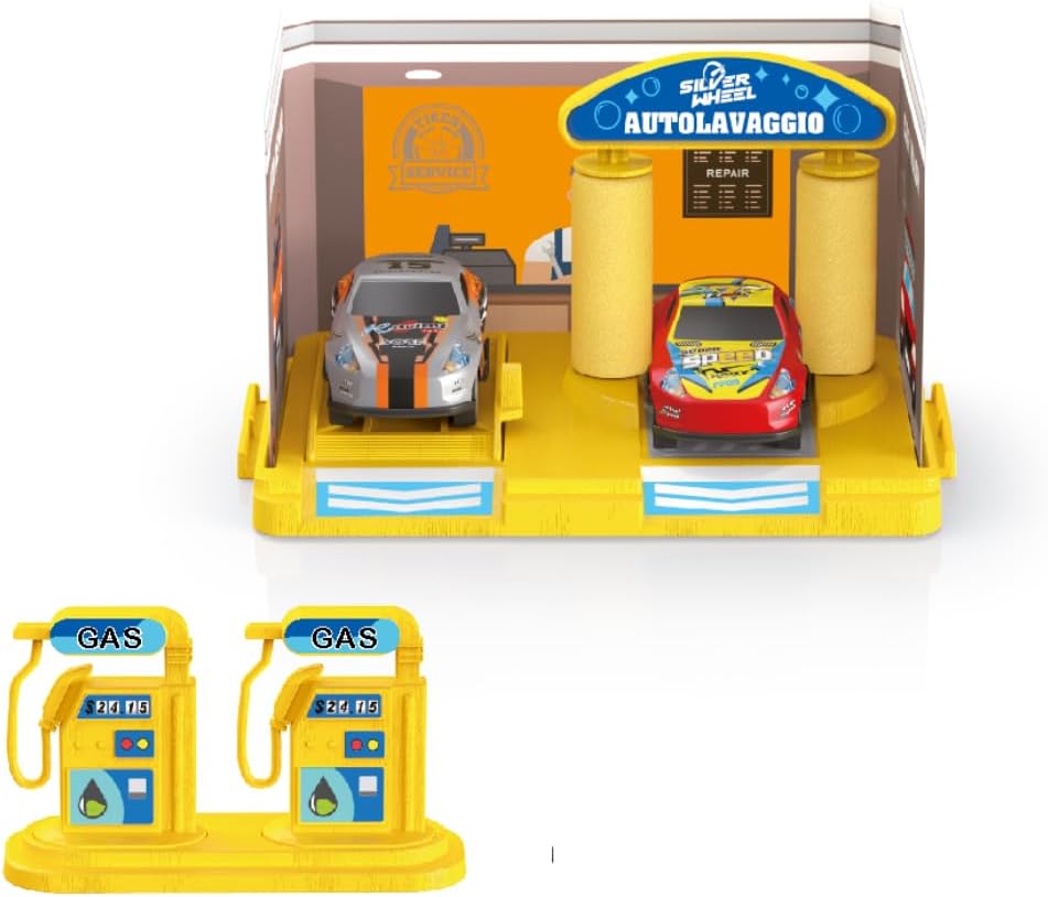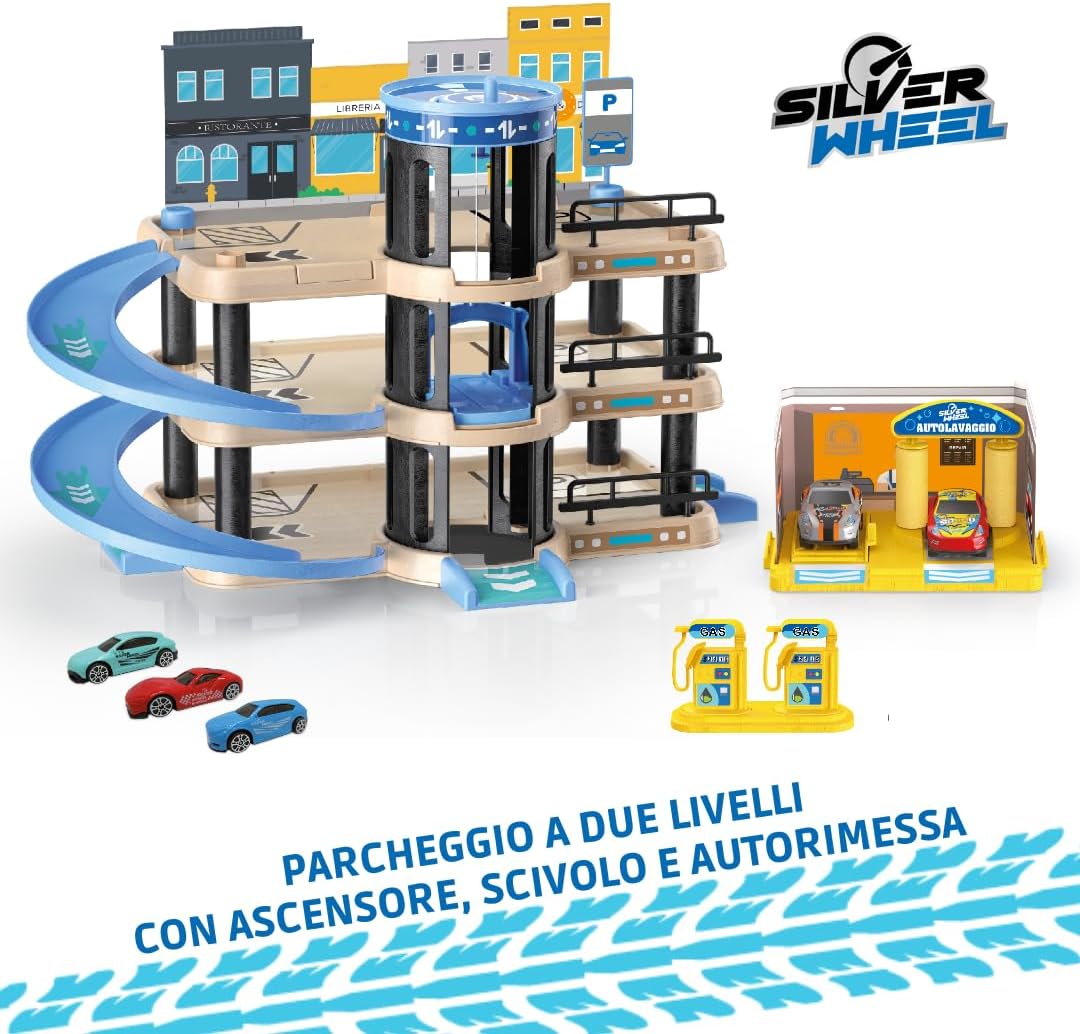 PARCHEGGIO MULTILIVELLO: Il playset ODS Silver Wheel è composto da un parcheggio multilivello con tre piani, completo di ascensore, scivolo circolare e autolavaggio. DIVERTIMENTO ASSICURATO: Questo set include 3 auto die-cast con ruote libere, perfetto per i bambini dai 3 anni in su. Stimola l'immaginazione e la creatività. CONTENUTO DELLA CONFEZIONE: La confezione include un parcheggio multilivello con dimensioni di 41 x 27 x 25 cm, un ascensore, uno scivolo circolare, un autolavaggio e tre auto a ruote libere. Un set completo per ore di gioco. IDEA REGALO: I giocattoli ODS Silver Wheel sono un'ottima scelta per i bambini dai 3 anni in su. Con camion, auto e playset interattivi, offrono ore di divertimento e stimolano la creatività. SILVER WHEEL: Avventure on the road! Una vasta gamma di auto in diecast, camion a ruote libere e playset componibili, tutti da collezionare!