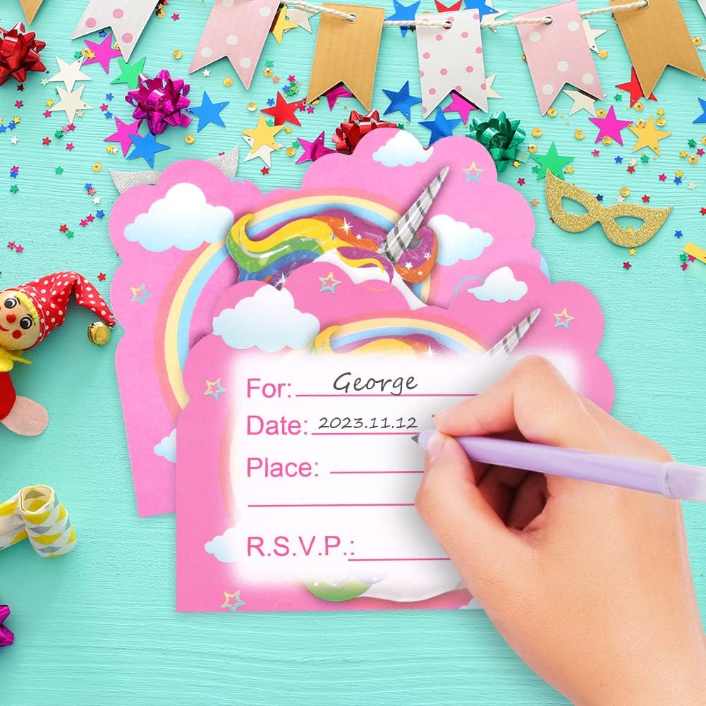✉ 【Elenco dei pacchetti】 Riceverai 12 biglietti d'invito per una festa con unicorno più 12 buste, le buste colorate proteggono anche le tue carte e possono anche essere spedite per posta, sufficienti per la tua festa con unicorno. ✉ 【Design unico】 Con graziosi unicorni e colori da sogno, questi biglietti d'invito per unicorno sono progettati in modo unico con diverse paillettes scintillanti sull'invito, ogni ragazza lo adorerà! ✉【Buona qualità】I nostri biglietti d'invito per il compleanno dei bambini sono realizzati in carta patinata di alta qualità, stampati su entrambi i lati, con graziosi unicorni sul davanti e bellissimi arcobaleni sul retro, che non sbiadiscono né si rompono facilmente. ✉【Formato migliore】Gli inviti alle feste per bambini offrono spazio per tutti i messaggi importanti, possono essere scritti con tutte le penne normali, sono ricordi d'infanzia per ogni amico. ✉【Multifunzione】Questi biglietti d'invito sono perfetti per compleanni di bambini, feste in giardino, feste in piscina, feste estive, feste di ritorno a casa, feste a tema e altro ancora.